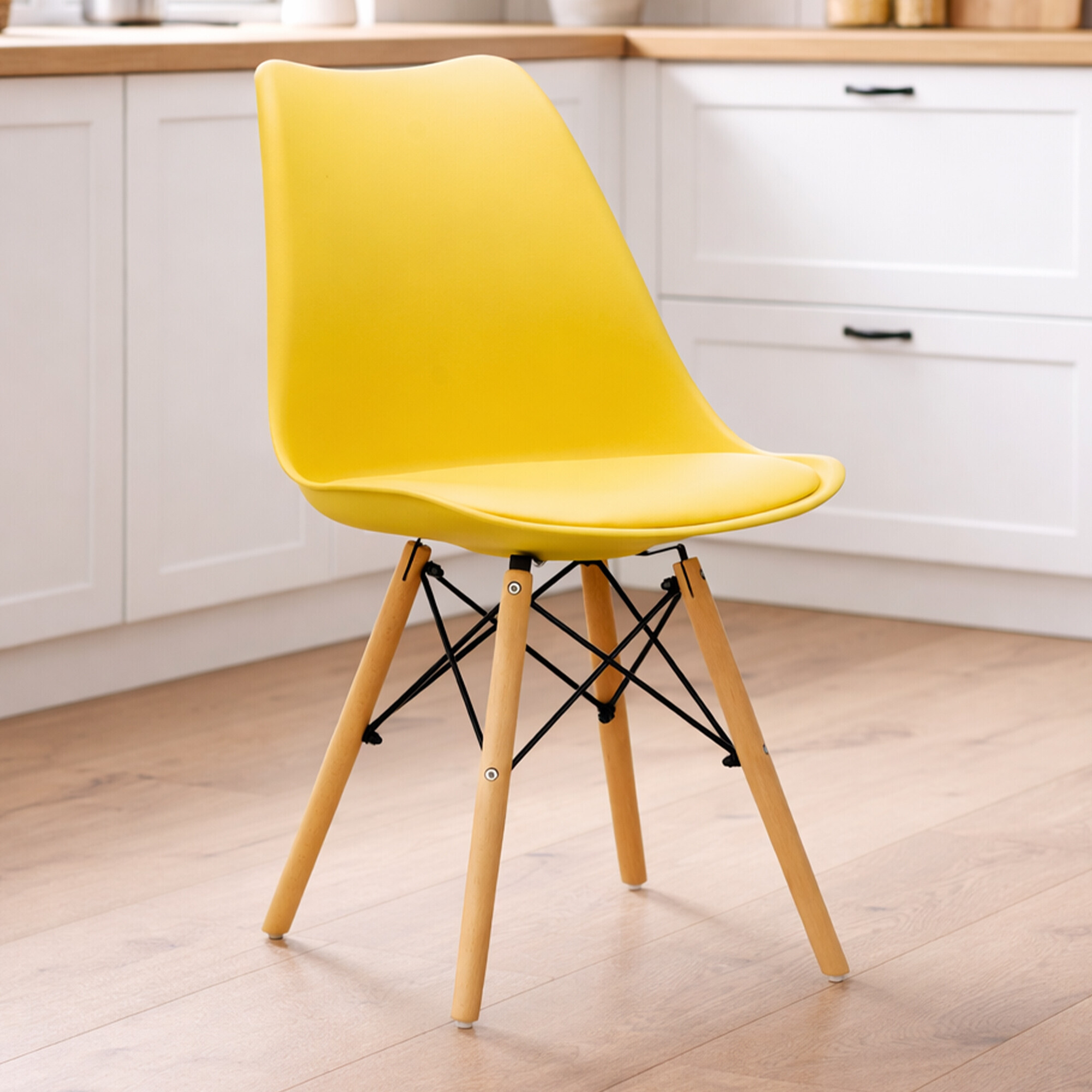 Židle je vyrobena z kvalitního a odolného polypropylenu s polštářem v potahu umělé kůže v kombinaci podnože z bukového dřeva.