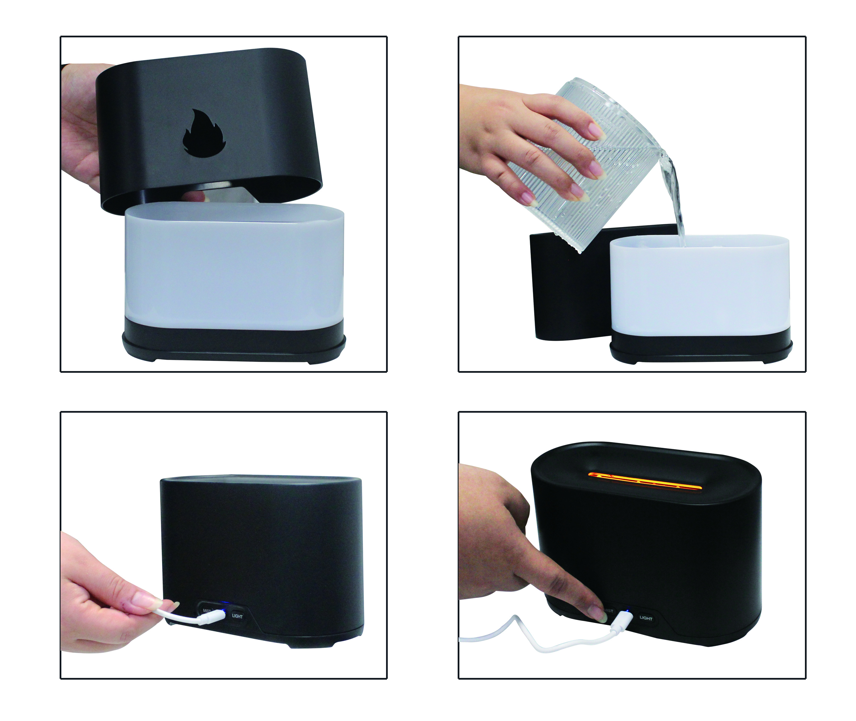 Podsvícení páry vycházející z difuzéru vytváří iluzi ohně a hodí se tak jako stylový doplněk interiéru, který navíc zvládne celý prostor osvítit příjemným světlem.