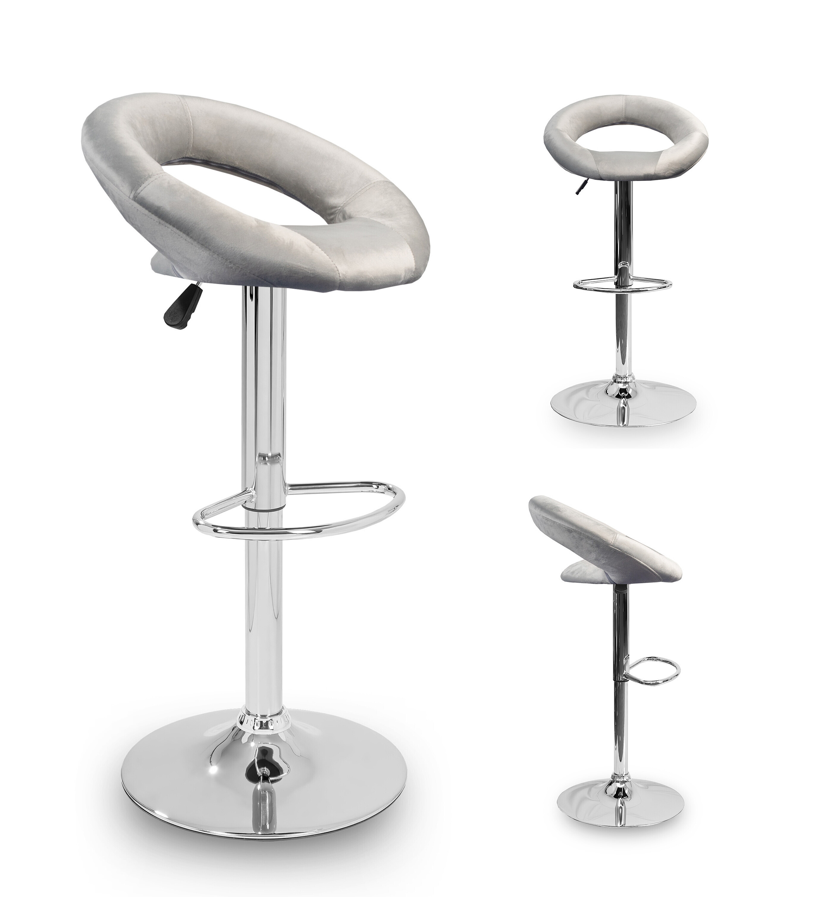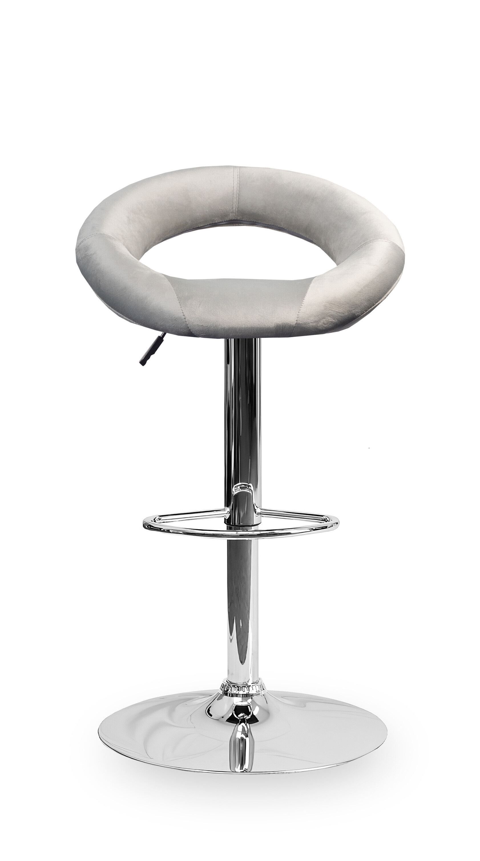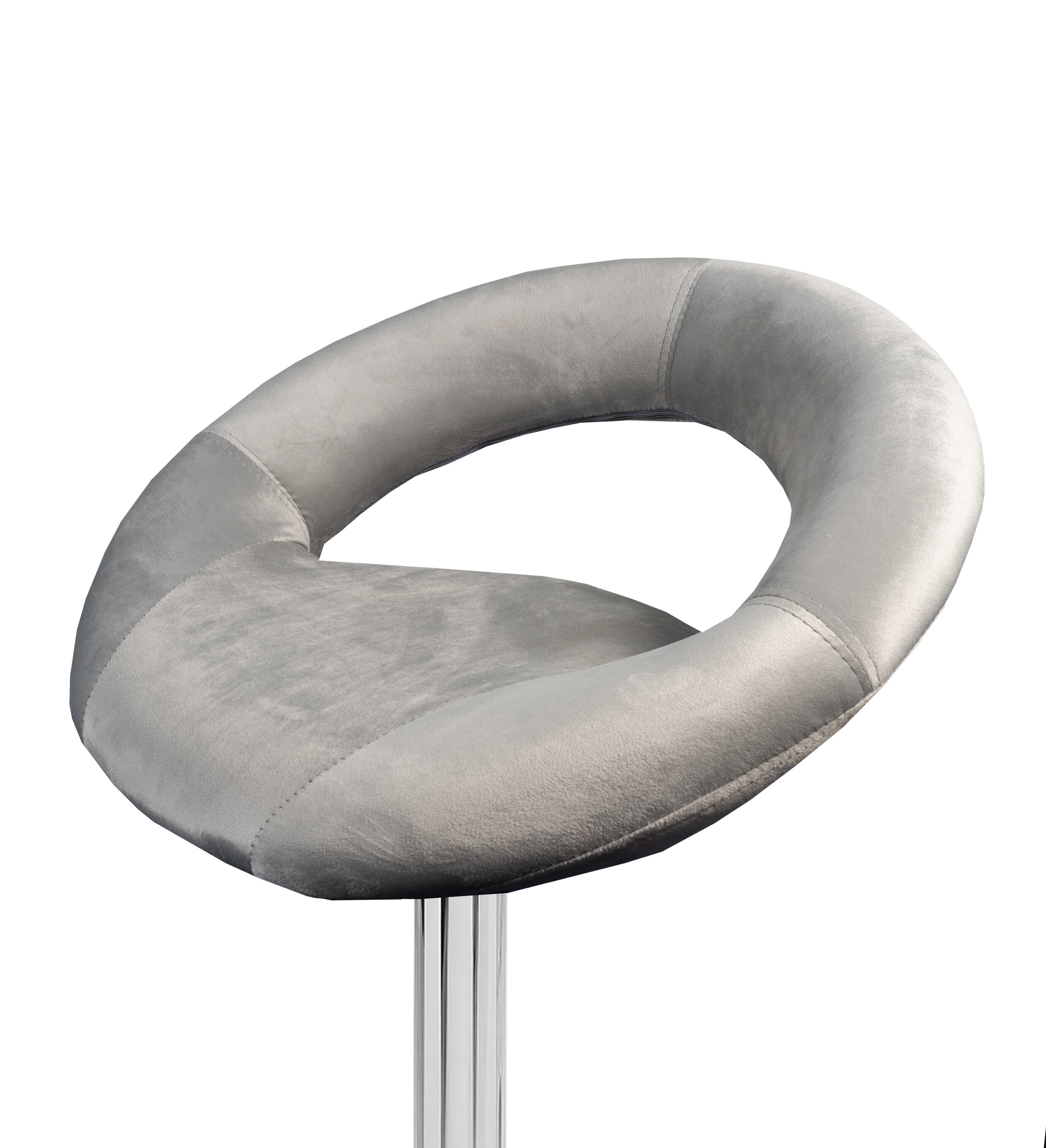 Židle vyniká kruhovými tvary, kruhový sedák spojený s kruhovým opěrákem. Povrch sedací části barové židle je ze sametu.