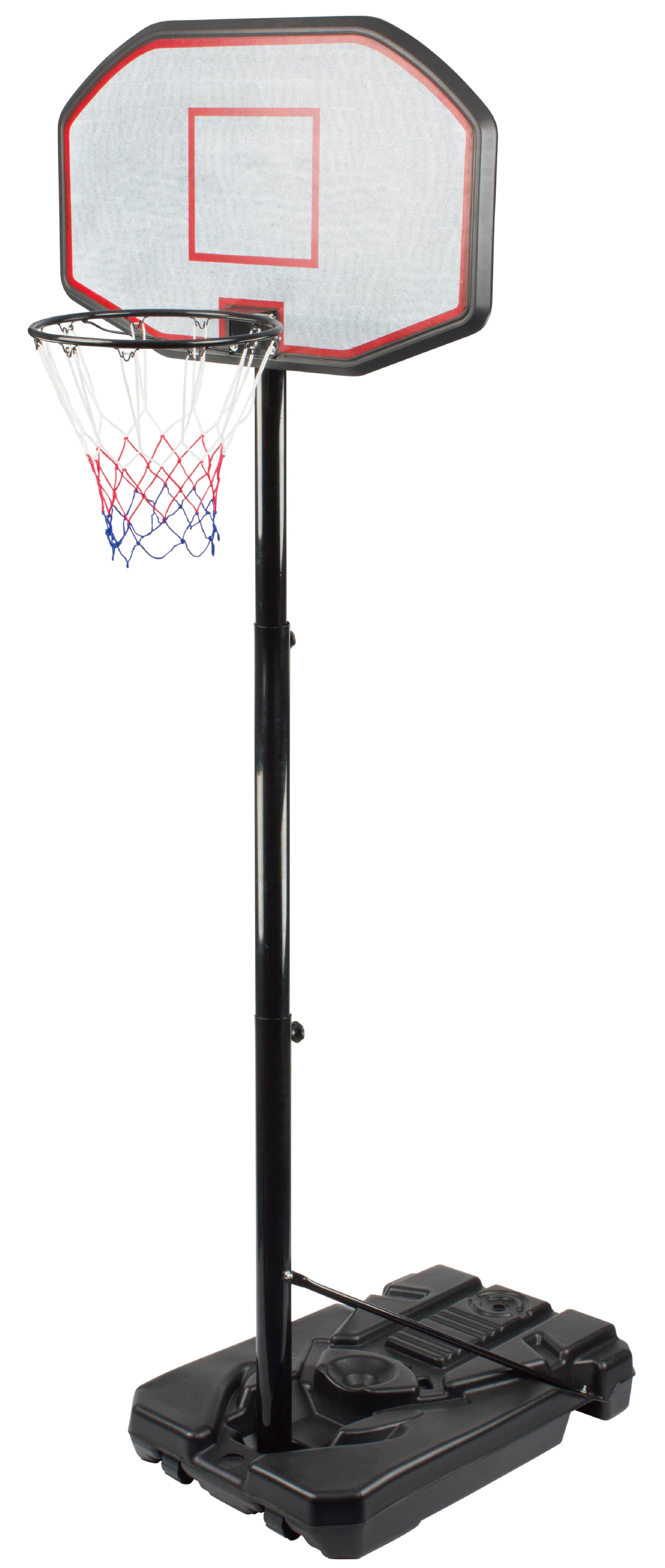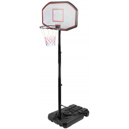 Mobilní basketbalový koš s nastavitelnou výškou, pevnou plastovou deskou a obroučkou se sítí.