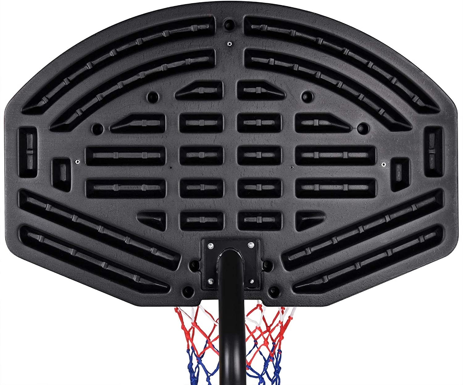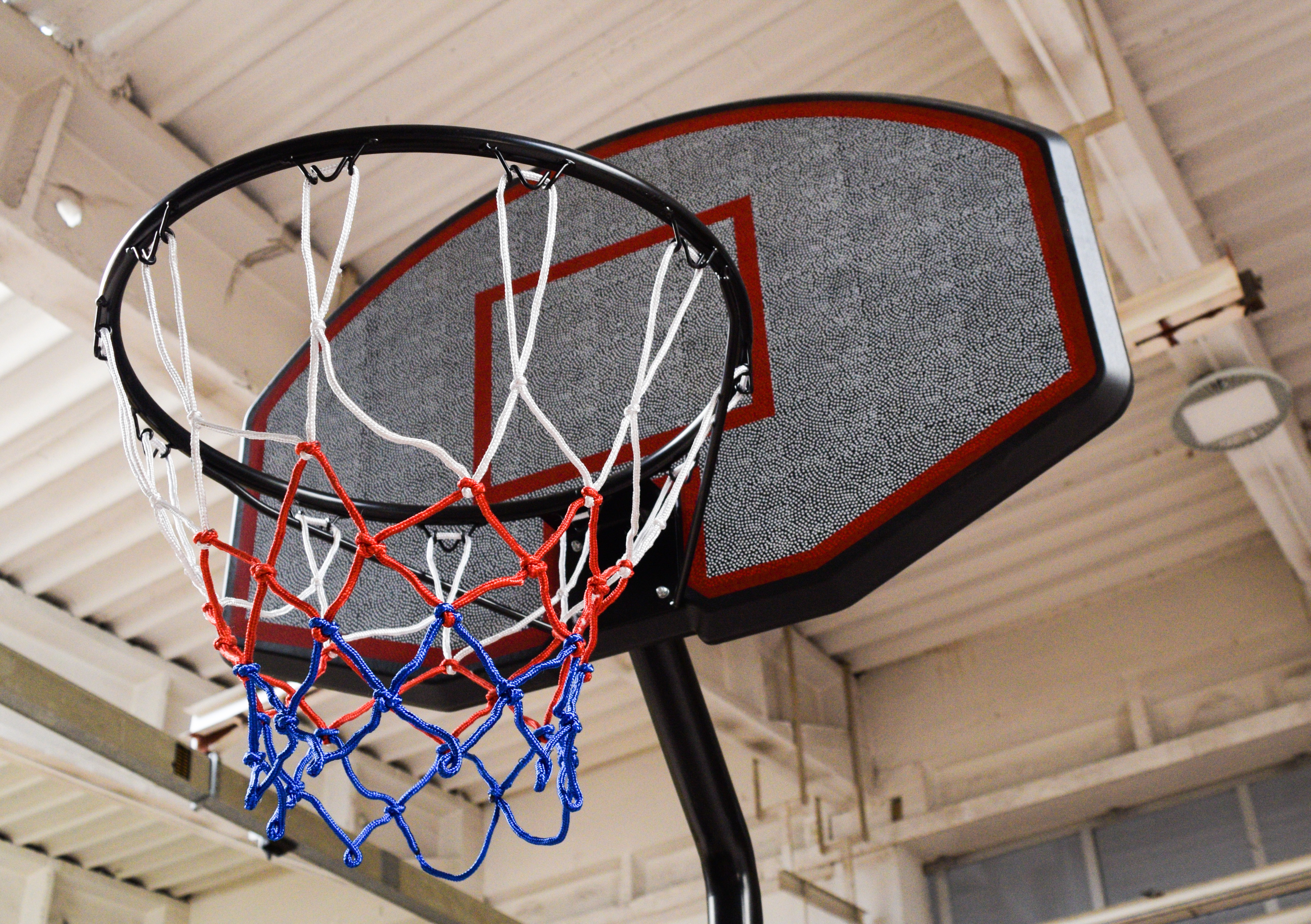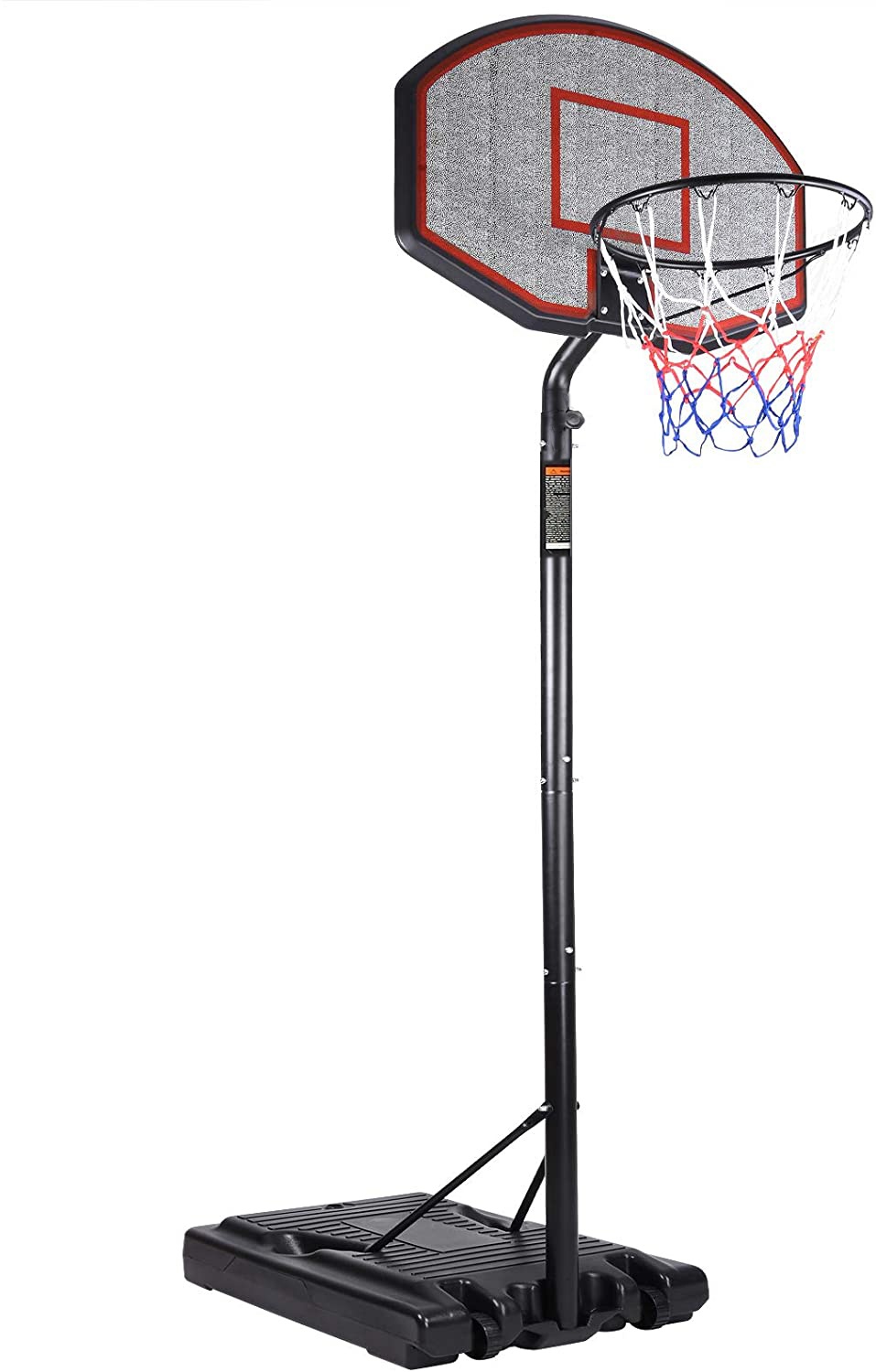 Mobilní basketbalový koš s nastavitelnou výškou, pevnou plastovou deskou a obroučkou se sítí.