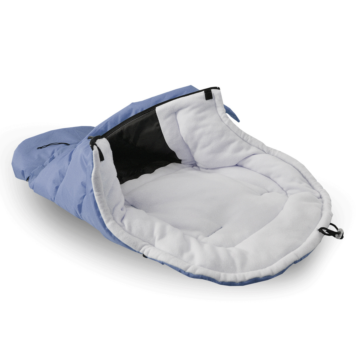 Dětský fusak má rozepínací zip, otvory na 5-bodové bezpečnostní pásy a gumové úchytky umožňující připevnění ke kočárku.