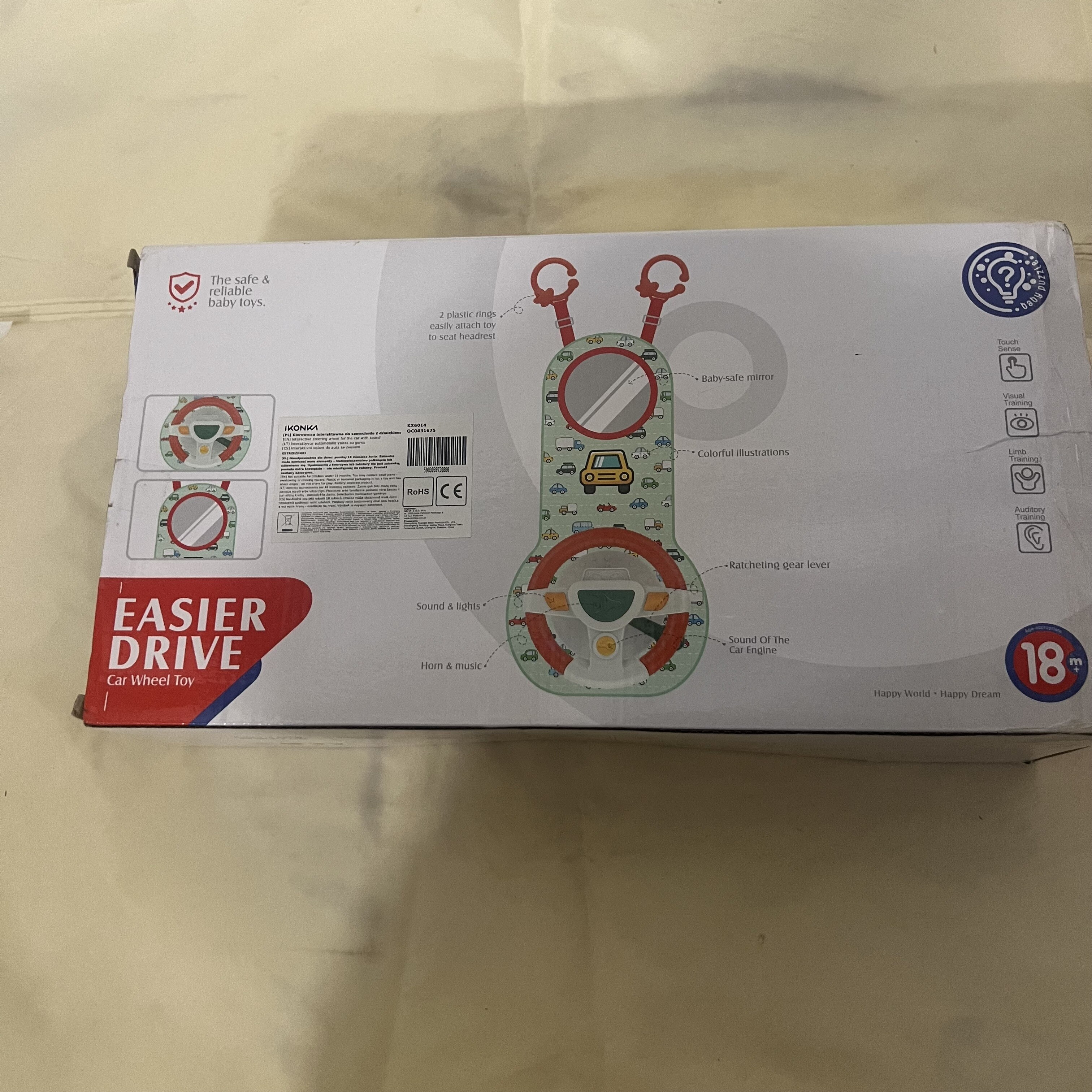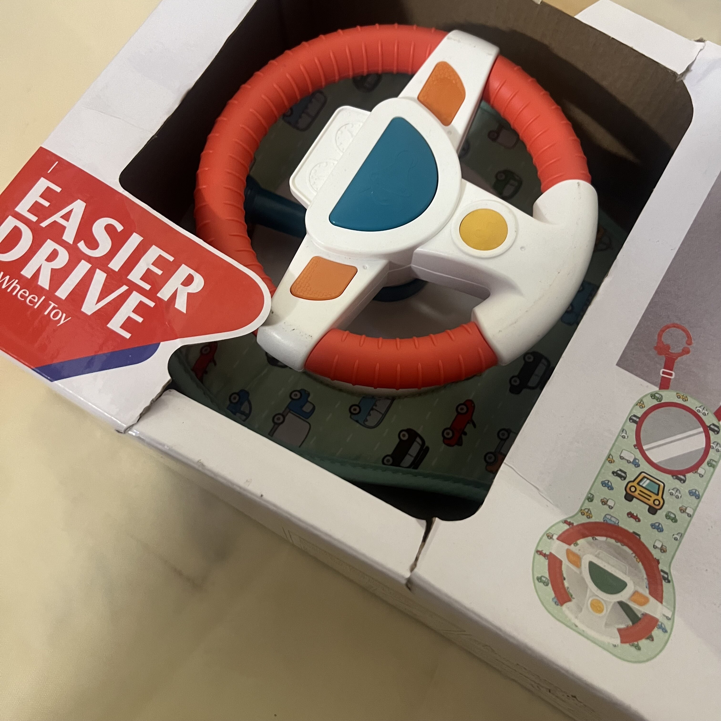 Rozjívené nebo plačící dítě na zadním sedadle je pro řidiče vozidla velkým stresem. Máme pro vás řešení, které vašemu batoleti zpříjemní cestu a zajistí hladkou jízdu. Interaktivní volant je typ manipulační desky, která úspěšně zaměstná malé ruce po celou dobu jízdy. Skládá se z volantu se 4 tlačítky, senzorické rukojeti a plastového bezpečnostního zrcátka. Kusy jsou umístěny na pevné podložce potažené příjemnou látkou s motivem autíček.