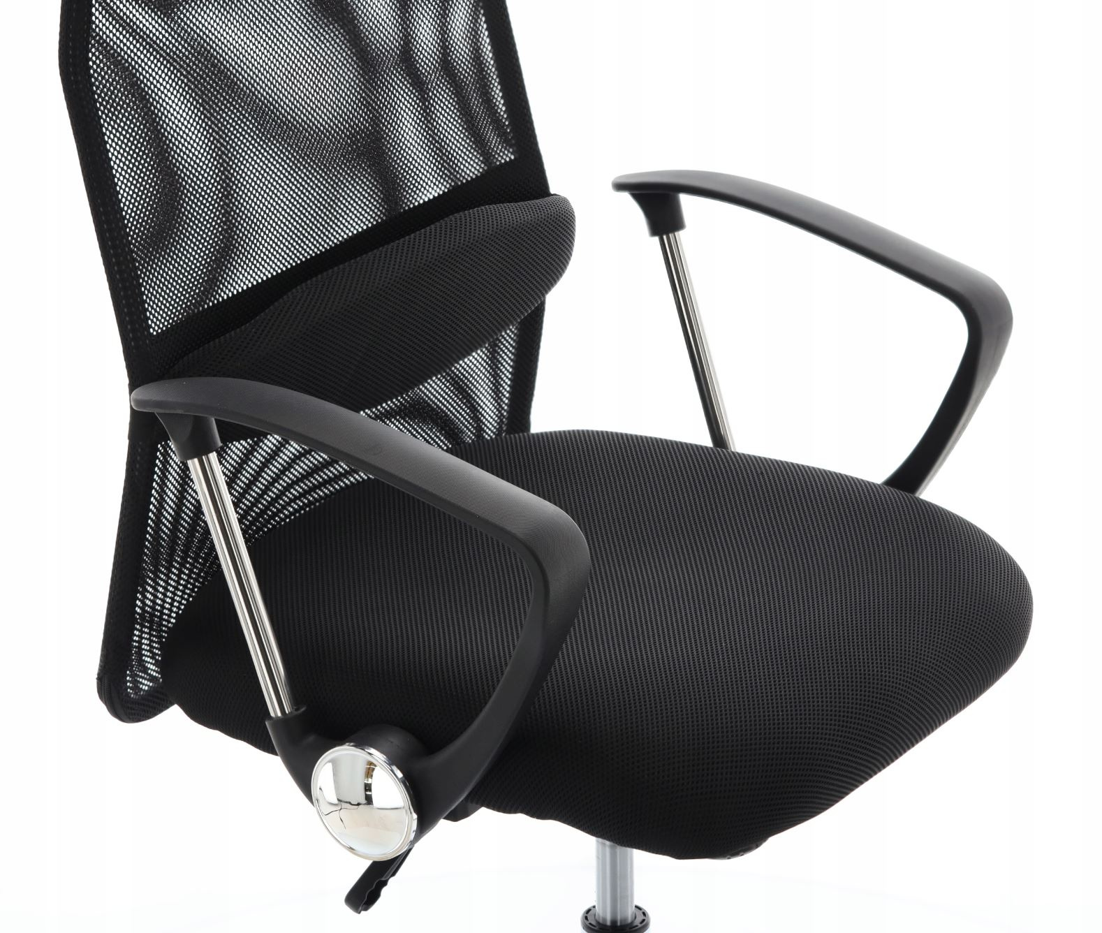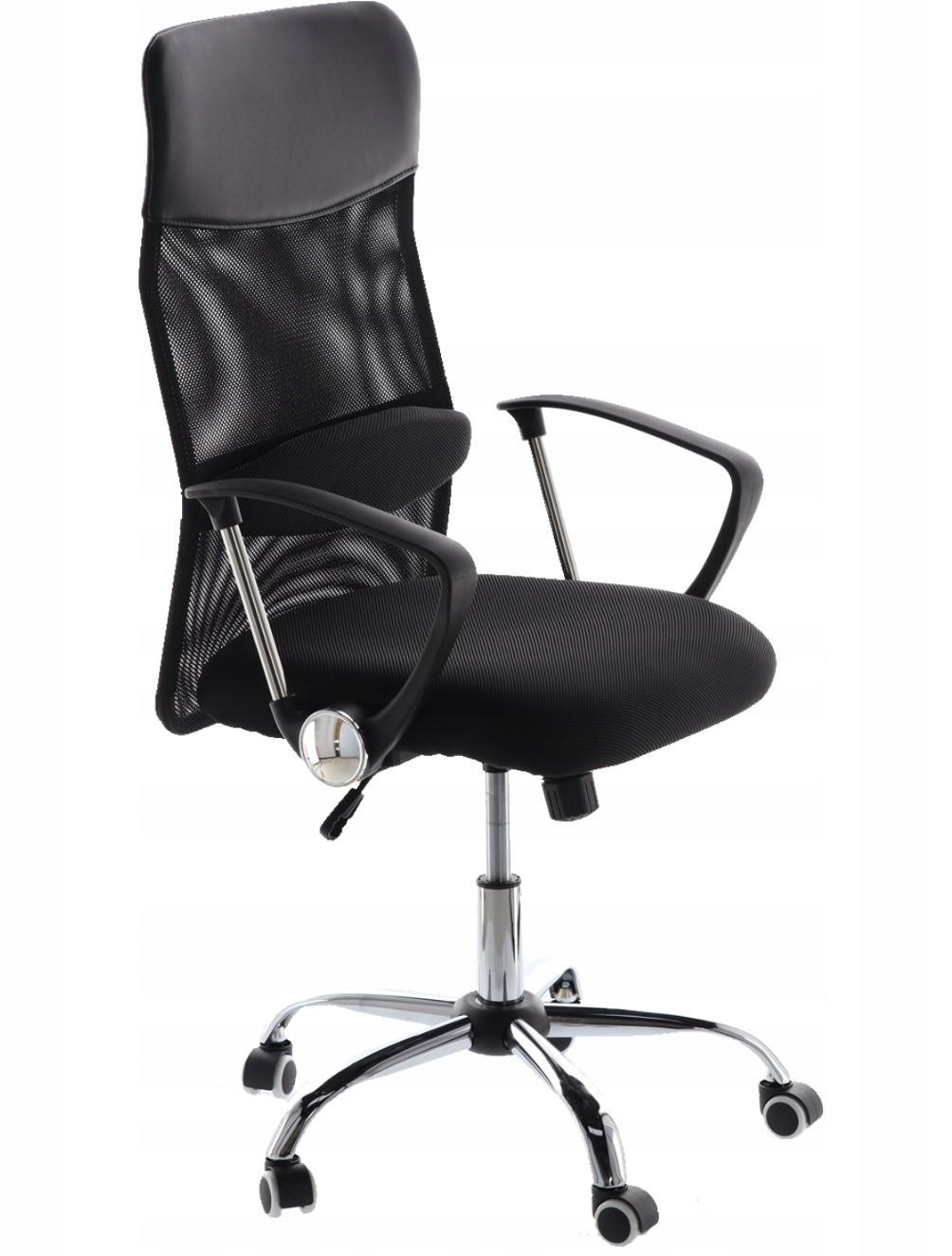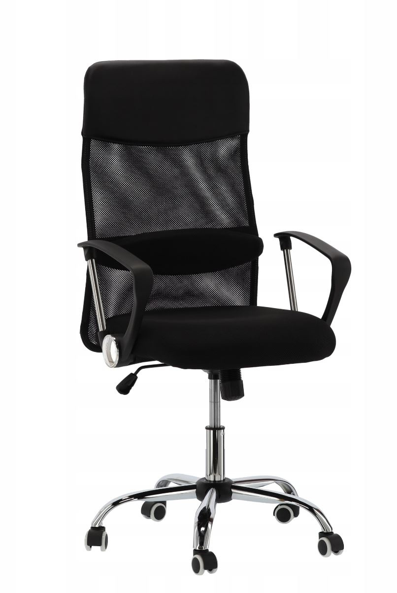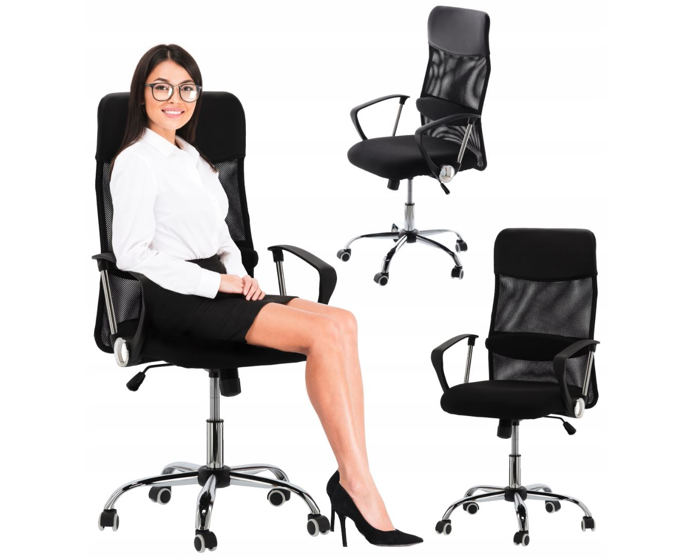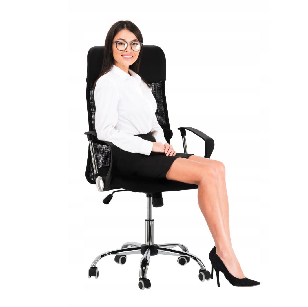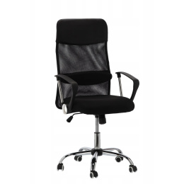 Tento model vám nabídne kromě kombinace elegantní černé a ocelových chromovaných doplňků v podobě kříže a područí i vysoký a krásně prodyšný opěrák s možností nastavení celkové výšky, měkký čalouněný sedák, houpací mechanismus s nastavením síly protiváhy a především bederní opěrku, která citelně zvýší celkový komfort.