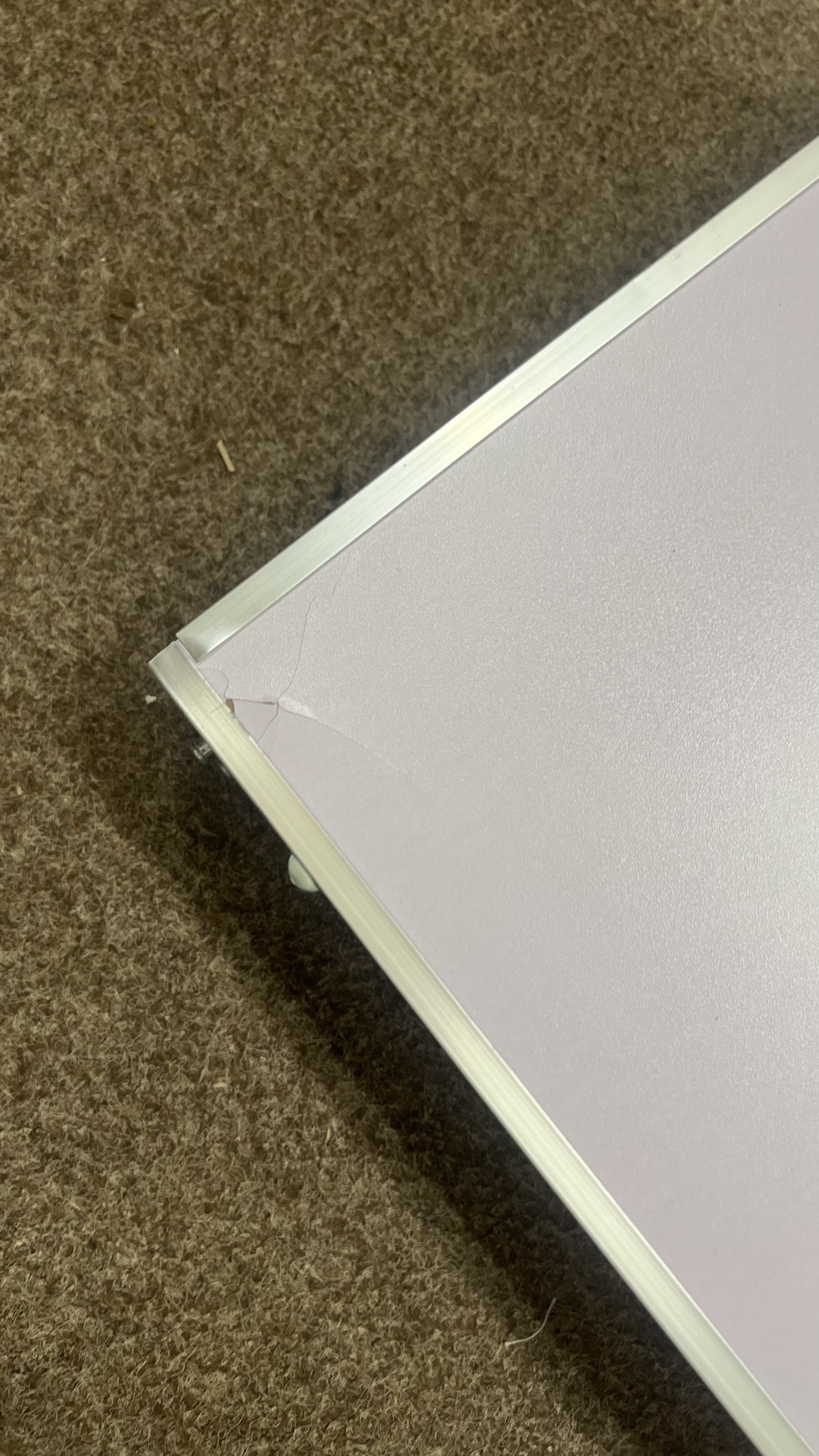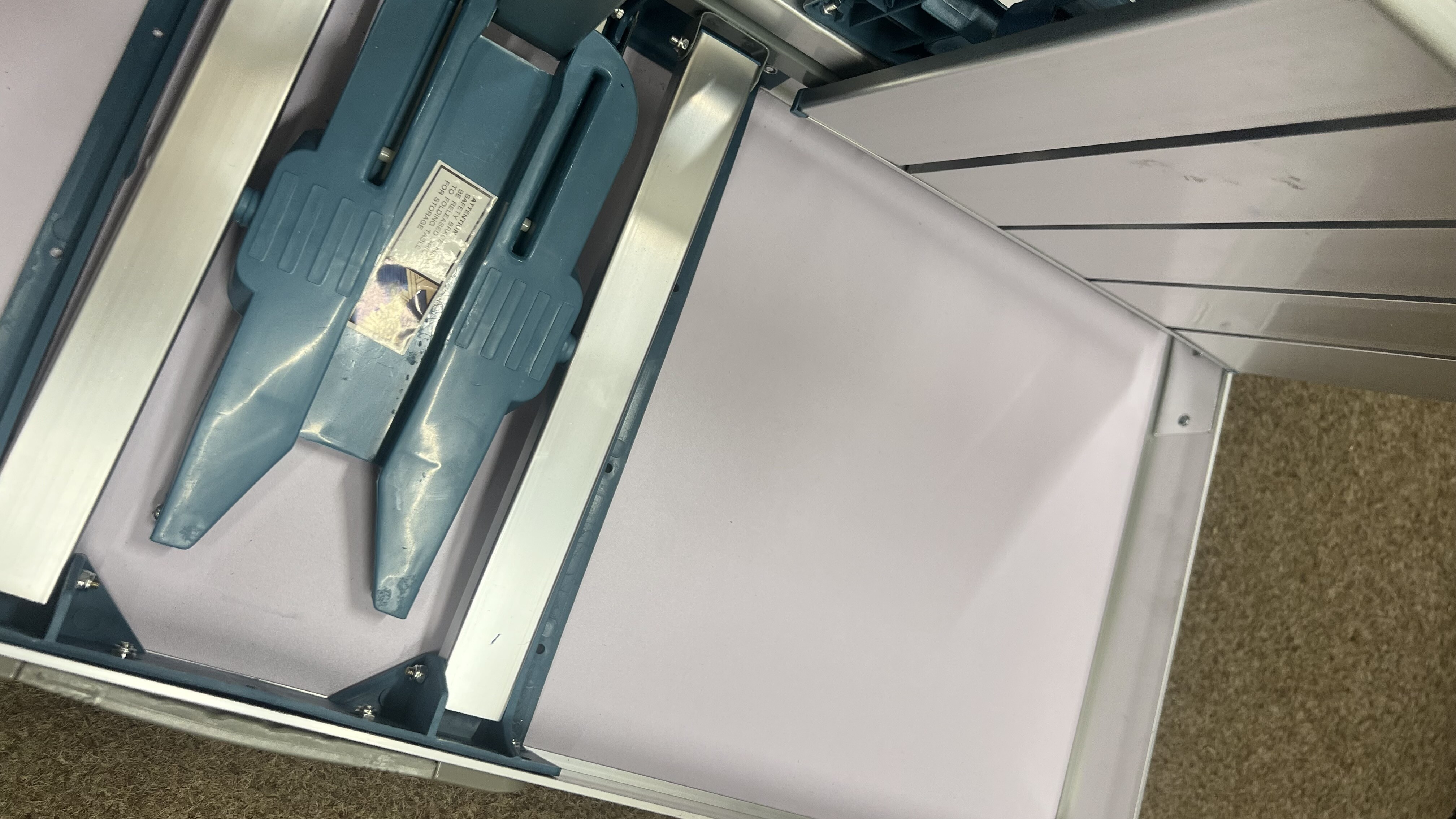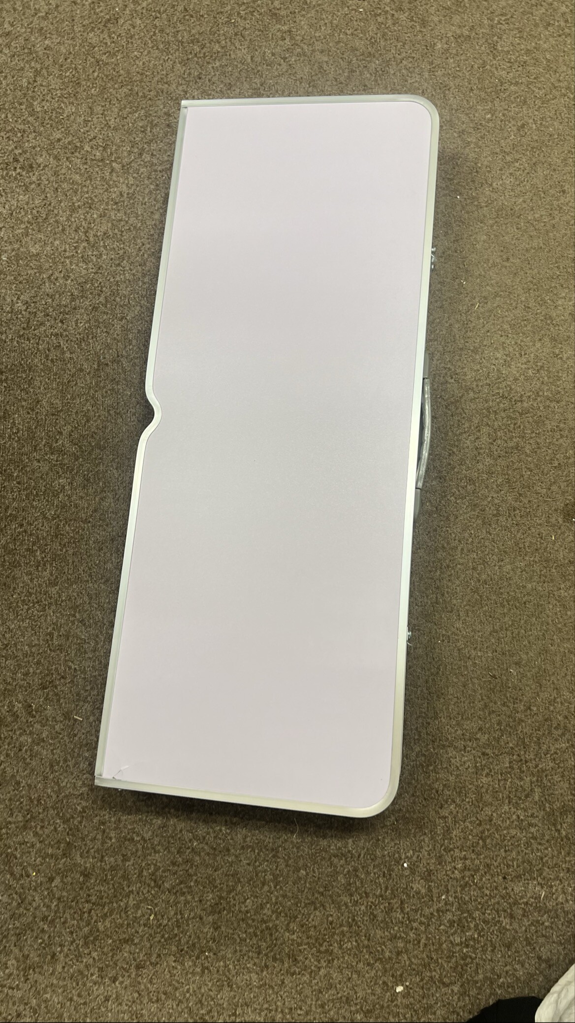 Kempingový skládací set je kompletní a plně funkční. Vada spočívá v prasklinách na desce ve dvou rozích, povrch je navíc místy lehce odřený a zaprášený.