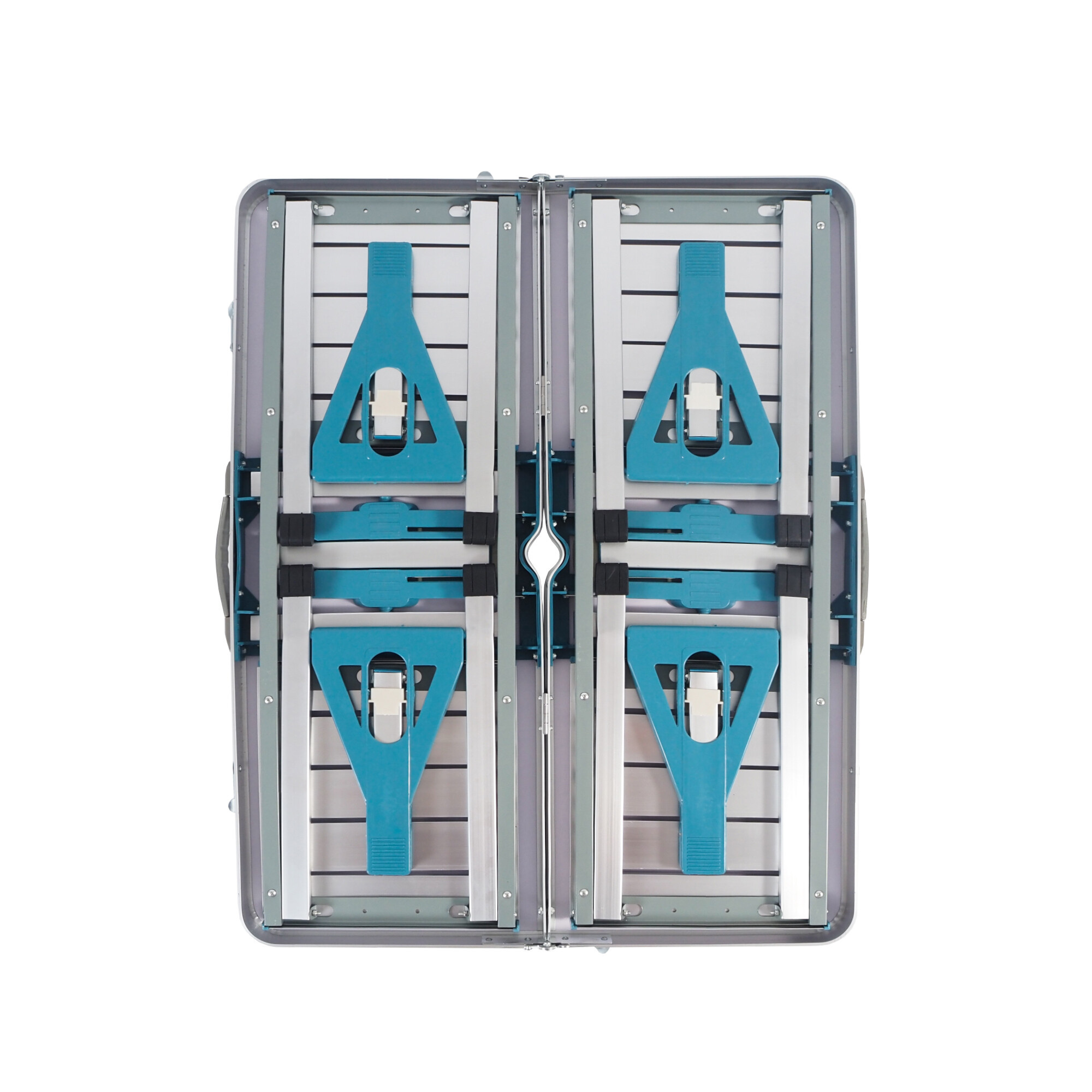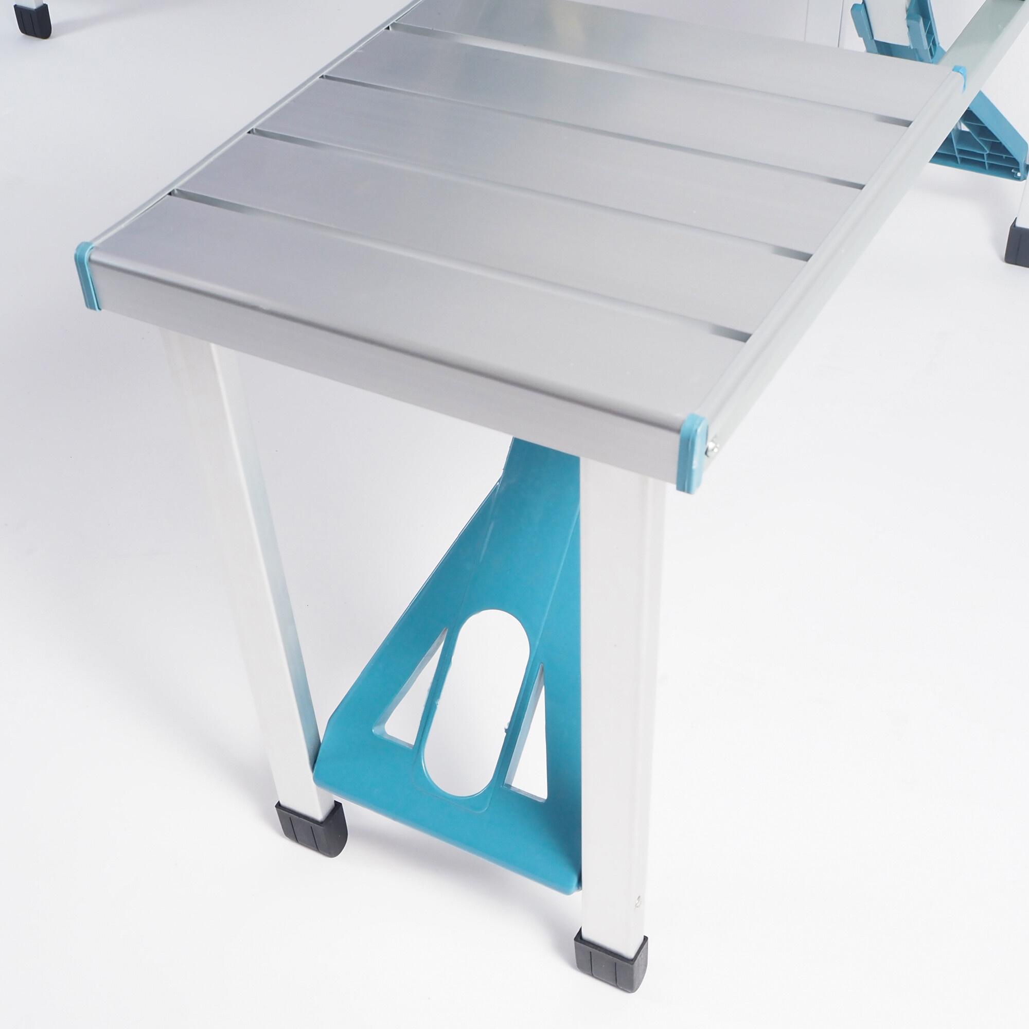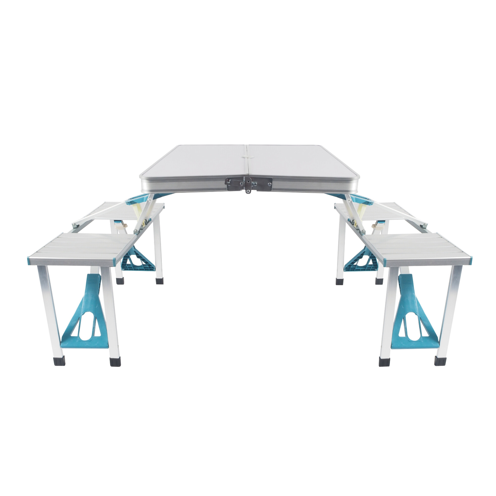Kempingový skládací set je vyroben z hliníku, což zajišťuje jeho lehkost a zároveň pevnost. Materiál desky stolu je z MDF, což je odolný a snadno udržovatelný materiál. Díky těmto kvalitním materiálům je set odolný vůči povětrnostním vlivům a dlouhodobě si zachovává svůj vzhled a funkčnost.