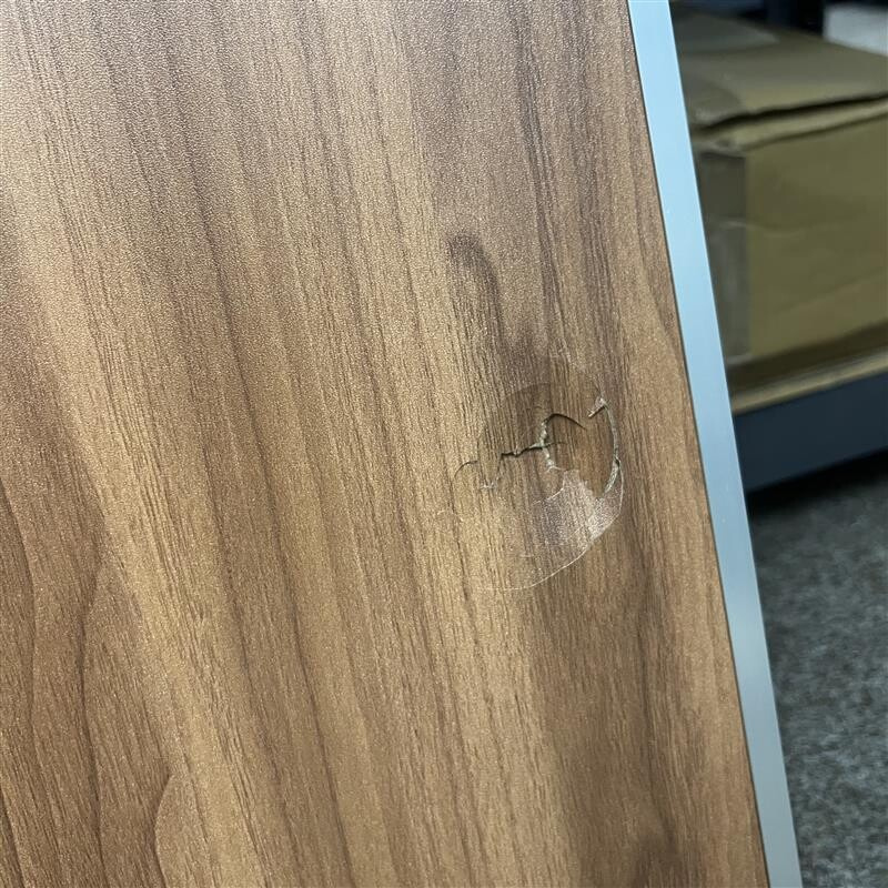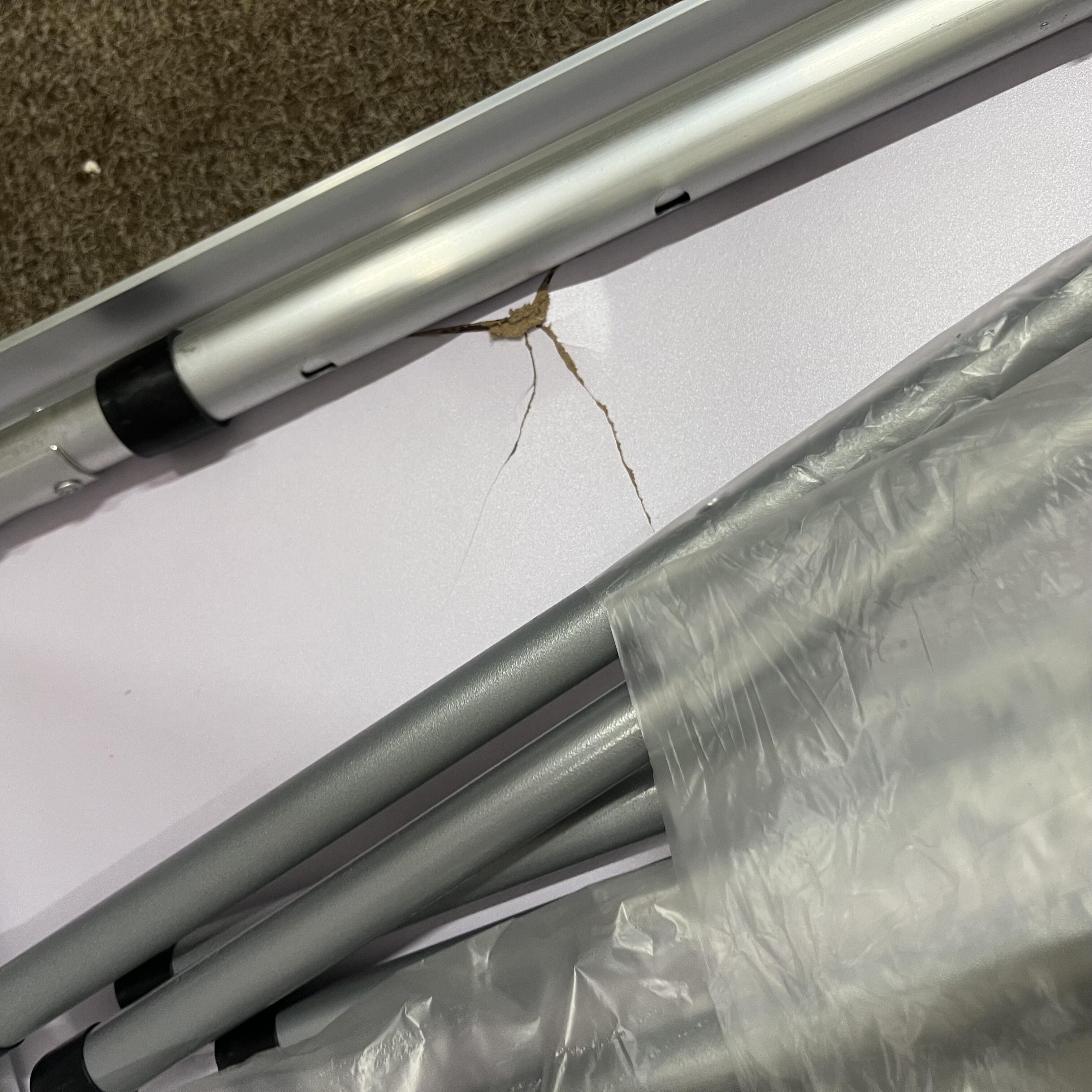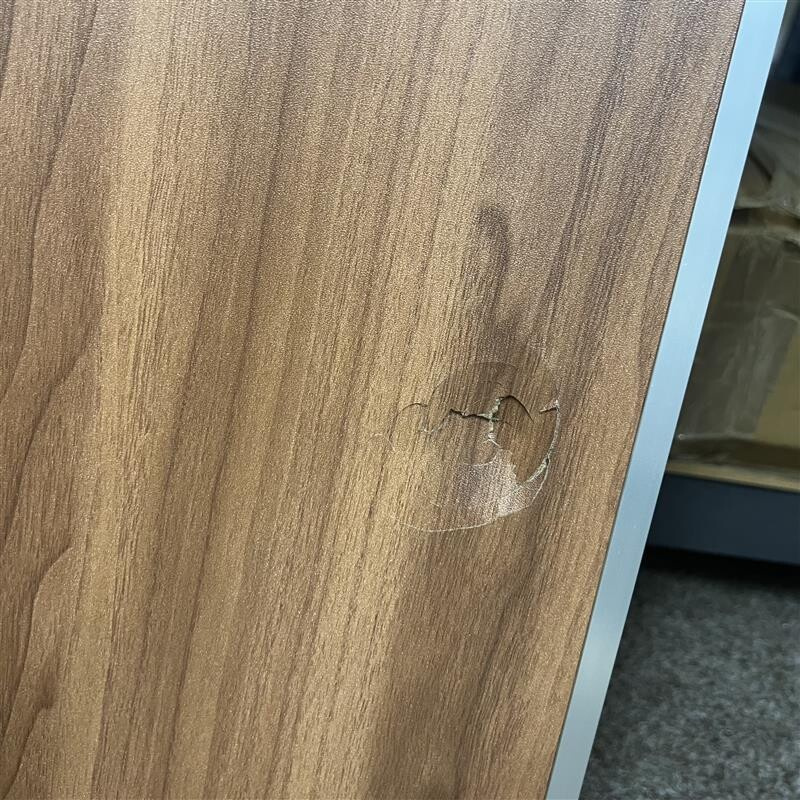 Kempingový stůl má na jedné straně poškození, je promáčklý.