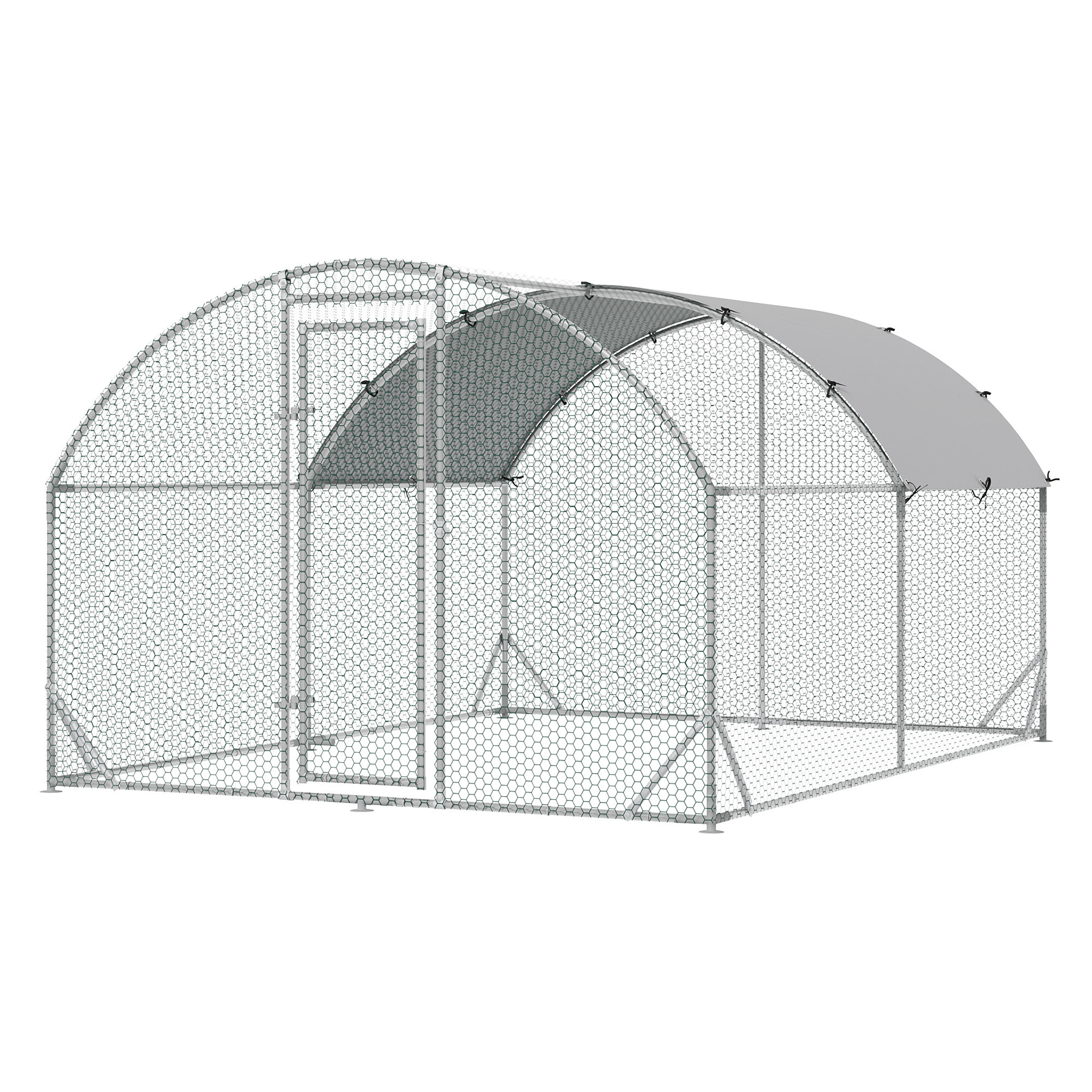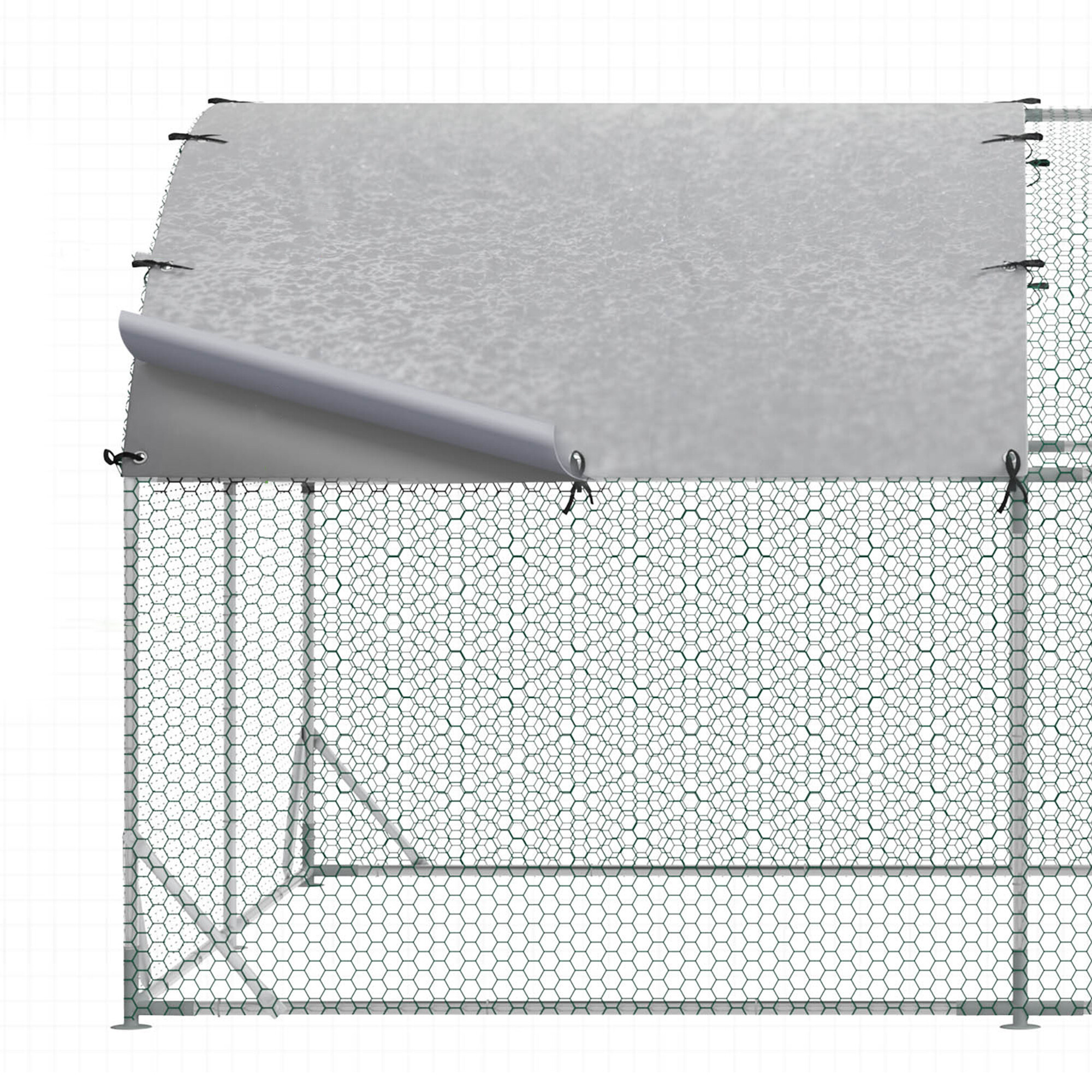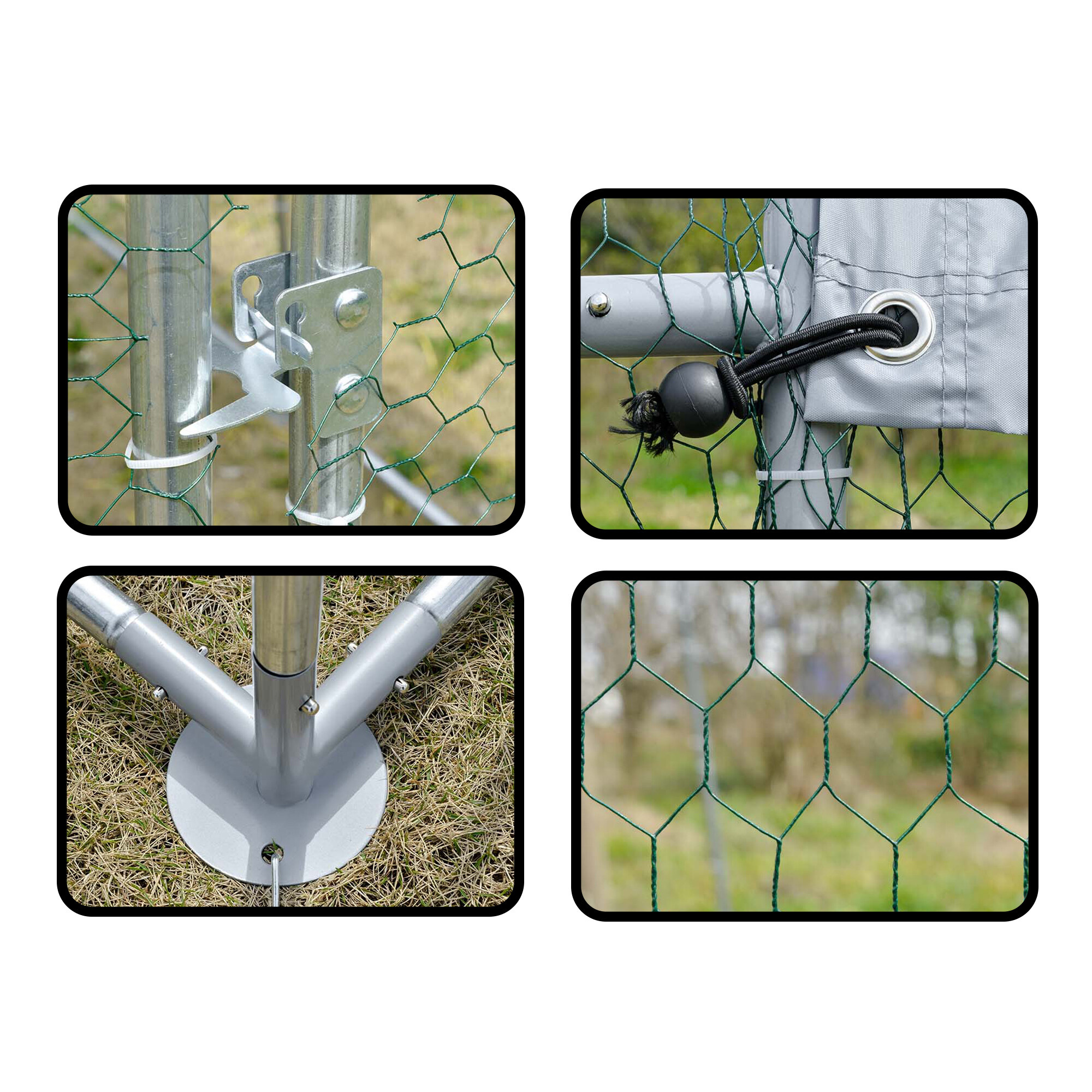 Klec vyrobena z pevné stříbrné pozinkované oceli, která dodá výběhu patřičnou stabilitu a zabrání nechtěným úrazům, v podobě útěků vaší drůbeže. Konstrukce je doplněna o pozinkované pletivo v zelené barvě a střechu, kterou tvoří šedá PVC plachta.