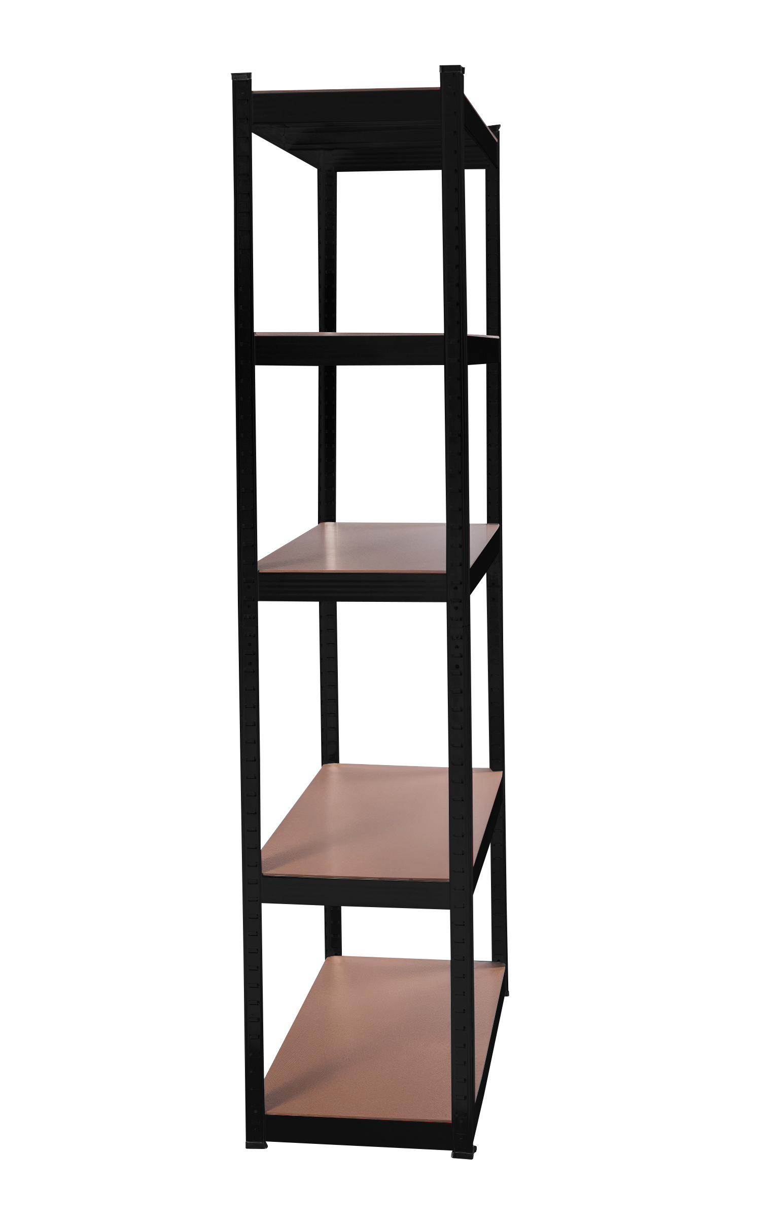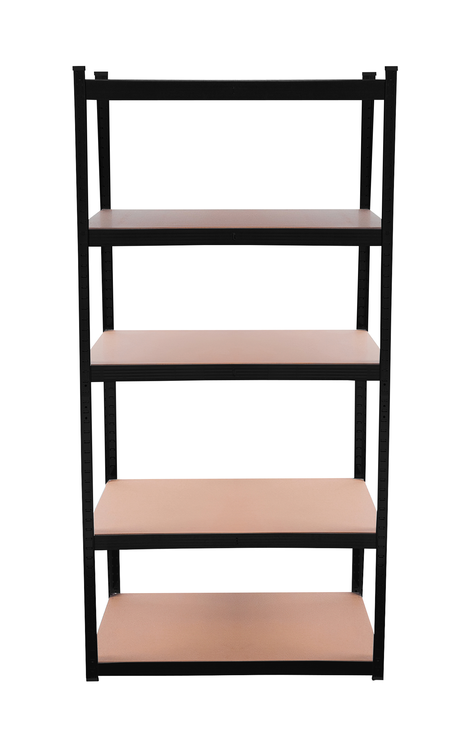 Na výšce cca 180 cm máte k dispozici 5 polic z mdf, které lze výškově vložit dle potřeby. Rám z galvanizované oceli v černé barvě zaručuje stabilitu a velkou nosnost cca 875 kg (na každou polici připadá cca 175 kg).