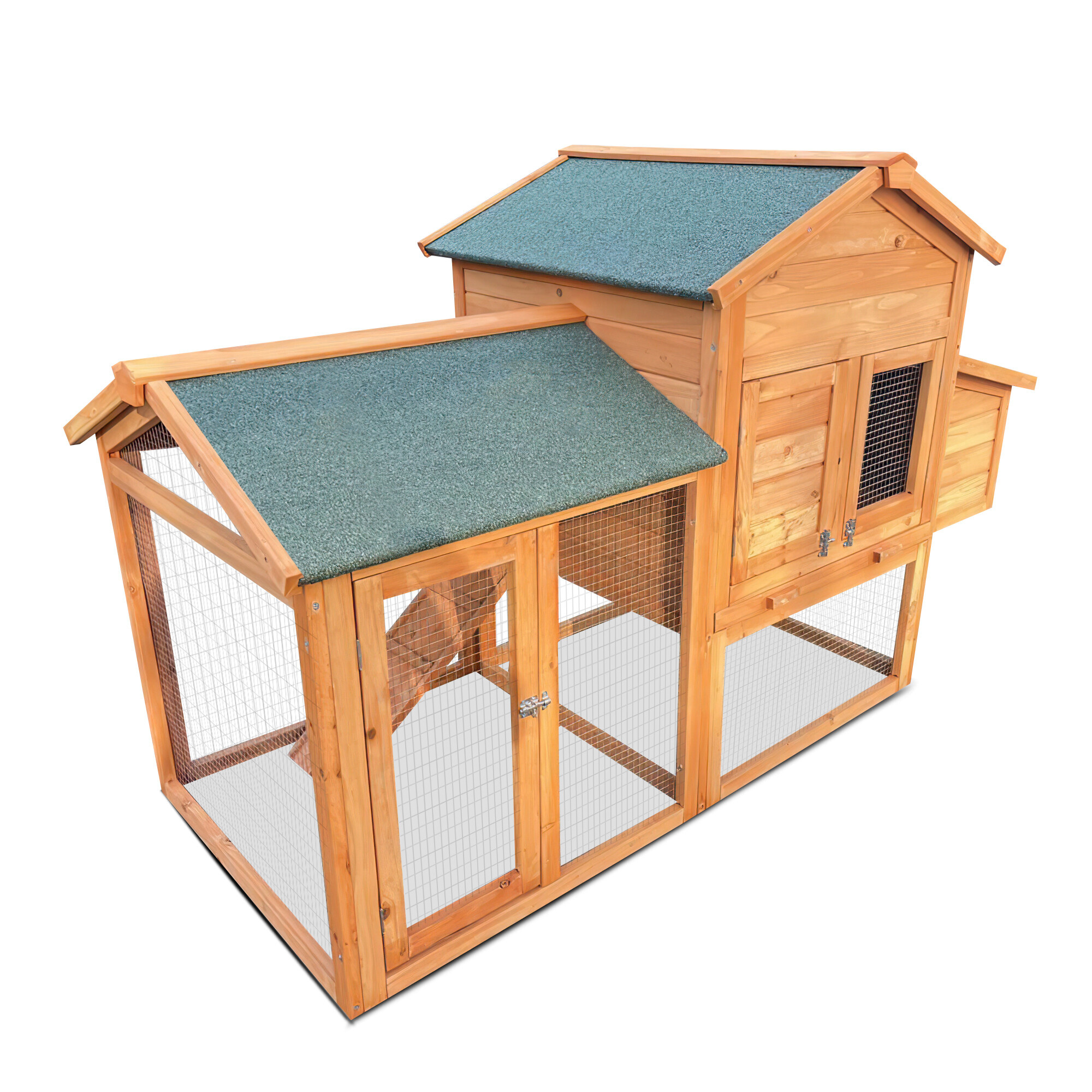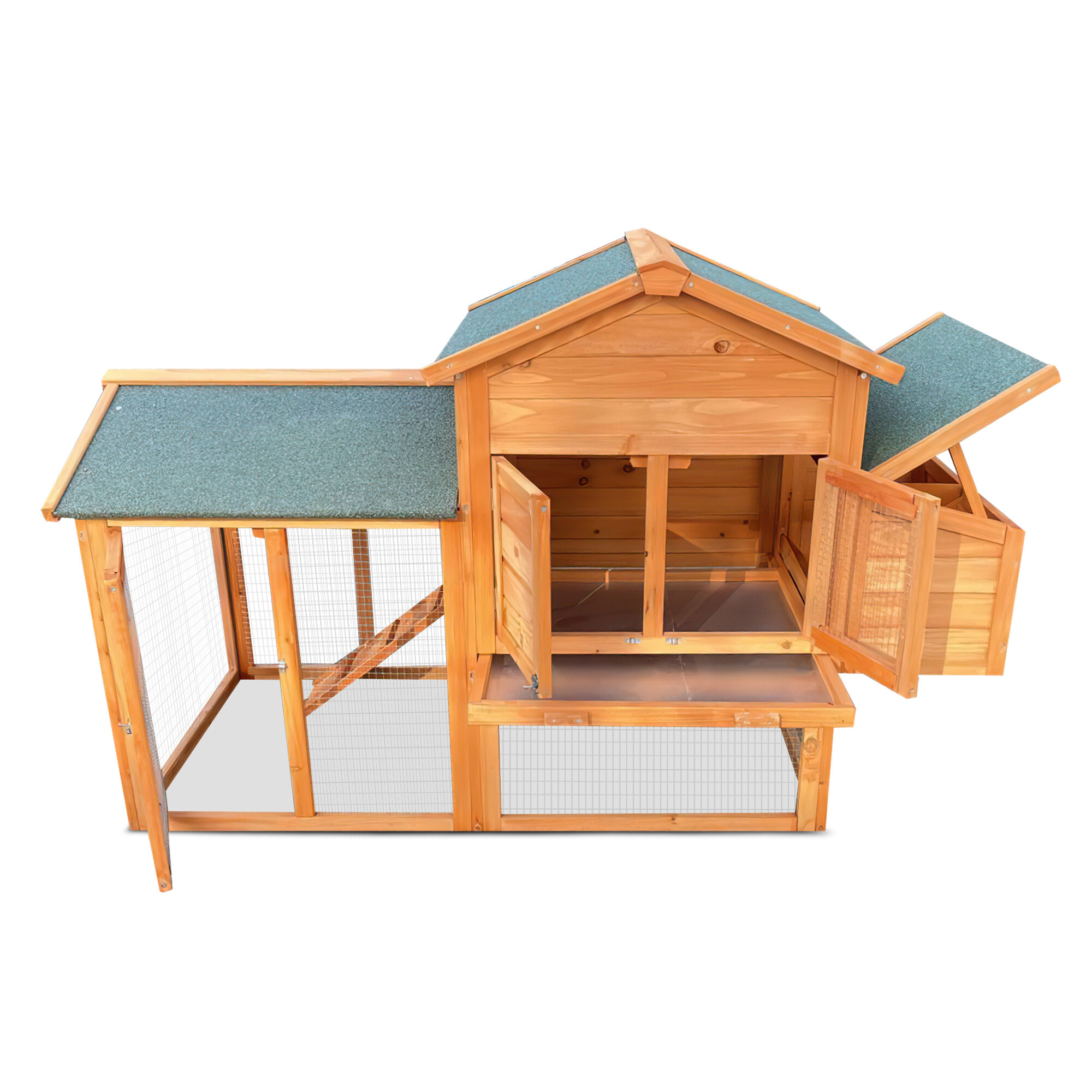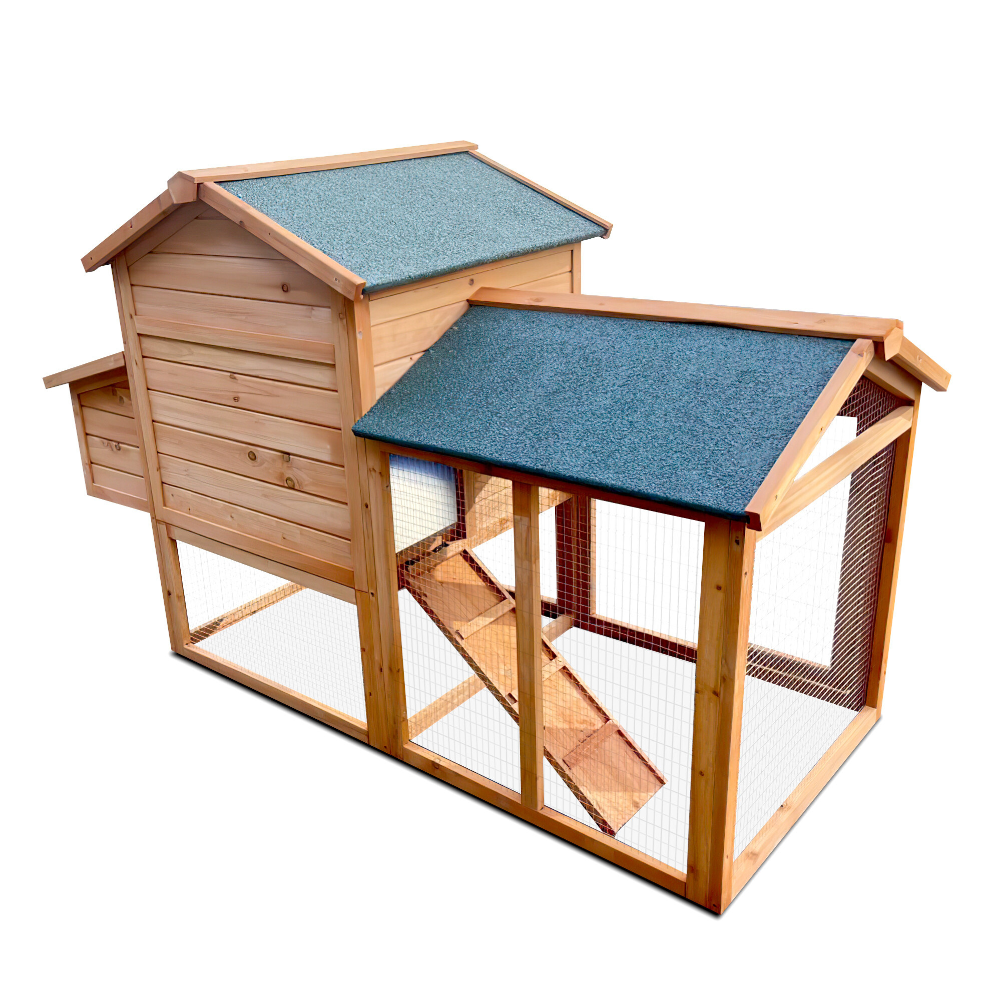 Výběh připojený k obytné části umožňuje slepicím volný pohyb. Střecha je osazena kvalitní šindelovou krytinou, která chrání slepice před deštěm a sněhem. Ze spodního do horního patra vede rampa, po níž mohou zvířata snadno vylézt nahoru. Dvířka lze jednoduše zavřít a zajistit zasouvacími západkami.
