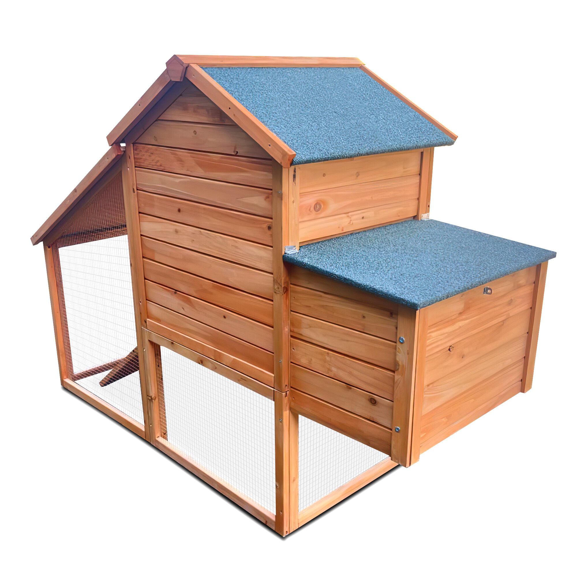 Výběh připojený k obytné části umožňuje slepicím volný pohyb. Střecha je osazena kvalitní šindelovou krytinou, která chrání slepice před deštěm a sněhem. Ze spodního do horního patra vede rampa, po níž mohou zvířata snadno vylézt nahoru. Dvířka lze jednoduše zavřít a zajistit zasouvacími západkami.