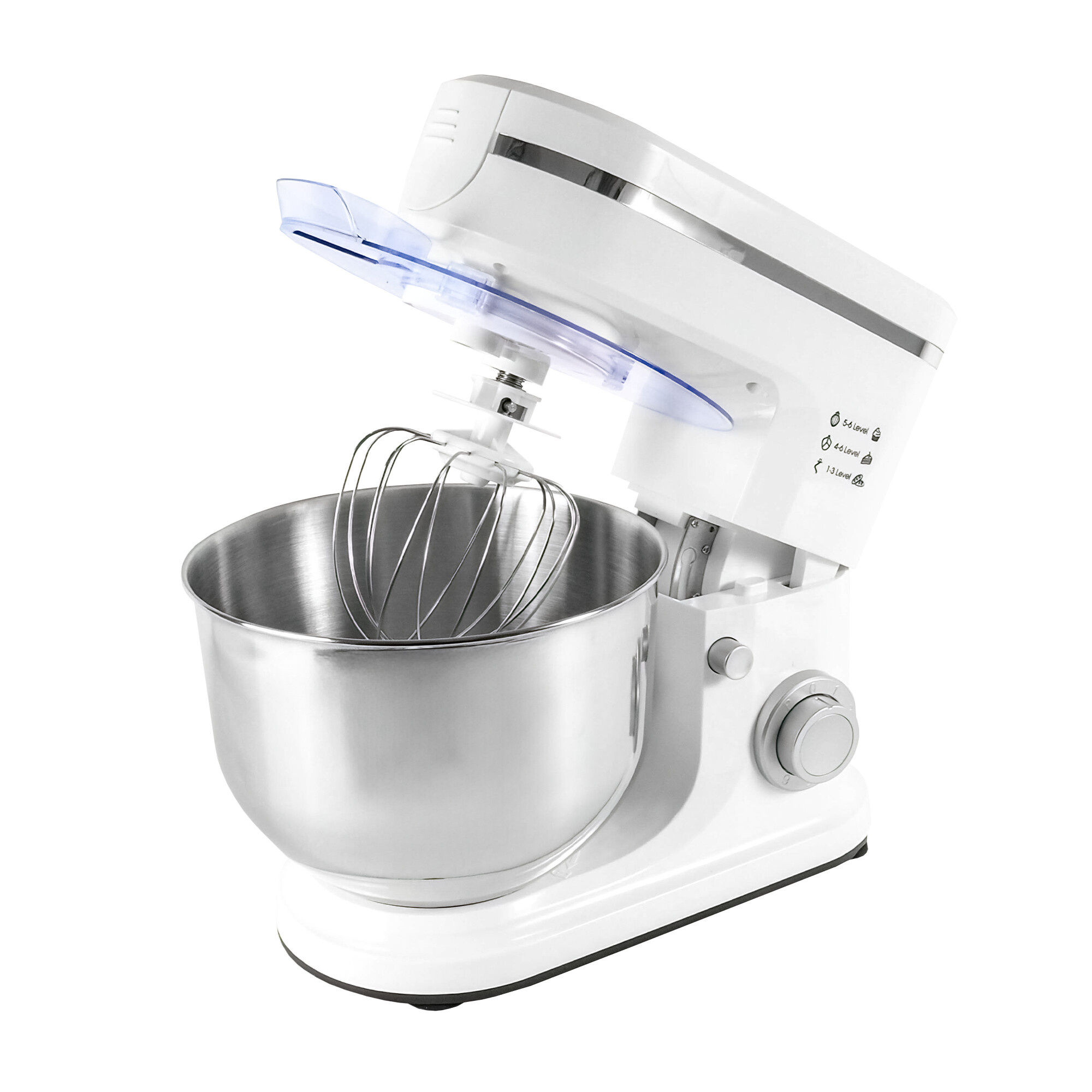 Kuchyňský robot je vybaven výkyvným ramenem, které usnadňuje přístup k míse a výměnu nástavců. Díky ochraně proti stříkání s otvorem na doplňování můžete přidávat ingredience i během míchání, aniž byste se museli obávat nepořádku. Přísavky na spodní straně robota zajišťují, že zařízení bude stát pevně na svém místě, a to i při nejvyšších rychlostech.