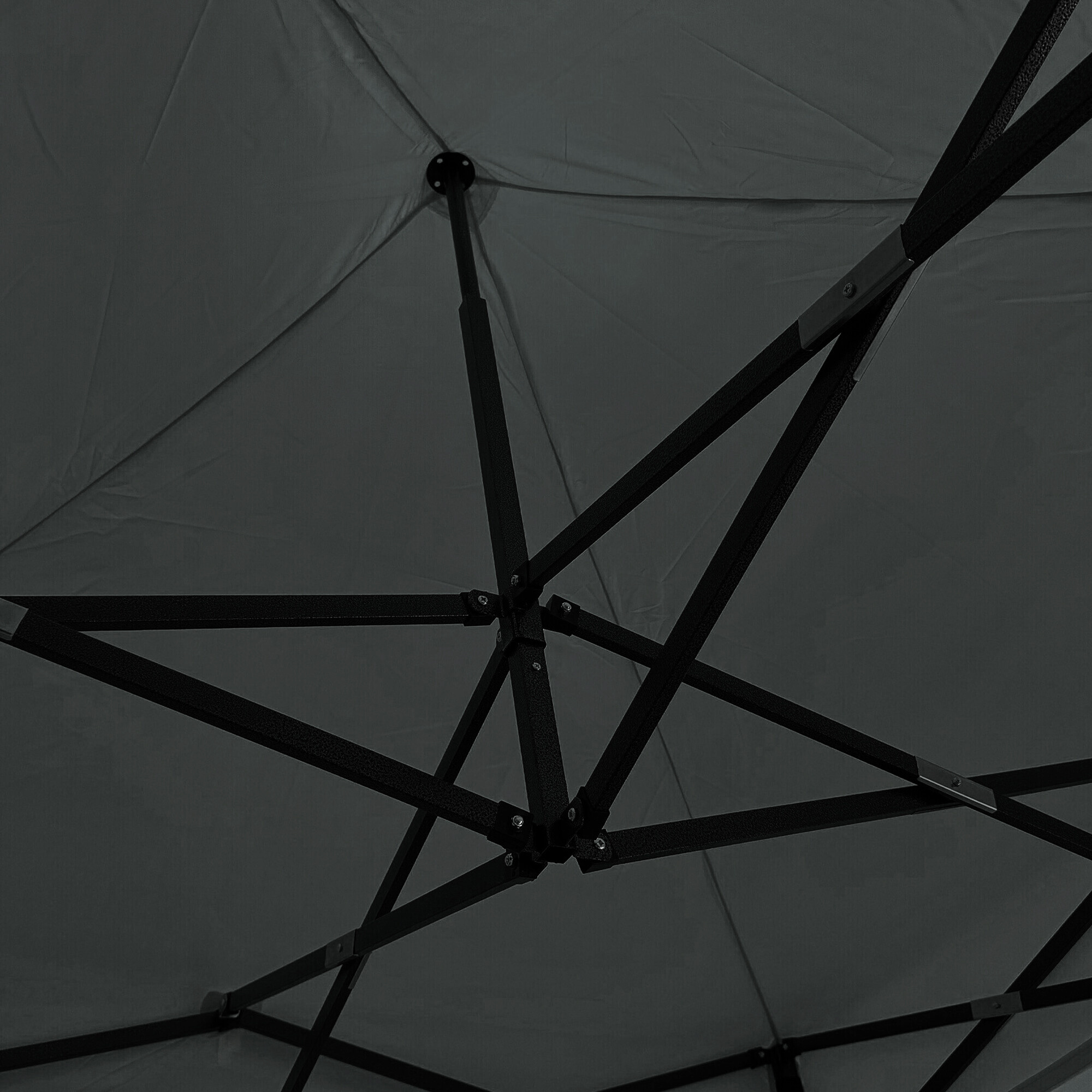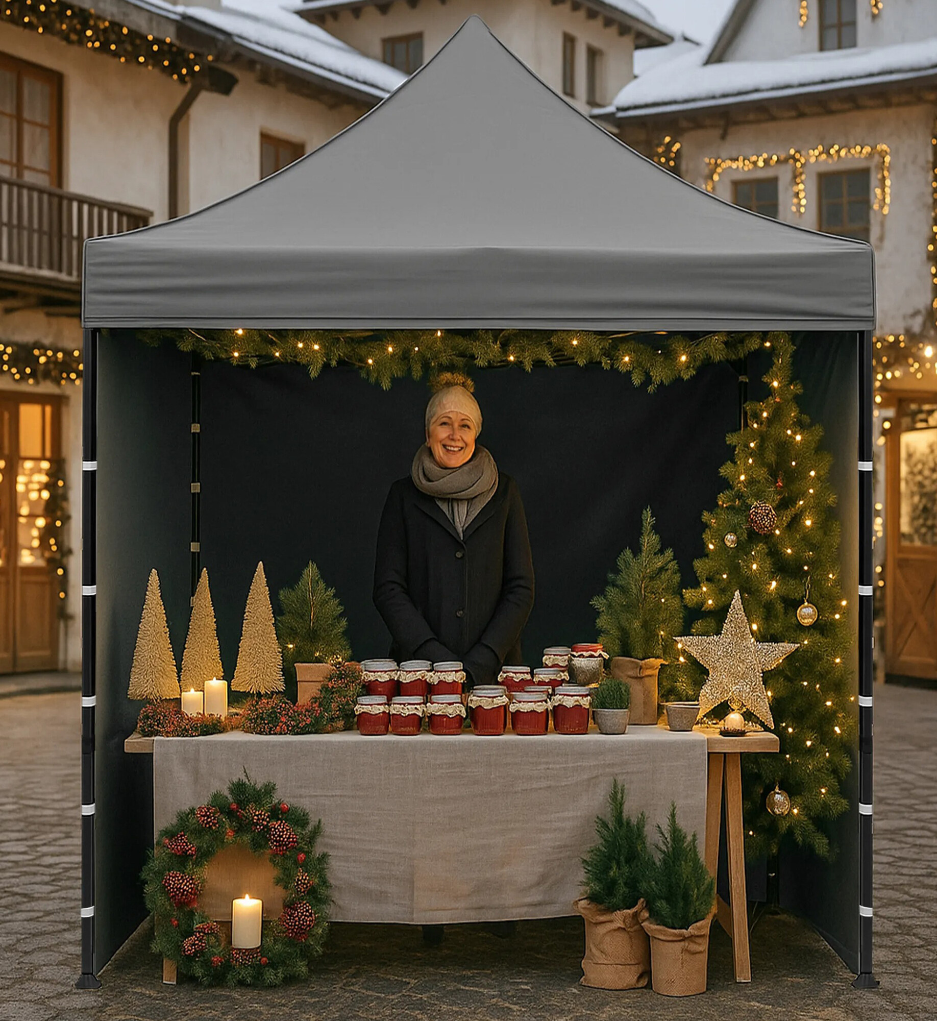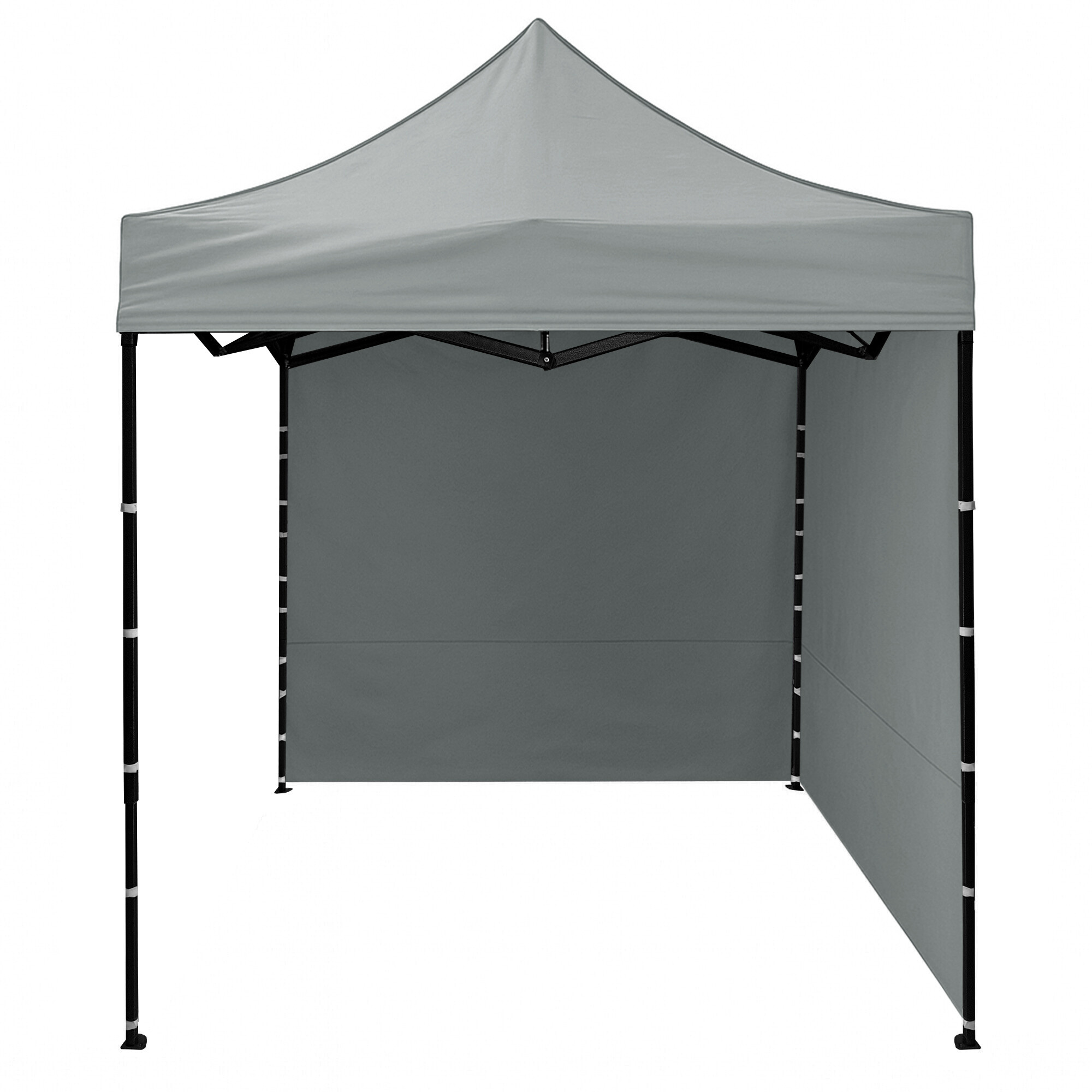 Střecha z 420D PU Oxfordu a bočnice z PVC Oxford 210D poskytují ochranu před větrem i deštěm a zároveň vytvářejí reprezentativní zázemí pro prodejce i zákazníky. Díky praktickému suchému zipu lze bočnice rychle sejmout nebo znovu upevnit.