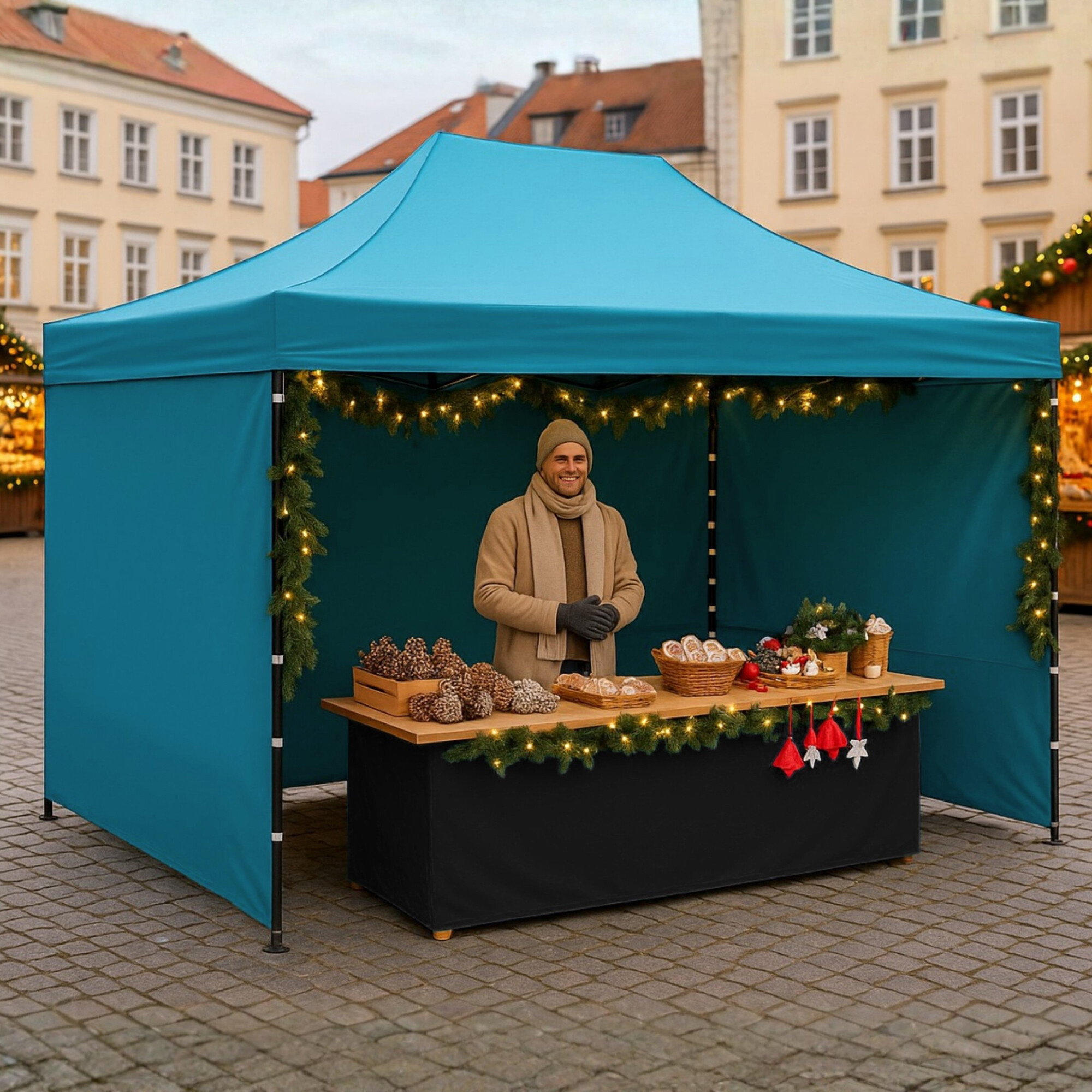 Střecha z odolného 420D PU Oxfordu a bočnice z PVC Oxford 210D poskytují ochranu proti větru i slunci a vytvářejí pohodlné zázemí pro obchodníky i návštěvníky. Bočnice lze kdykoliv rychle sejmout či připevnit díky suchým zipům, takže stánek snadno přizpůsobíte situaci.