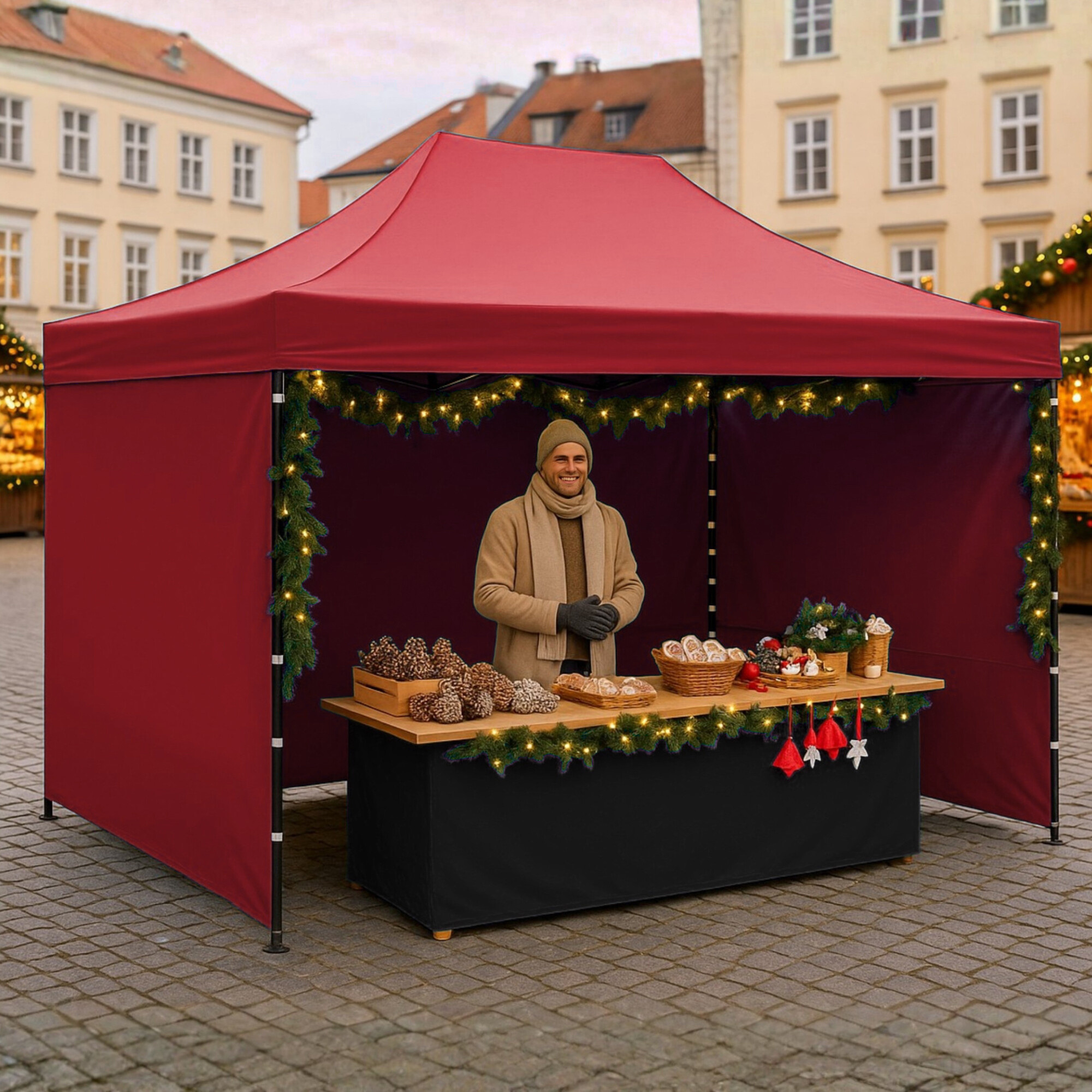 Střecha z odolného 420D PU Oxfordu a bočnice z PVC Oxford 210D poskytují ochranu proti větru i slunci a vytvářejí pohodlné zázemí pro obchodníky i návštěvníky. Bočnice lze kdykoliv rychle sejmout či připevnit díky suchým zipům, takže stánek snadno přizpůsobíte situaci.