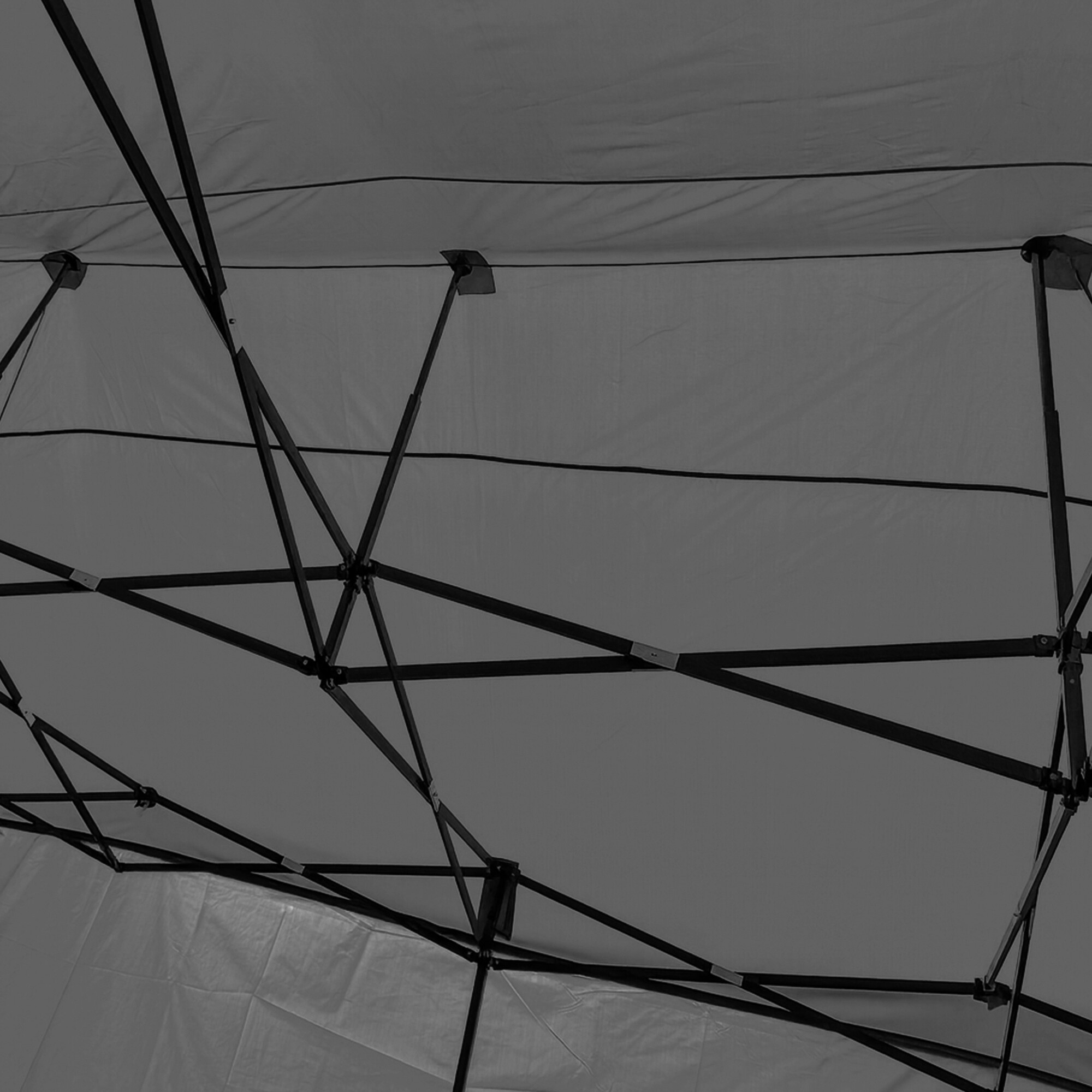 Konstrukce je vyrobena z práškově lakované oceli se šroubovanými spoji, které dodávají stánku stabilitu a pevnost i při častém používání. Patky na nohách umožňují bezpečné ukotvení k povrchu. Součástí provedení je také středová noha, která rovnoměrně rozkládá zatížení konstrukce, zvyšuje stabilitu a snižuje průhyb střechy u velkého rozměru 3×6 m.