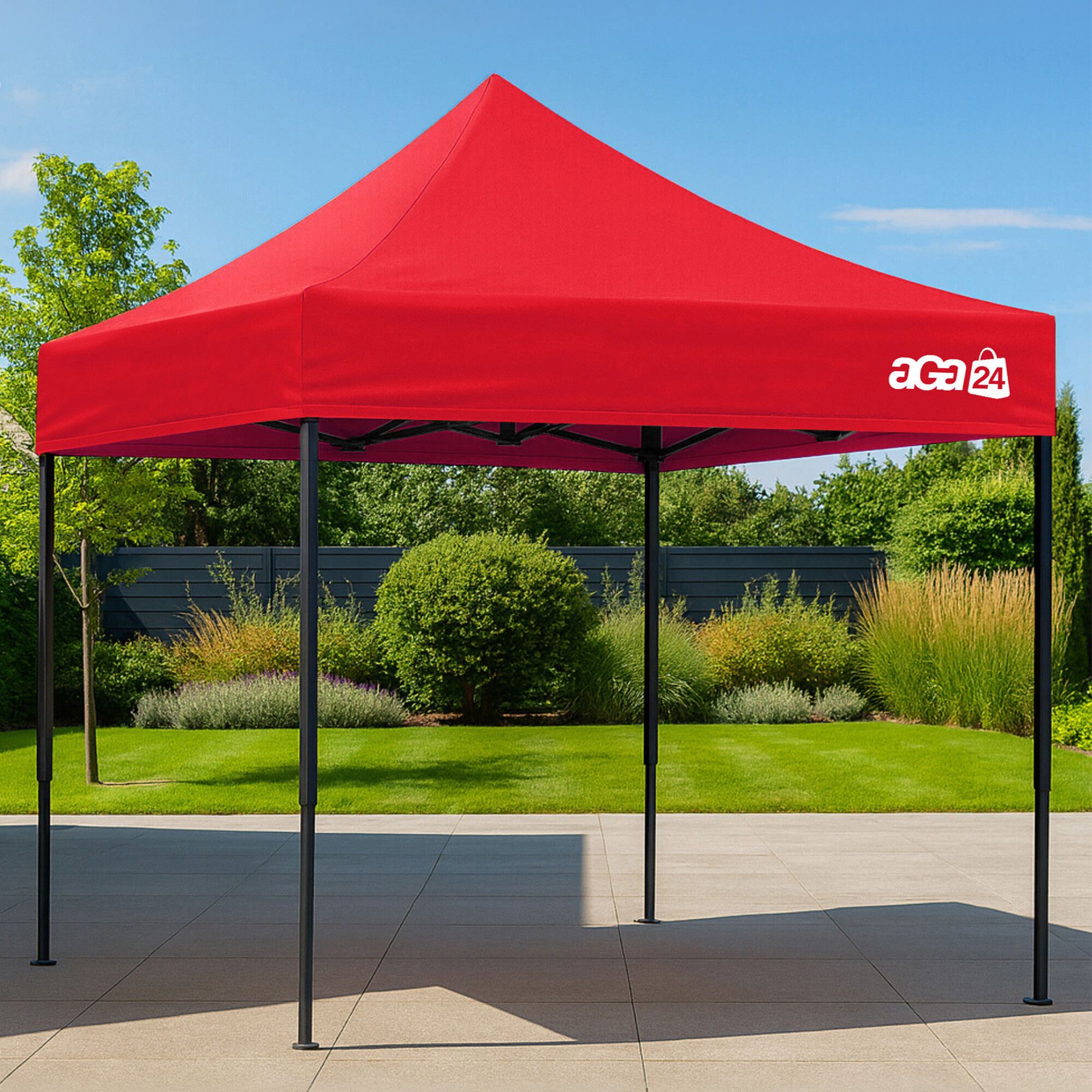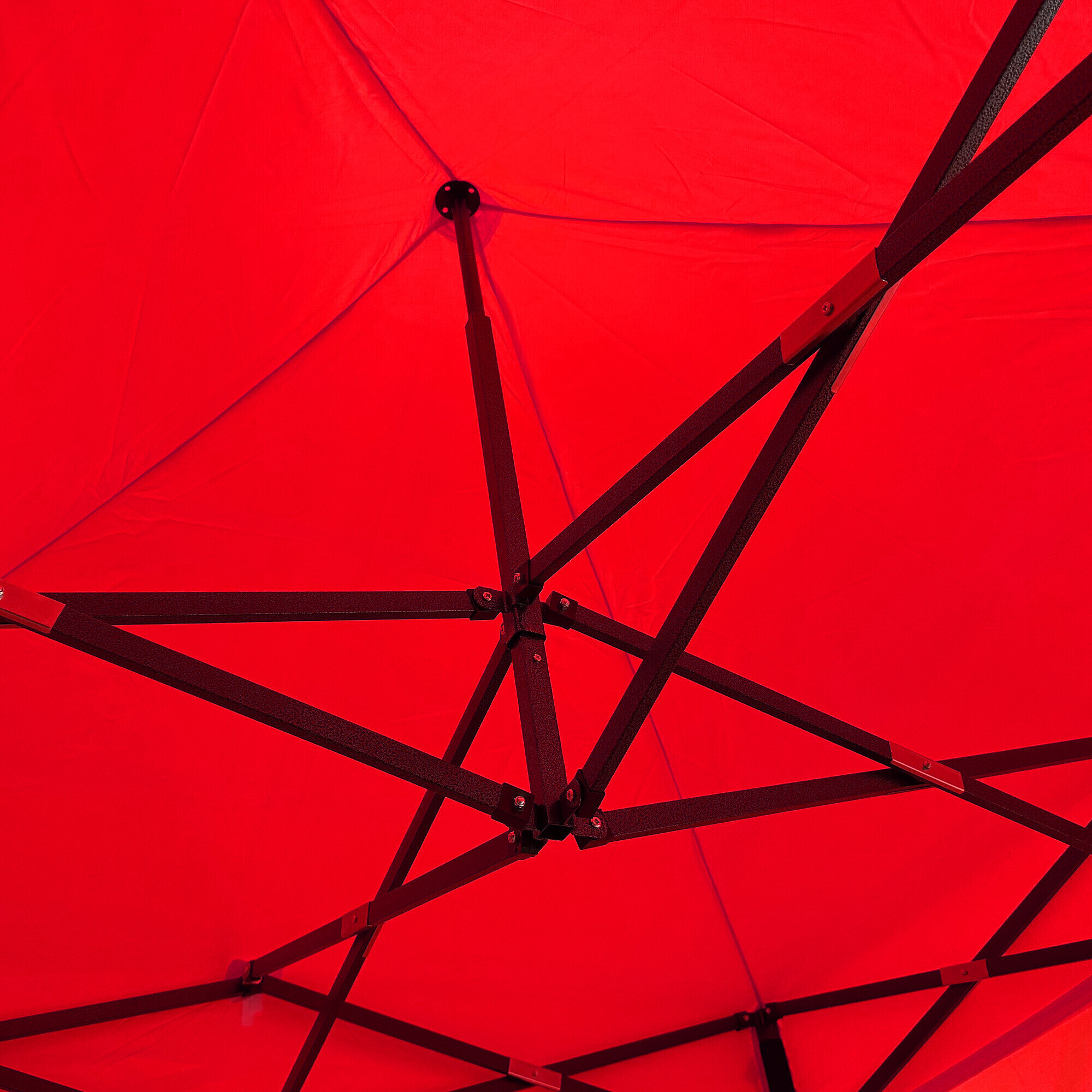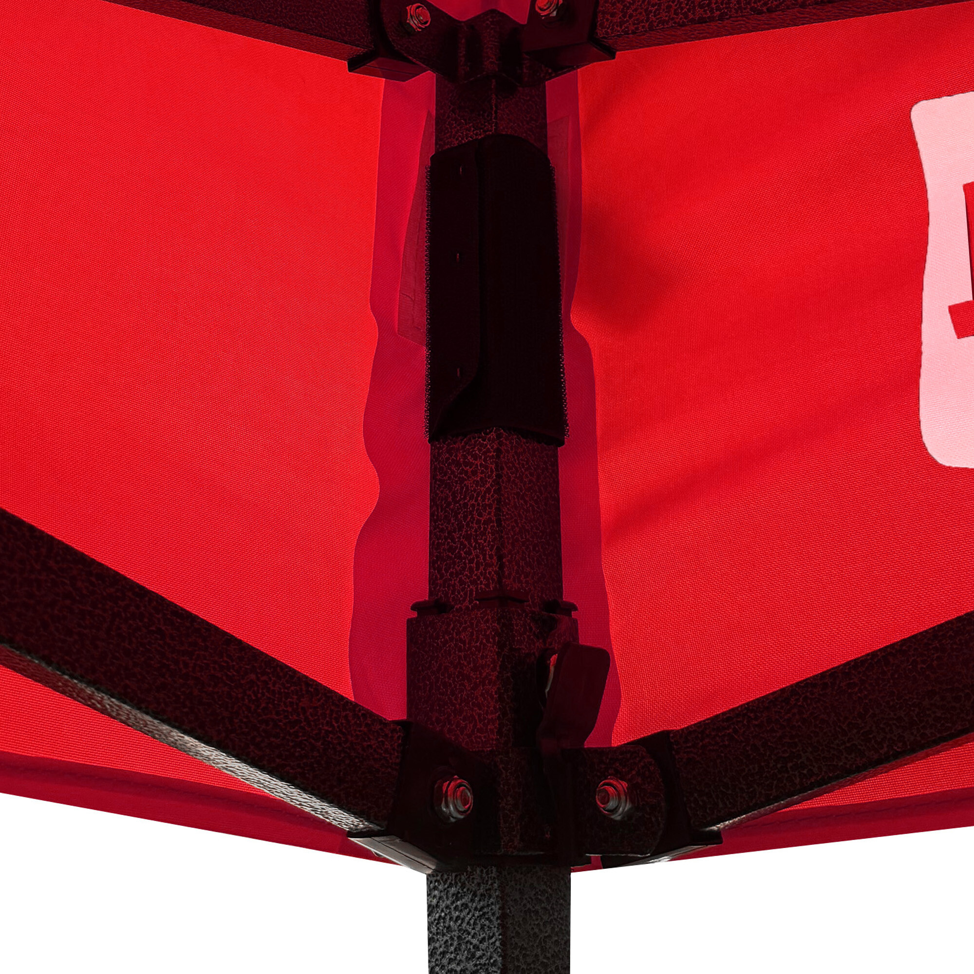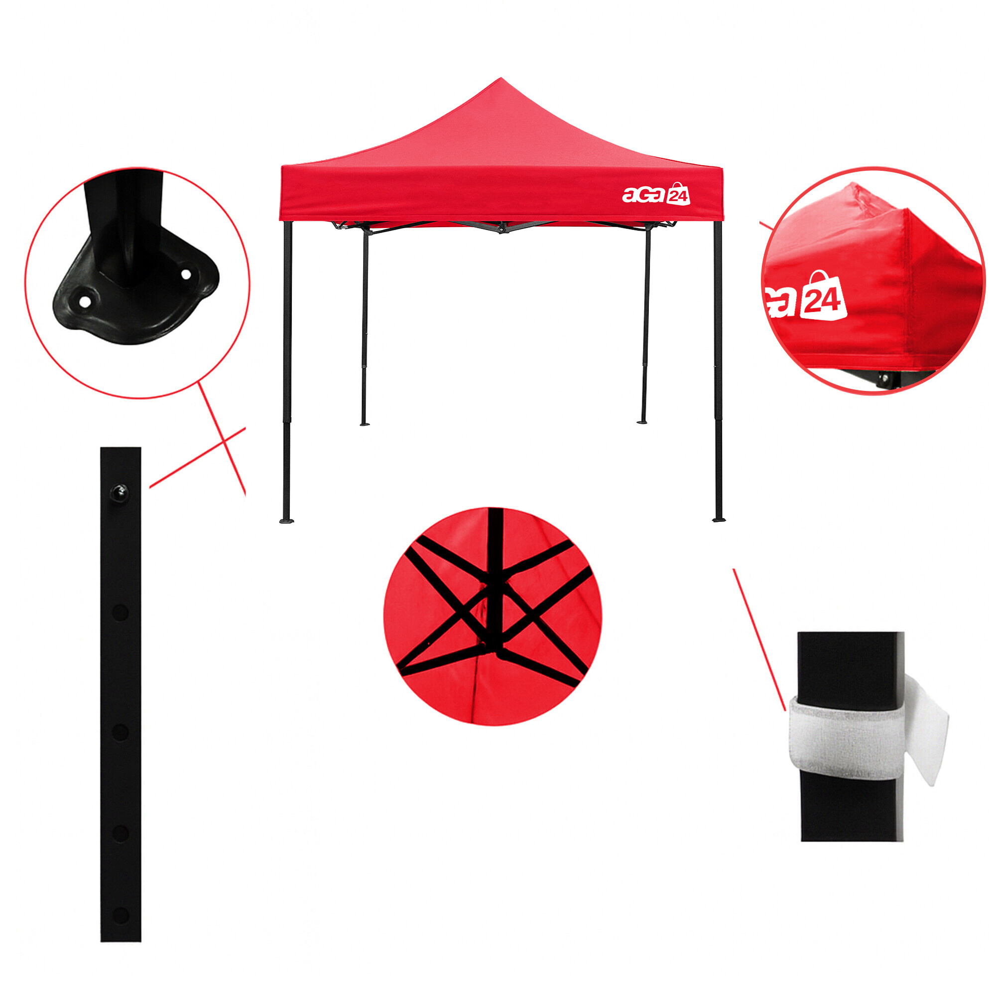 Konstrukci tvoří ocelový rám s nůžkovým mechanismem, který je povrchově chráněn práškovým lakem proti korozi. Oproti běžným skládacím stanům má tento model šroubované spoje, což zvyšuje pevnost, prodlužuje životnost a usnadňuje případný servis nebo výměnu dílů. Díky třem stupňům regulace lze výšku nastavit od 213 cm až do 290 cm, takže stánek snadno přizpůsobíte konkrétním podmínkám.