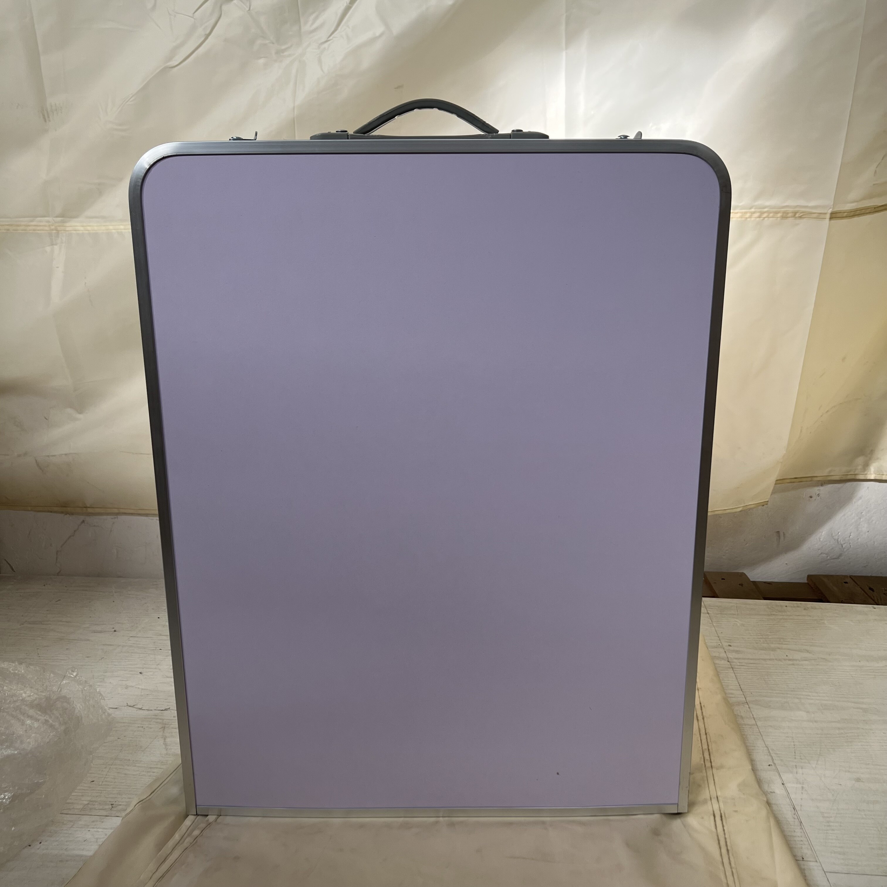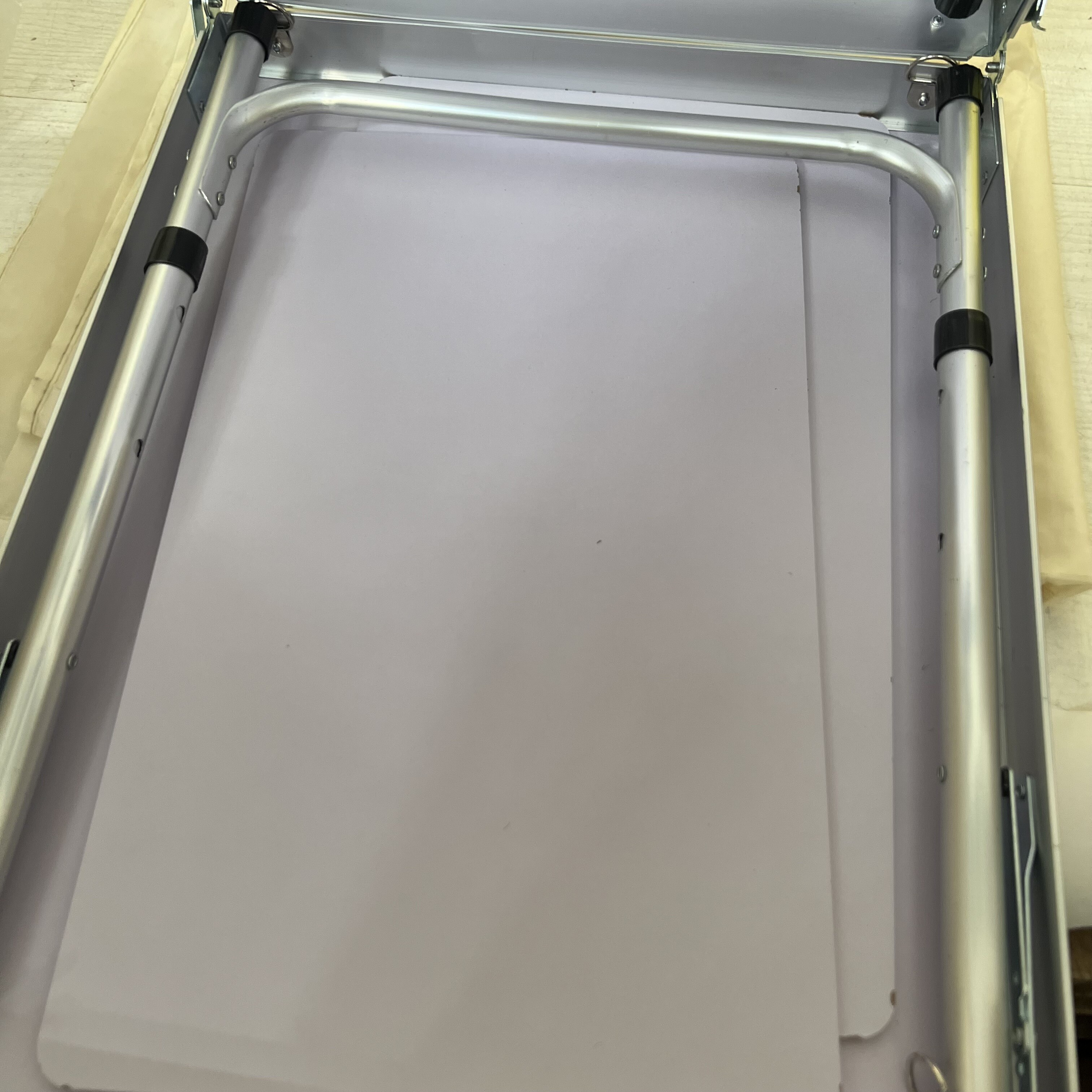 - Ve sbaleném stavu je stůl snadno přenosný v podobě ploché desky s uchem