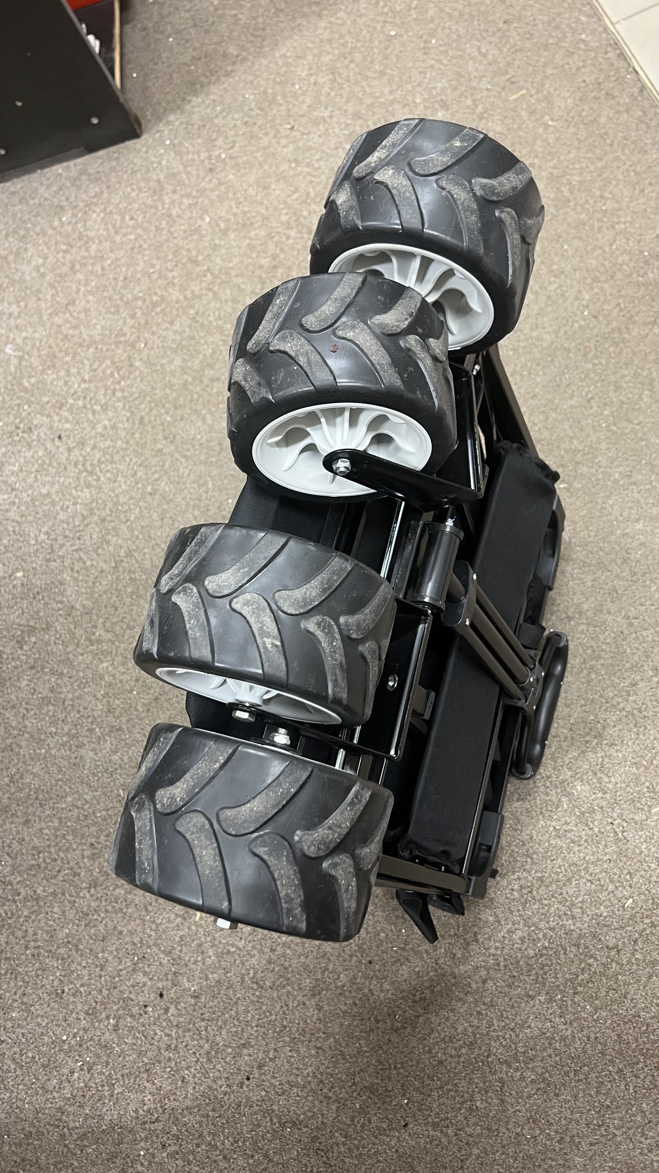 - Extra široké a otočné kola zaručují plynulou jízdu v jakémkoliv terénu