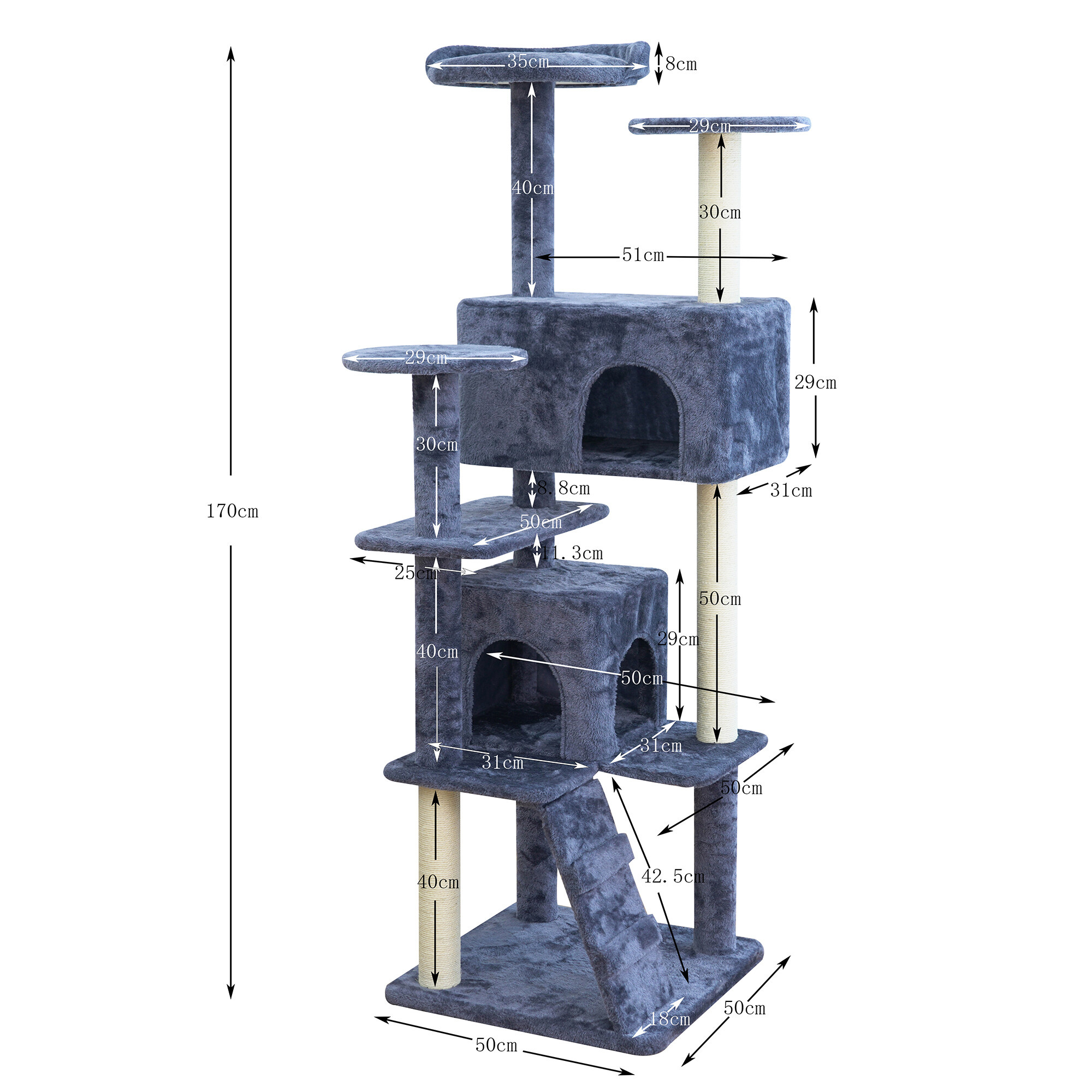 - Škrabadlo obsahuje: 2 domečky pro možnost úkrytu, 3 odpočívadla, žebřík a sloupky částečně potažené sisalem