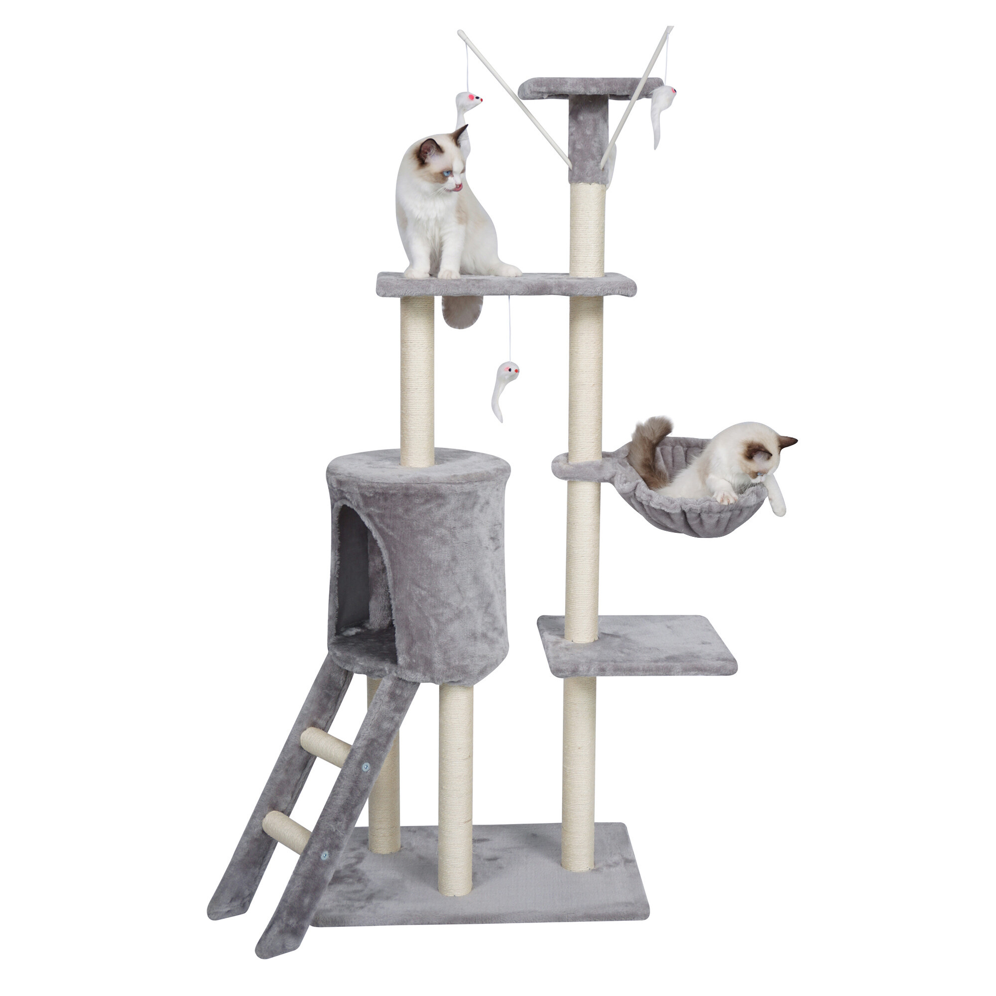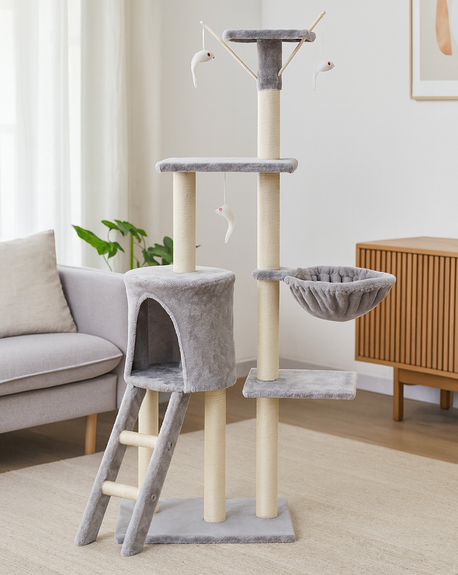 Škrabací strom omotaný kvalitním a silným sisalem jí kdykoliv poslouží k nabroušení drápků, aniž byste riskovali, že to udělá přesně tam, kde nechcete. Současně to bude díky hebkému veluru její oblíbené místo k odpočinku a hře.