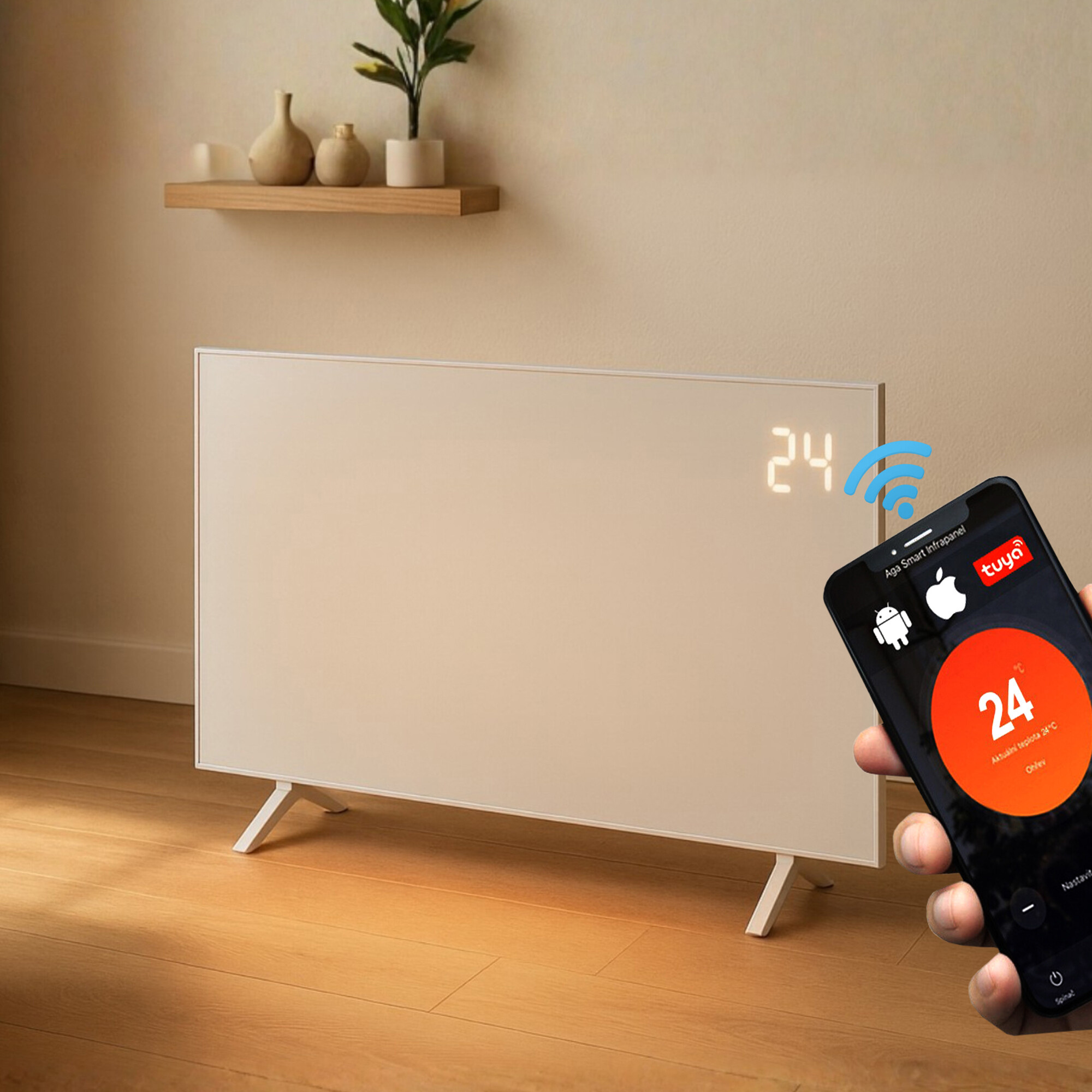 Panel zle i ovládat pomocí dálkového ovládaní nebo díky integrované Wi-Fi se může topný panel připojit k internetu a poté ho ovládat odkudkoli prostřednictvím aplikace Tuya.