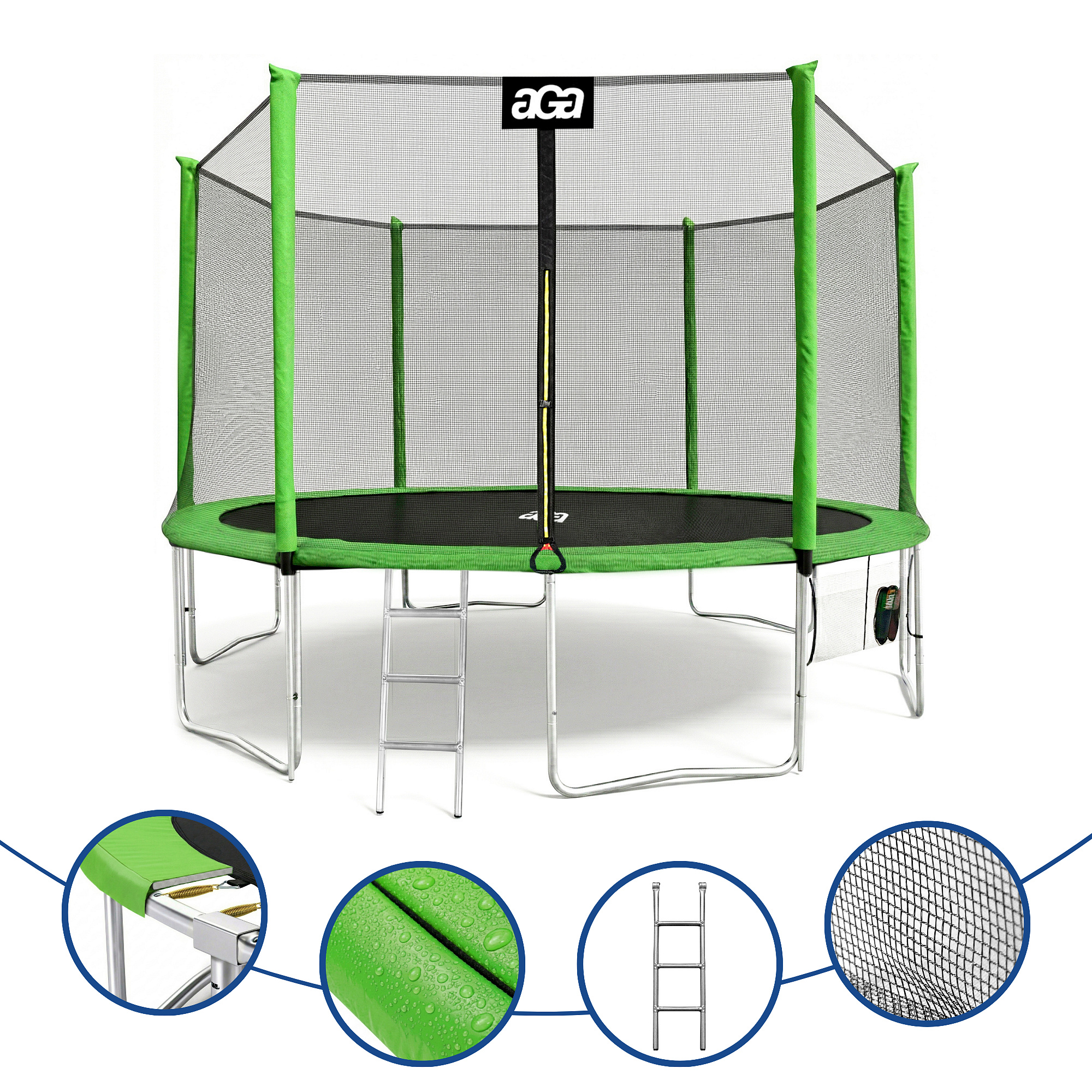 Specifikace trampolíny Aga SPORT PRO 430 cm Light Green s ochrannou sítí.