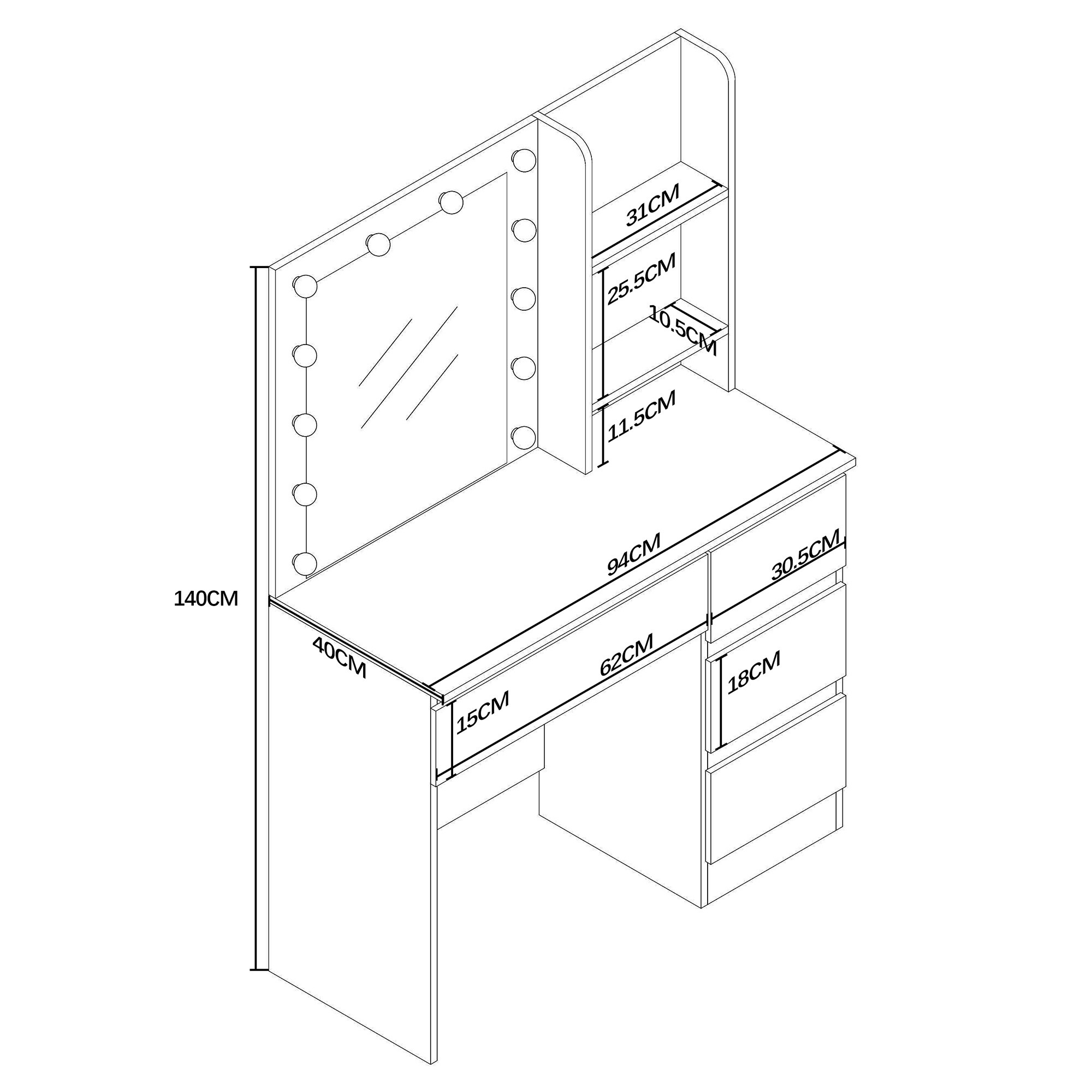 S rozměry 94 × 40 × 140 cm se stolek skvěle hodí i do menších ložnic či bytů. Jeho moderní design doplněný o jemné LED osvětlení vytváří stylové a útulné místo pro každodenní rituály krásy.