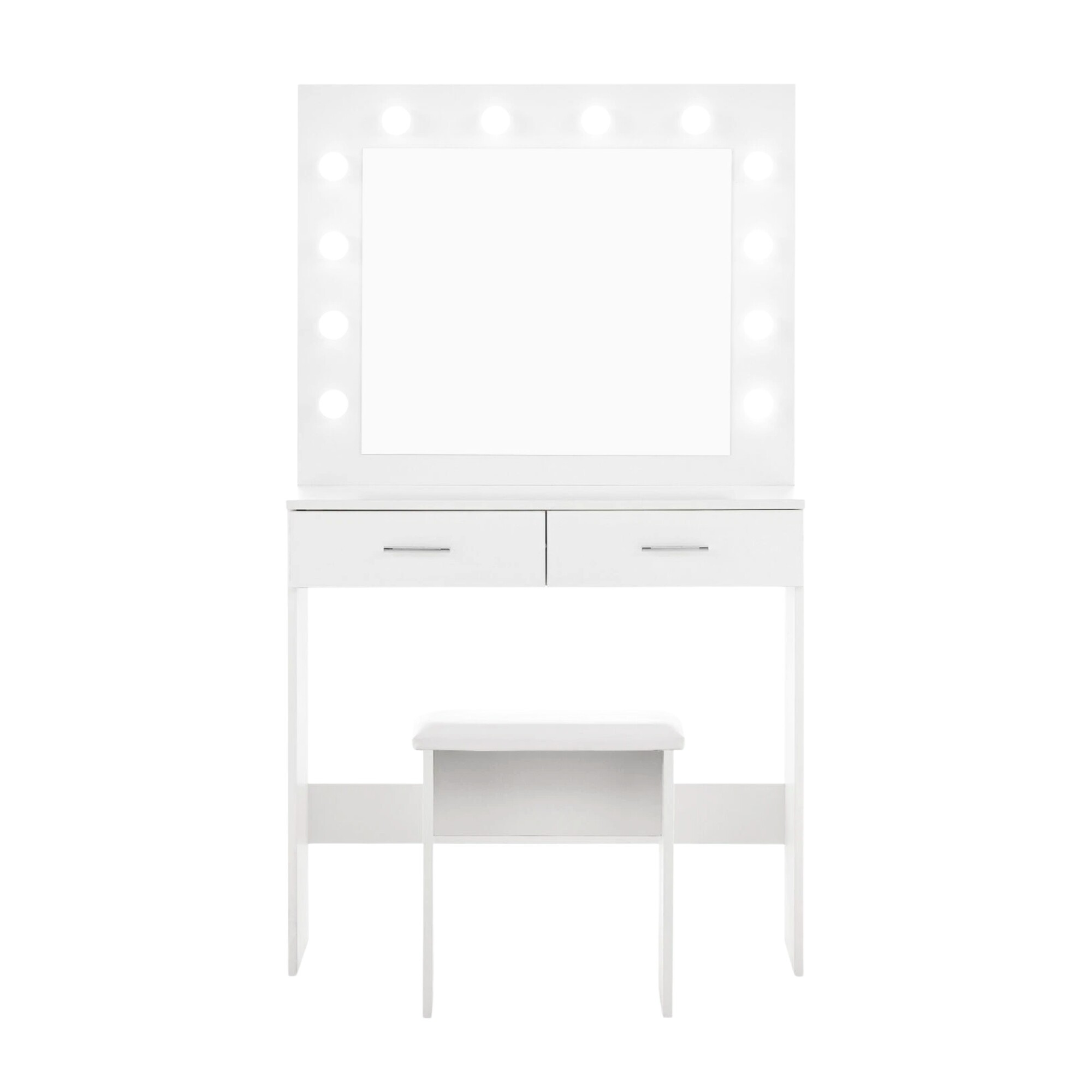 Na zrcadle je 12 LED žárovek, pohodlně se tedy nalíčíte i při špatném přirozeném světle. Taburet je vyrobený z vysoce kvalitní měkké a pěny, na které je možné sedět celé hodiny.
