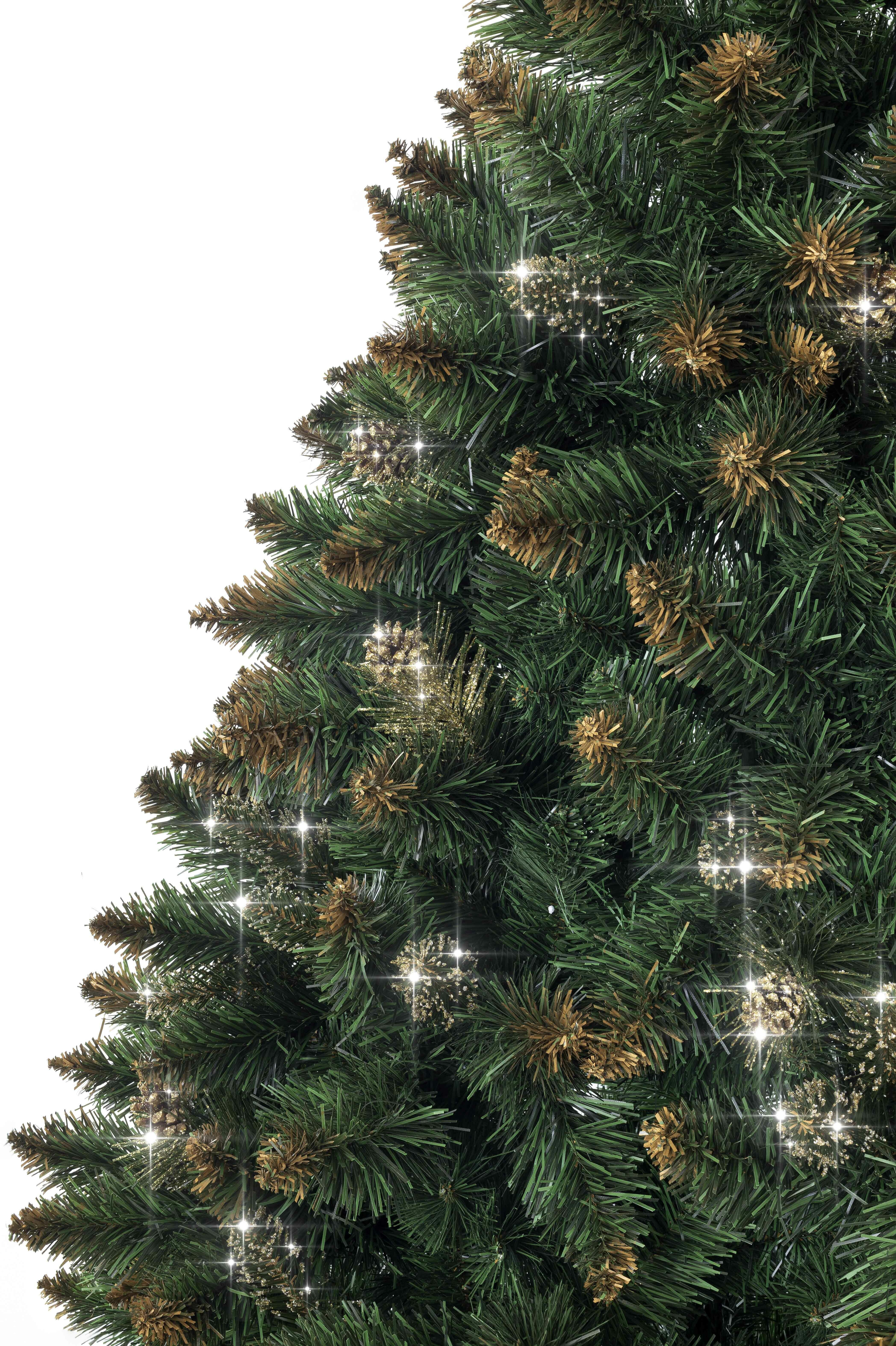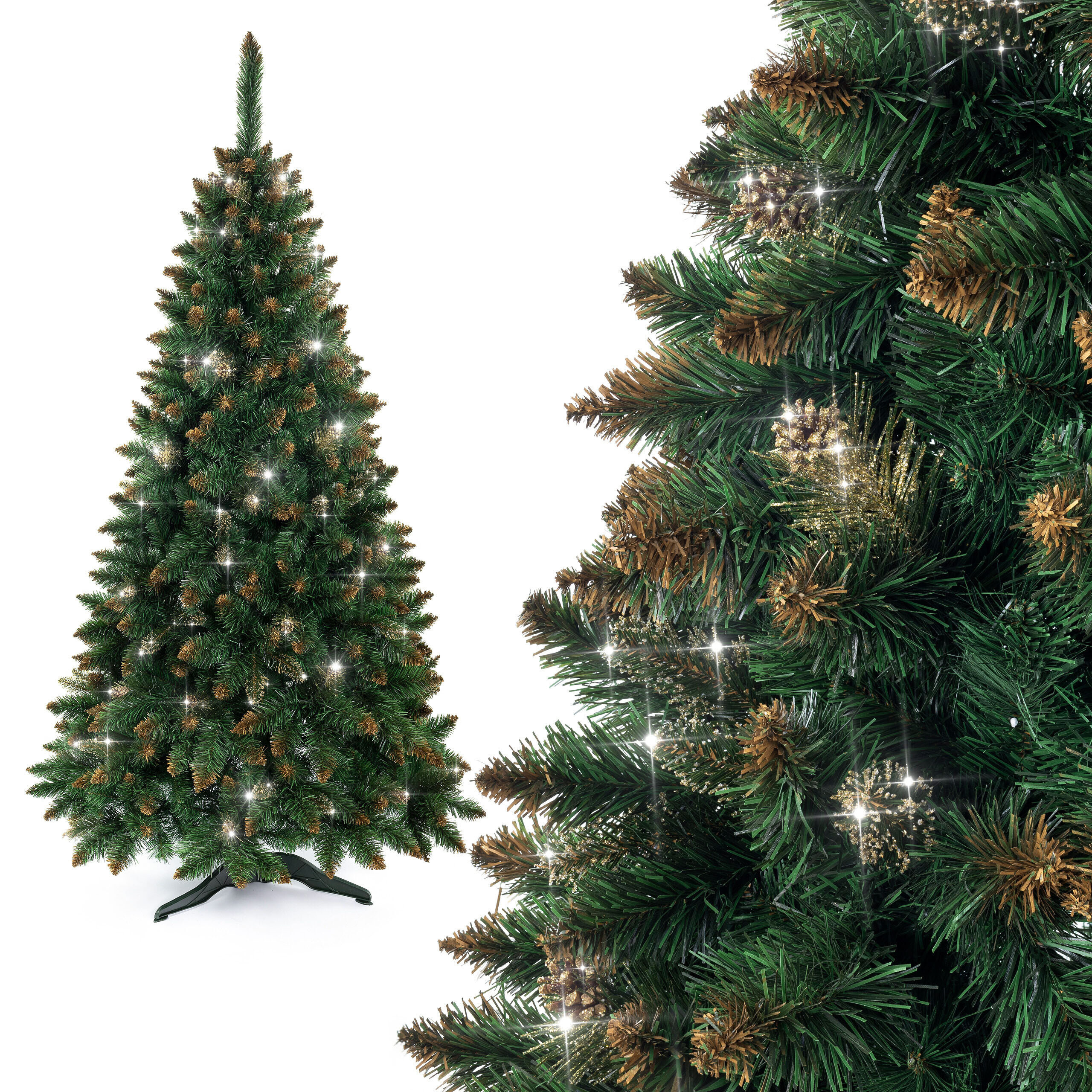 Luxusní umělý vánoční stromeček s celkovou výškou 180 cm v přírodním vzhledu krásné zelené husté borovice, která je ozdobena zlatými třpytkami.