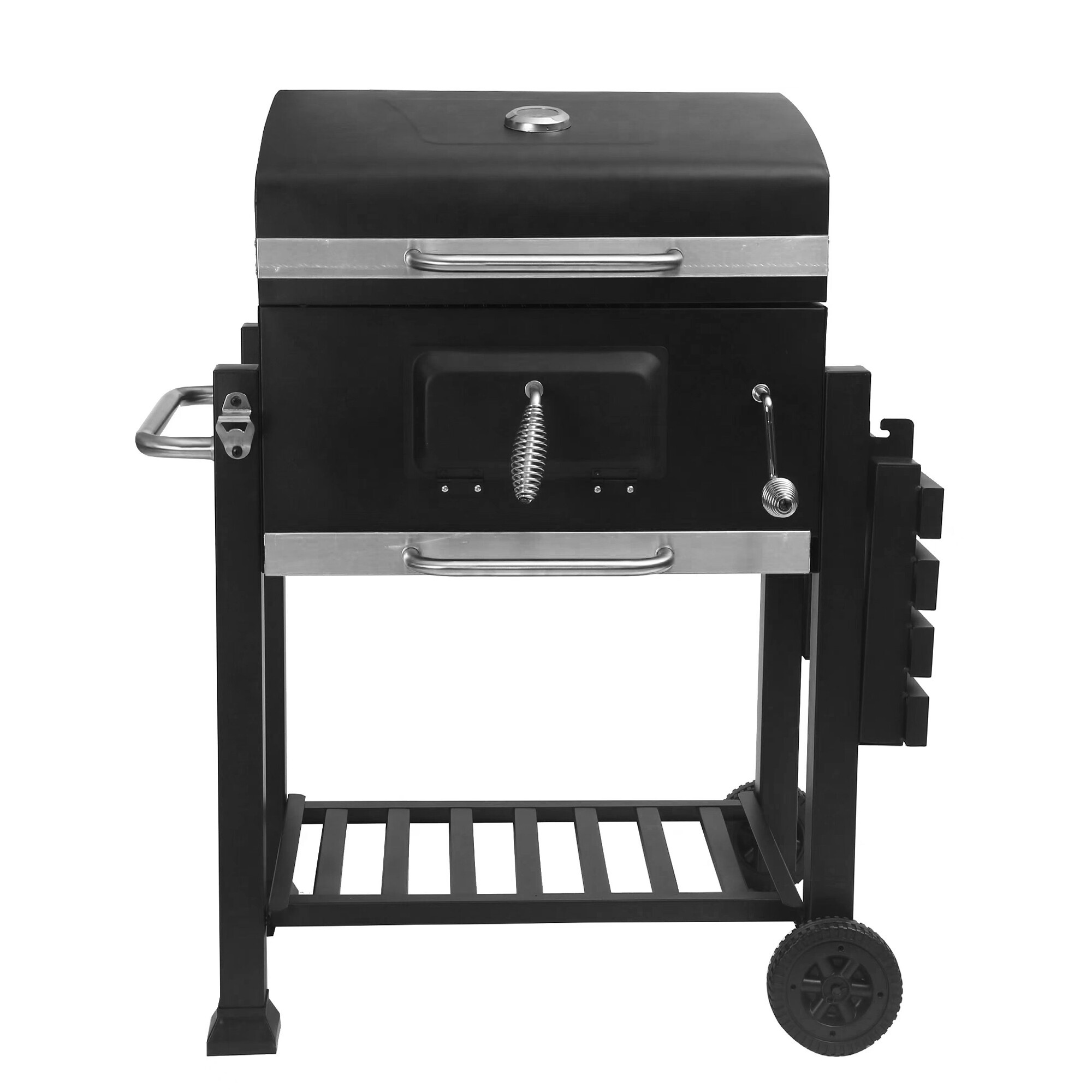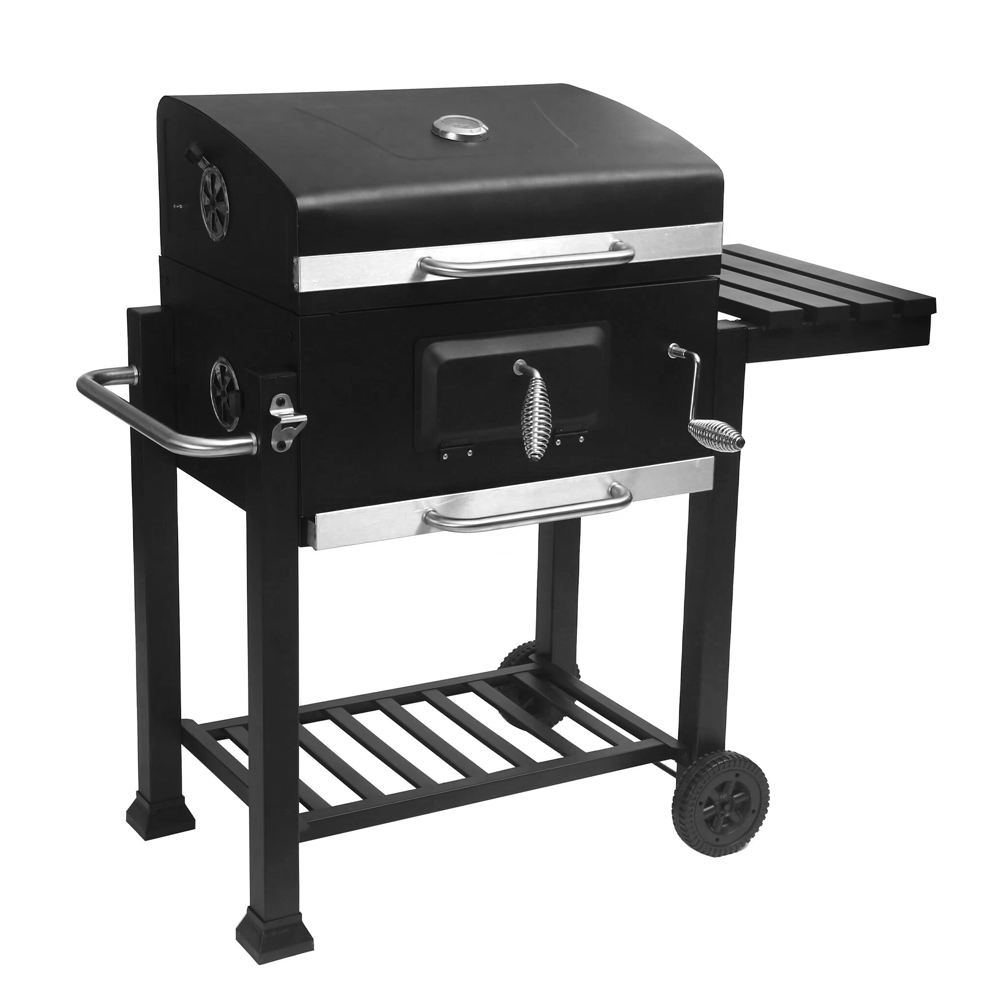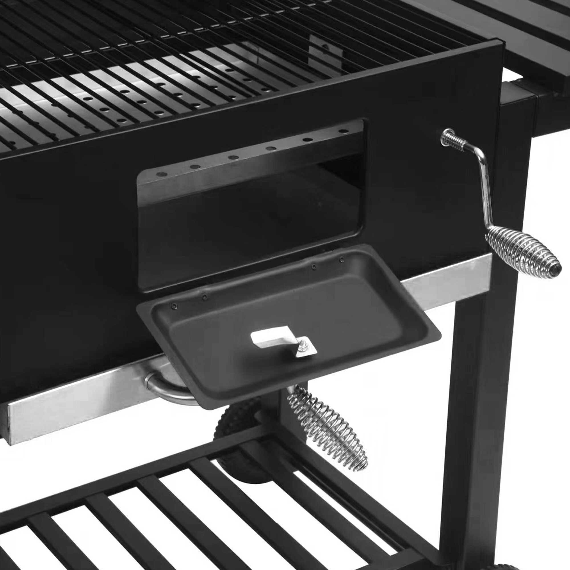 Speciální větrací otvory zajišťují vyváženou cirkulaci vzduchu během grilování a zabraňují vyhasnutí ohně. Pomocí kliky si snadno nastavíte výšku roštu, což vám umožní přesně regulovat intenzitu tepla.