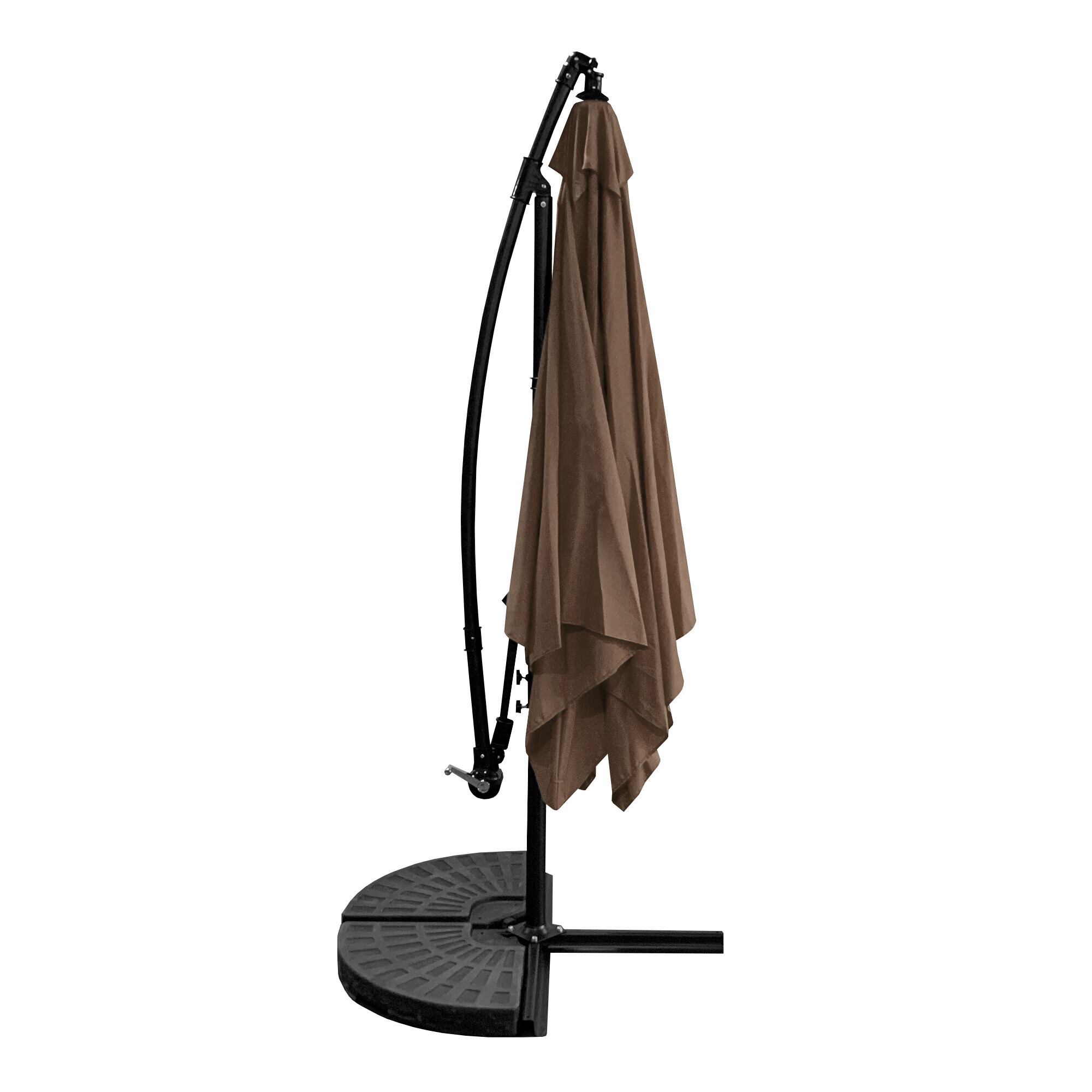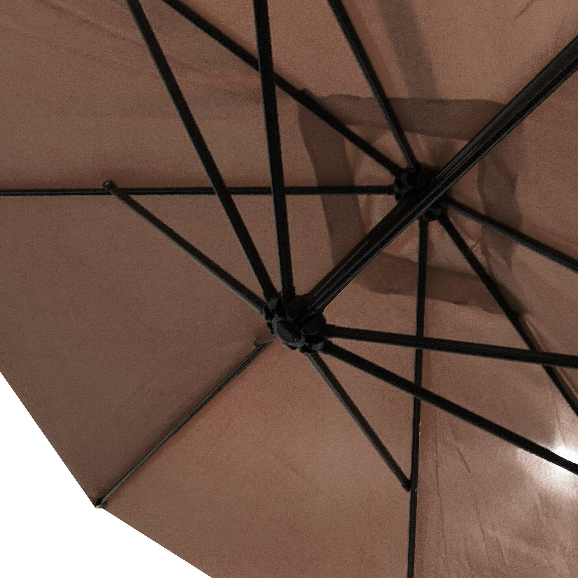 Praktický zahradní slunečník vyrobený z odolného polyesteru, jehož noha je umístěna mimo stíněnou plochu.