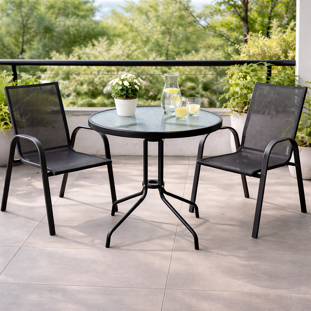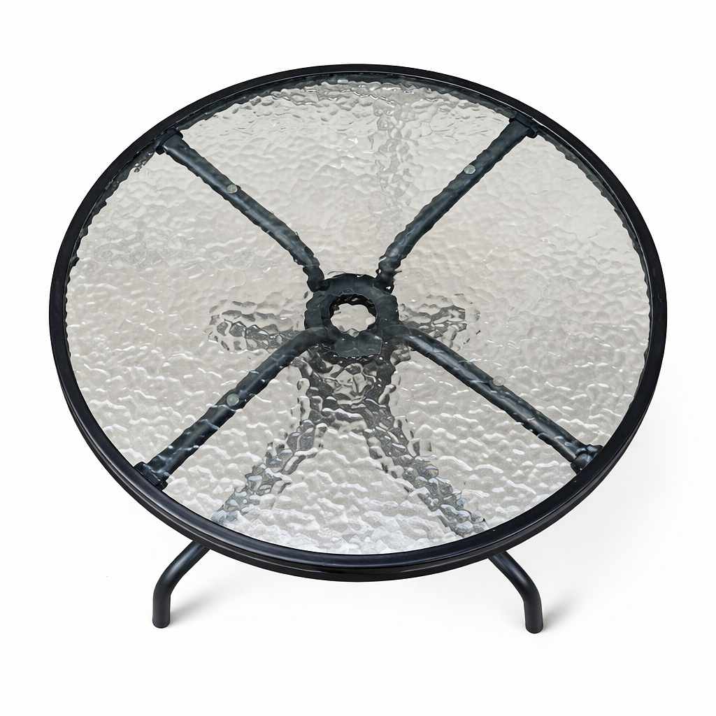 Kulatý zahradní stůl s pevným kovovým rámem a texturovanou skleněnou deskou, vhodný pro zahrady, terasy, kavárny, altánky, balkóny.
