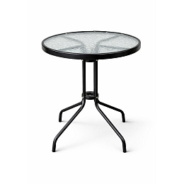 Kulatý zahradní stůl s pevným kovovým rámem a texturovanou skleněnou deskou, vhodný pro zahrady, terasy, kavárny, altánky, balkóny. Celý popis