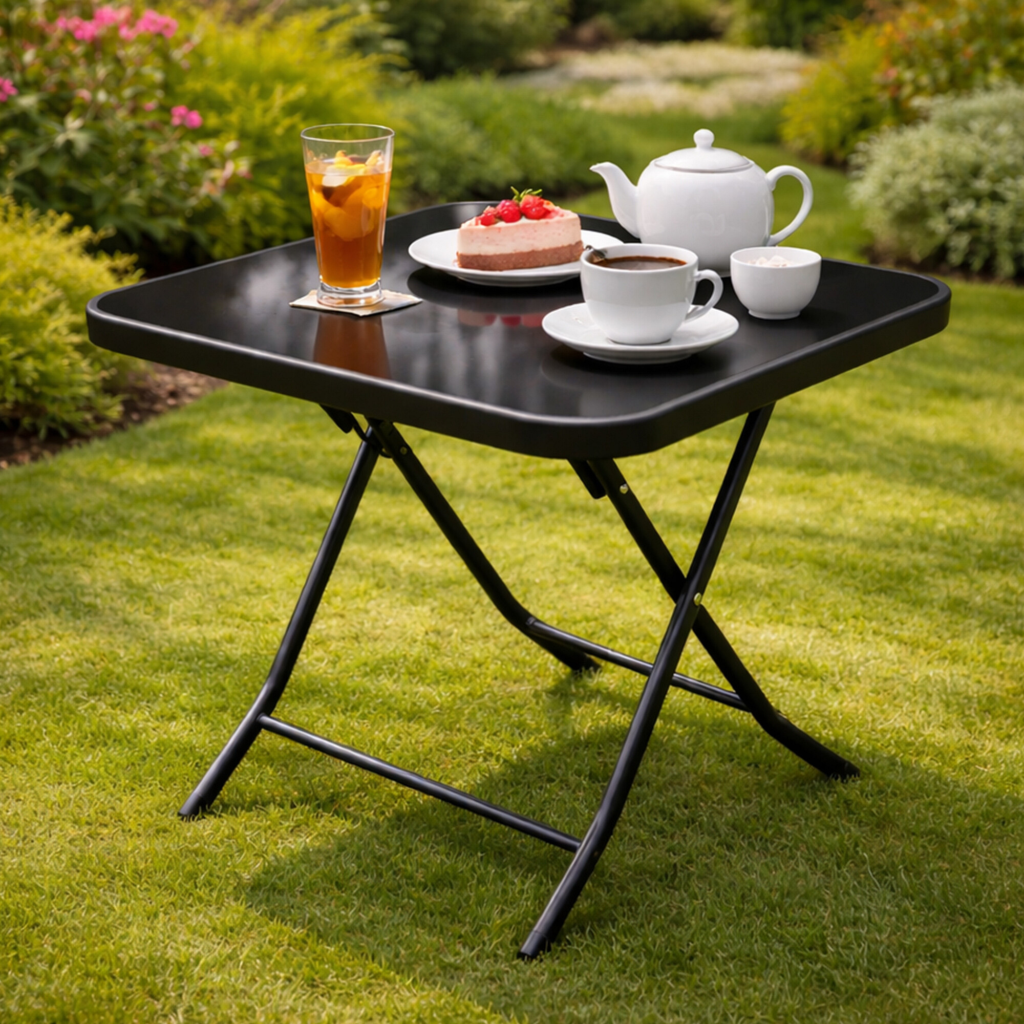 Zahradní stůl s pevným kovovým rámem a skleněnou deskou, vhodný pro zahrady, terasy, kavárny, altánky, balkóny.