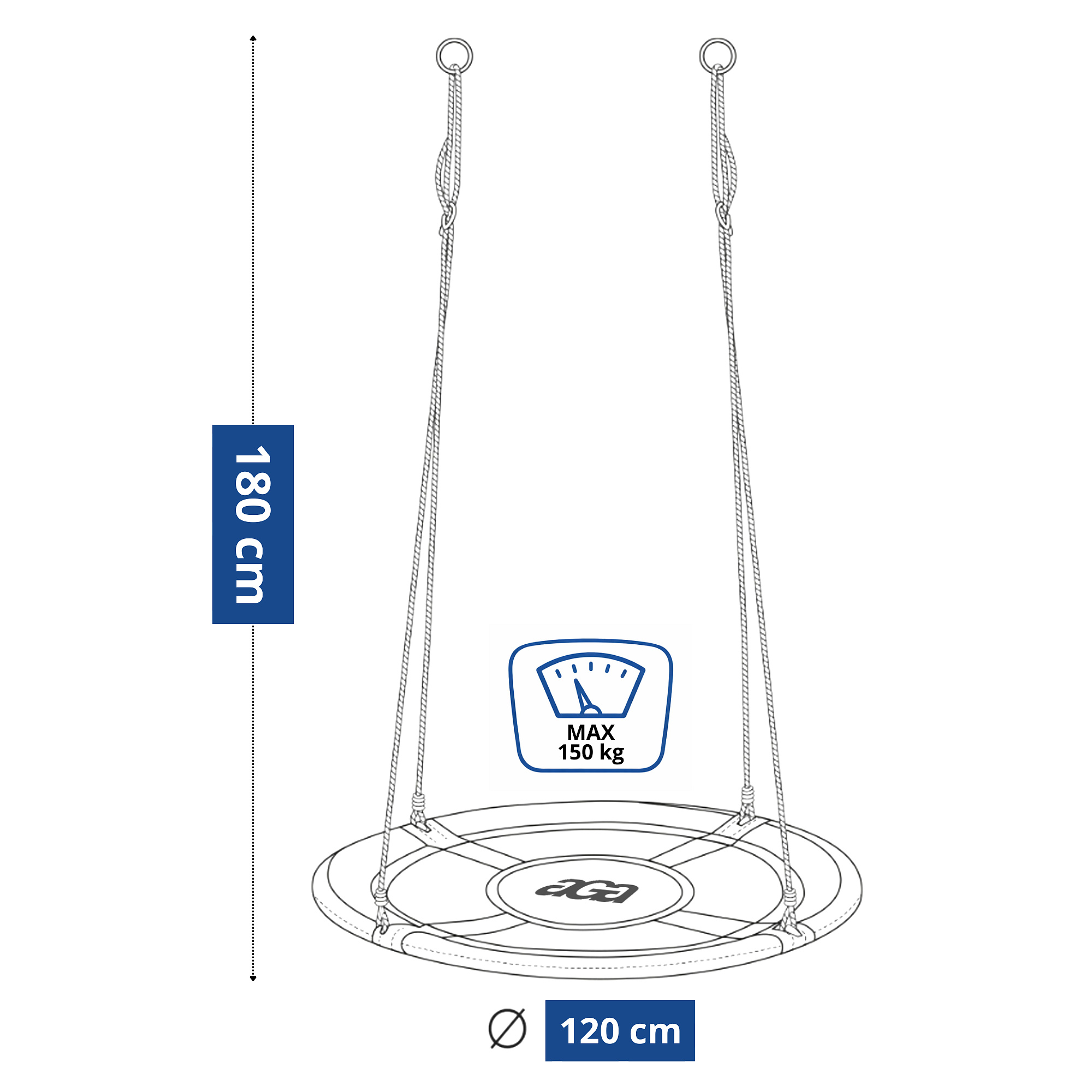 Houpací kruh s průměrem 120 cm je dostatečně velký na to, aby se mohly houpat i dvě děti najednou. Nosnost kruhu je 150 kg.