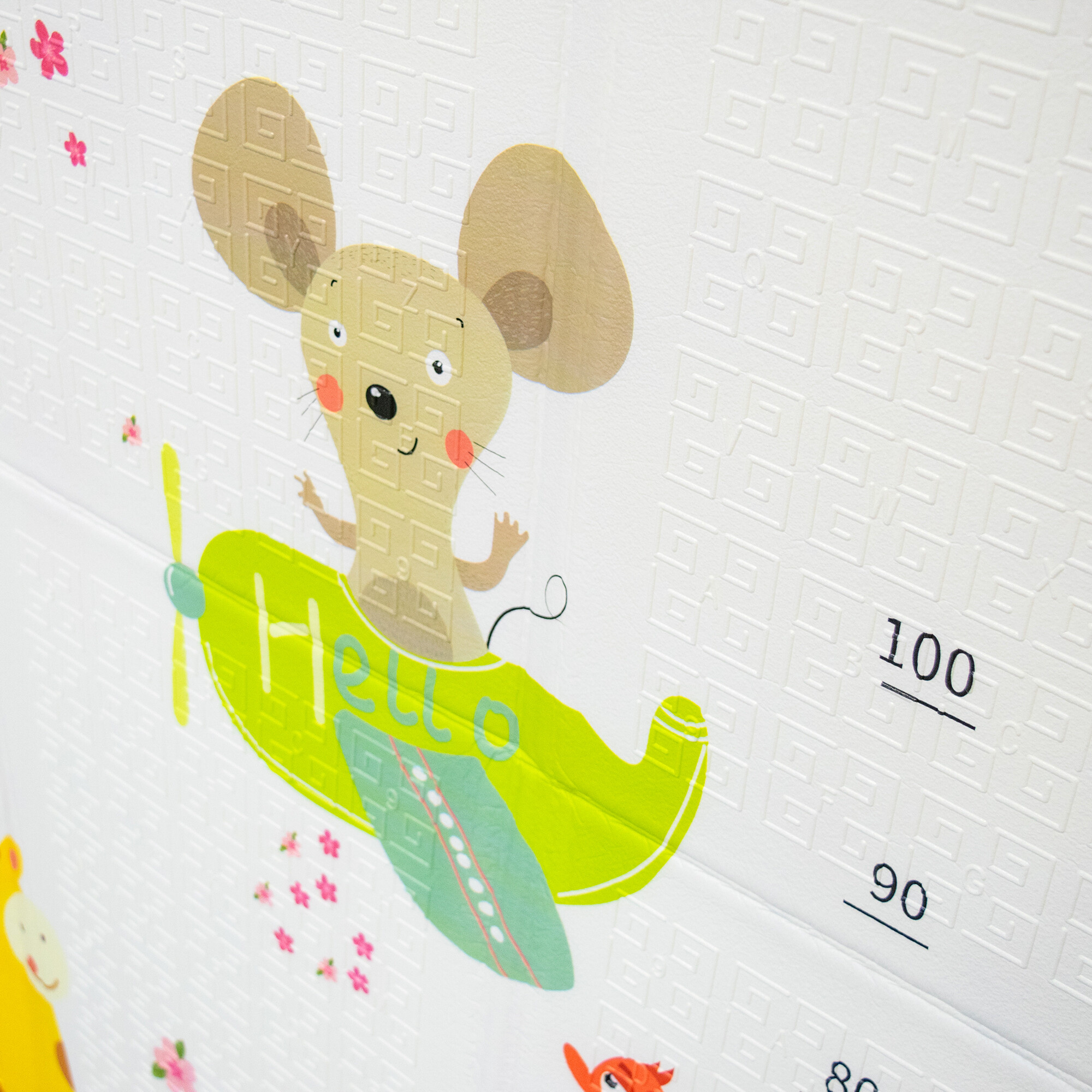 Protiskluzový povrch pomáhá udržet podložku stabilně na místě i při aktivnější hře, zatímco oboustranný potisk s dětskými motivy podporuje zrakové vnímání, orientaci a přirozenou zvídavost dítěte.