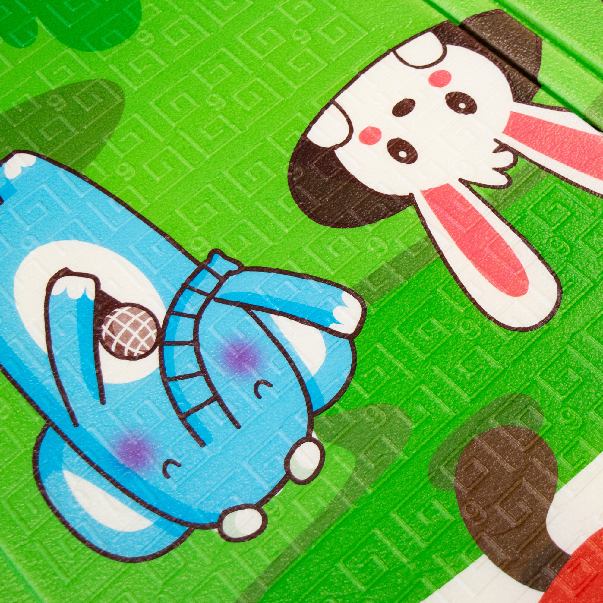 Protiskluzový povrch pomáhá udržet podložku stabilně na místě i při aktivnější hře, zatímco oboustranný potisk s dětskými motivy podporuje zrakové vnímání, orientaci a přirozenou zvídavost dítěte.