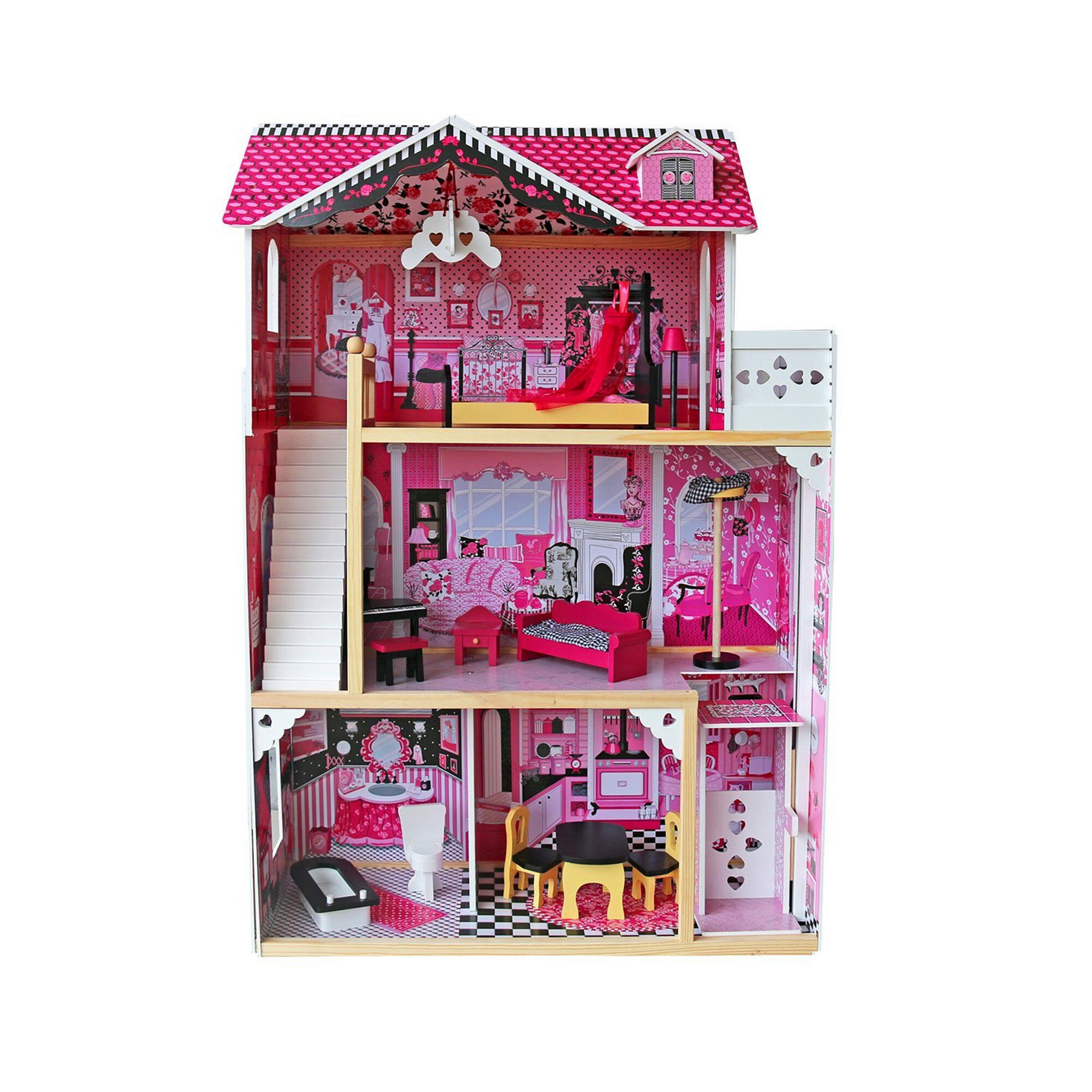 Domeček je přizpůsobený pro všechny velikosti módních panenek až do výšky 30 cm včetně panenek Barbie a Monster High.