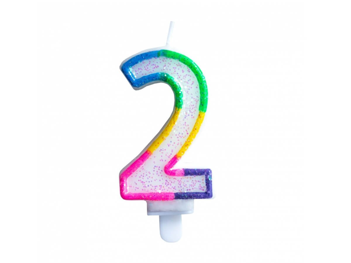 Třpytivá svíčka číslo "2" s duhovým okrajem je dokonalá dekorace dortu.