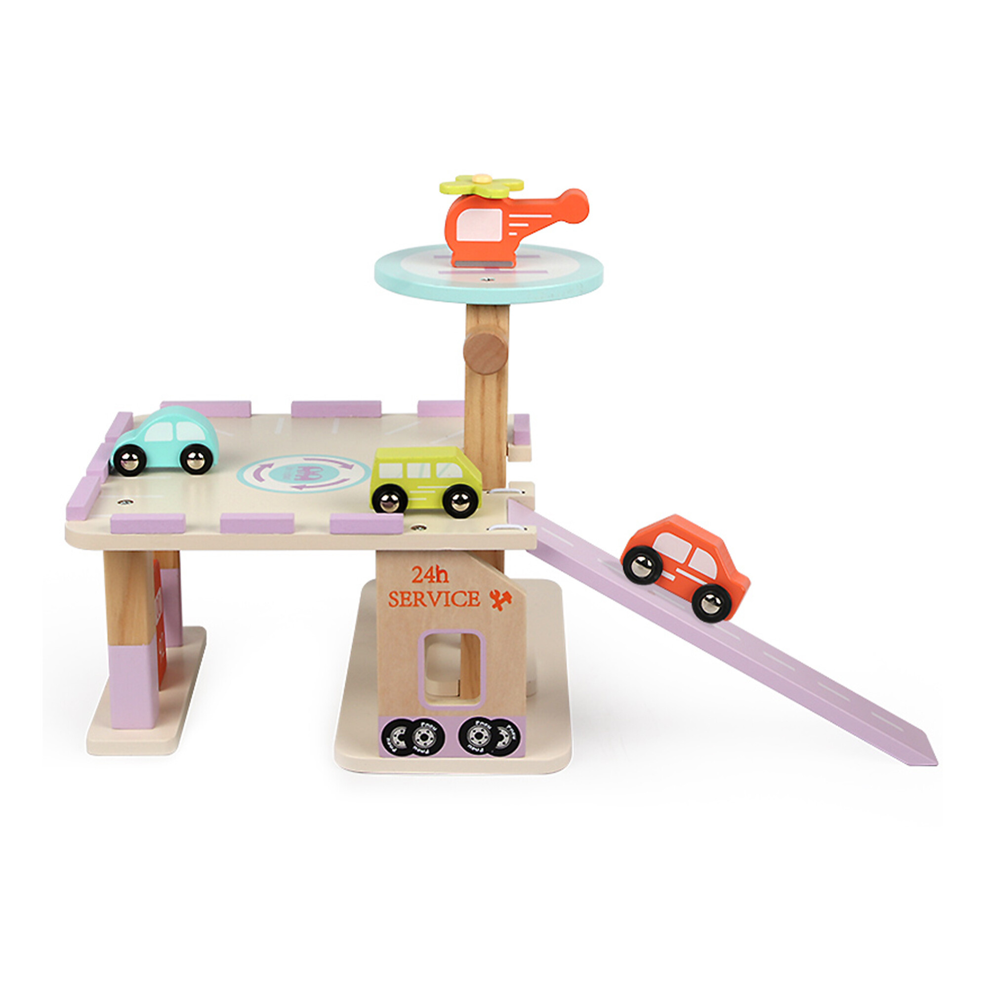 V sadě naleznete také 3 autíčka, helikoptéru a čerpací stanici.