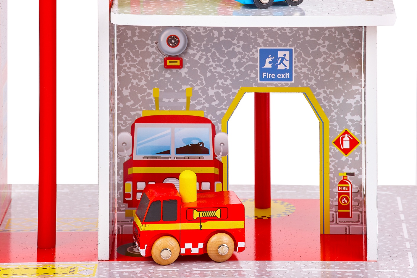 - Hrací set má tři patra propojená požární tyčí