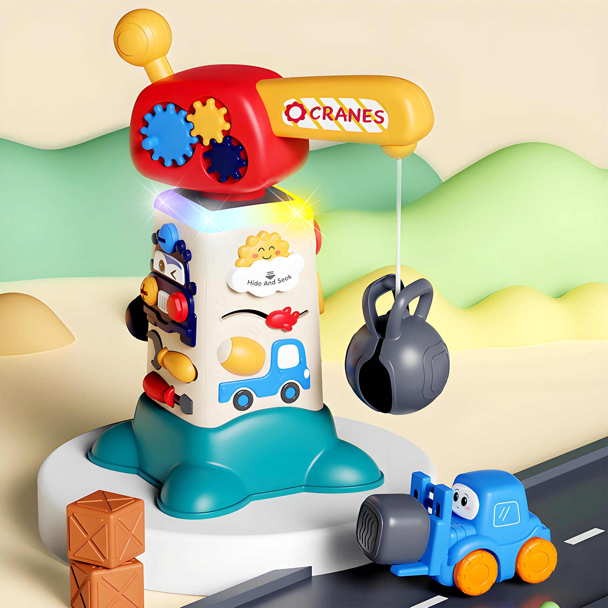 Interaktivní jeřáb je vybaven mnoha funkcemi, které podporují rozvoj dětí. Každá ze čtyř stran jeřábu nabízí jedinečné aktivity, které stimulují různé smysly a dovednosti.