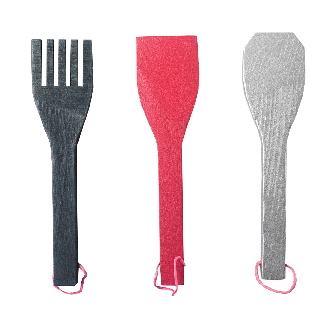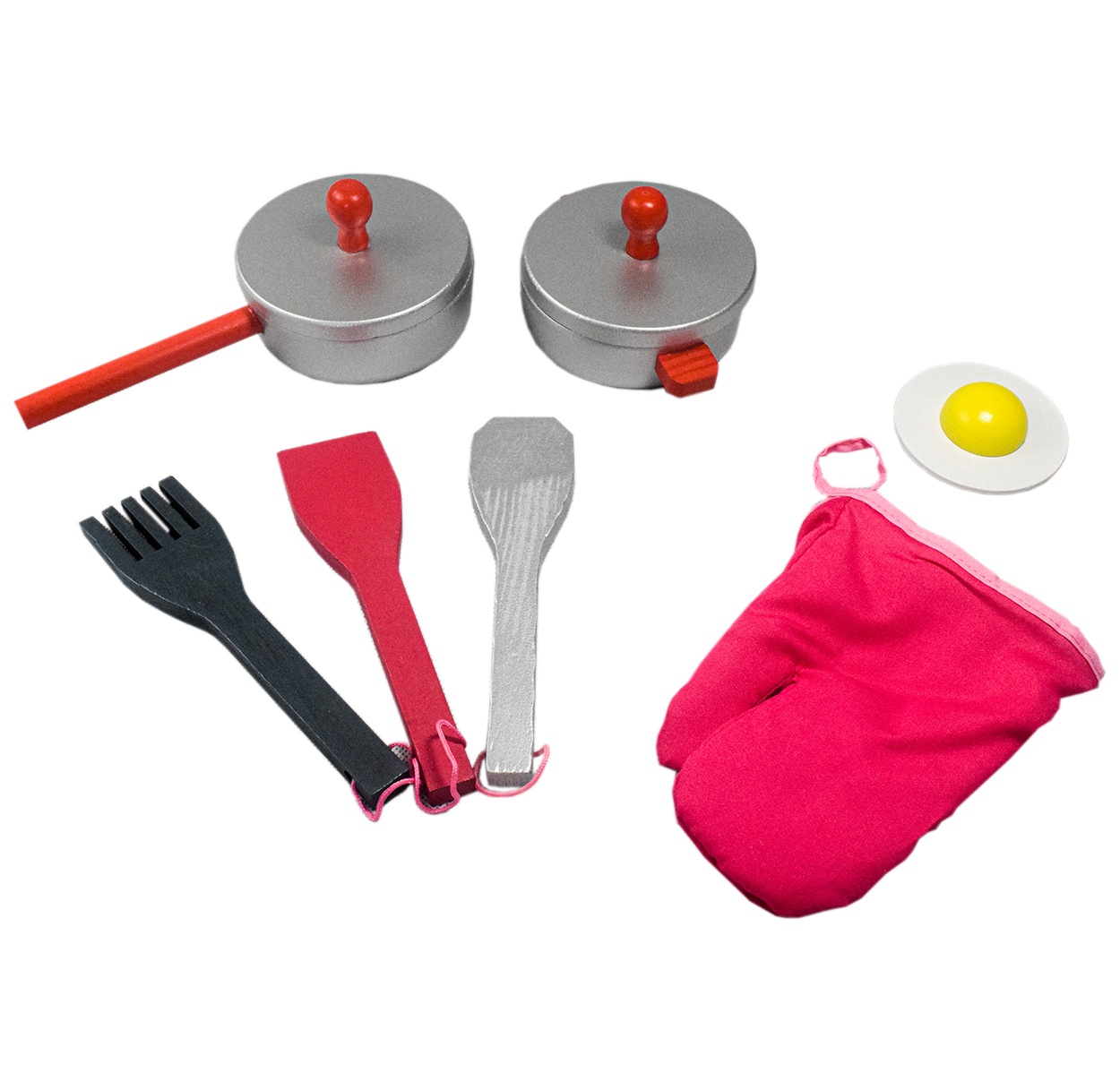 Dětské dřevěné nádobí COOKWARE SET 7, obsahuje dva hrnce, dvě obracečky, vidličku a chňapku.