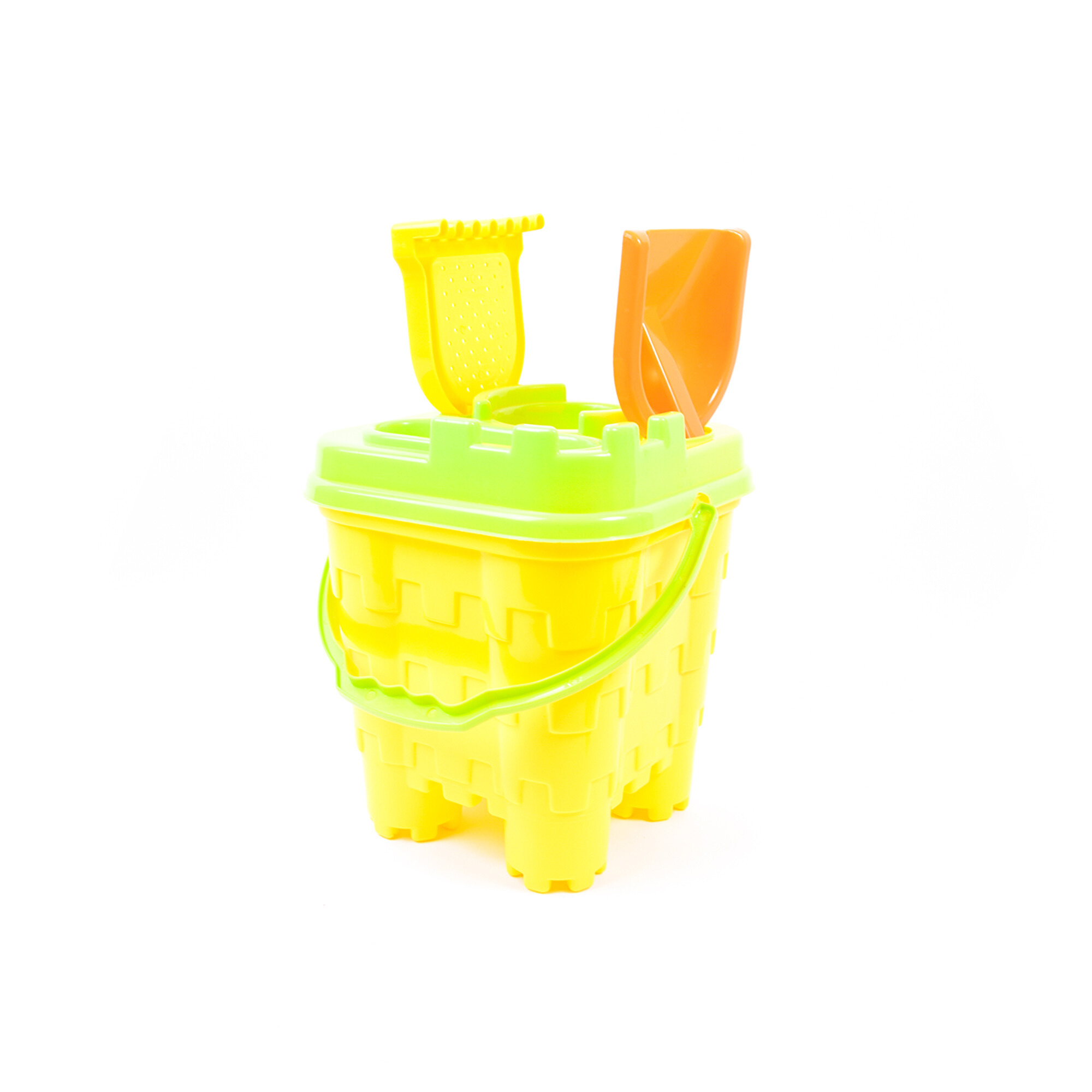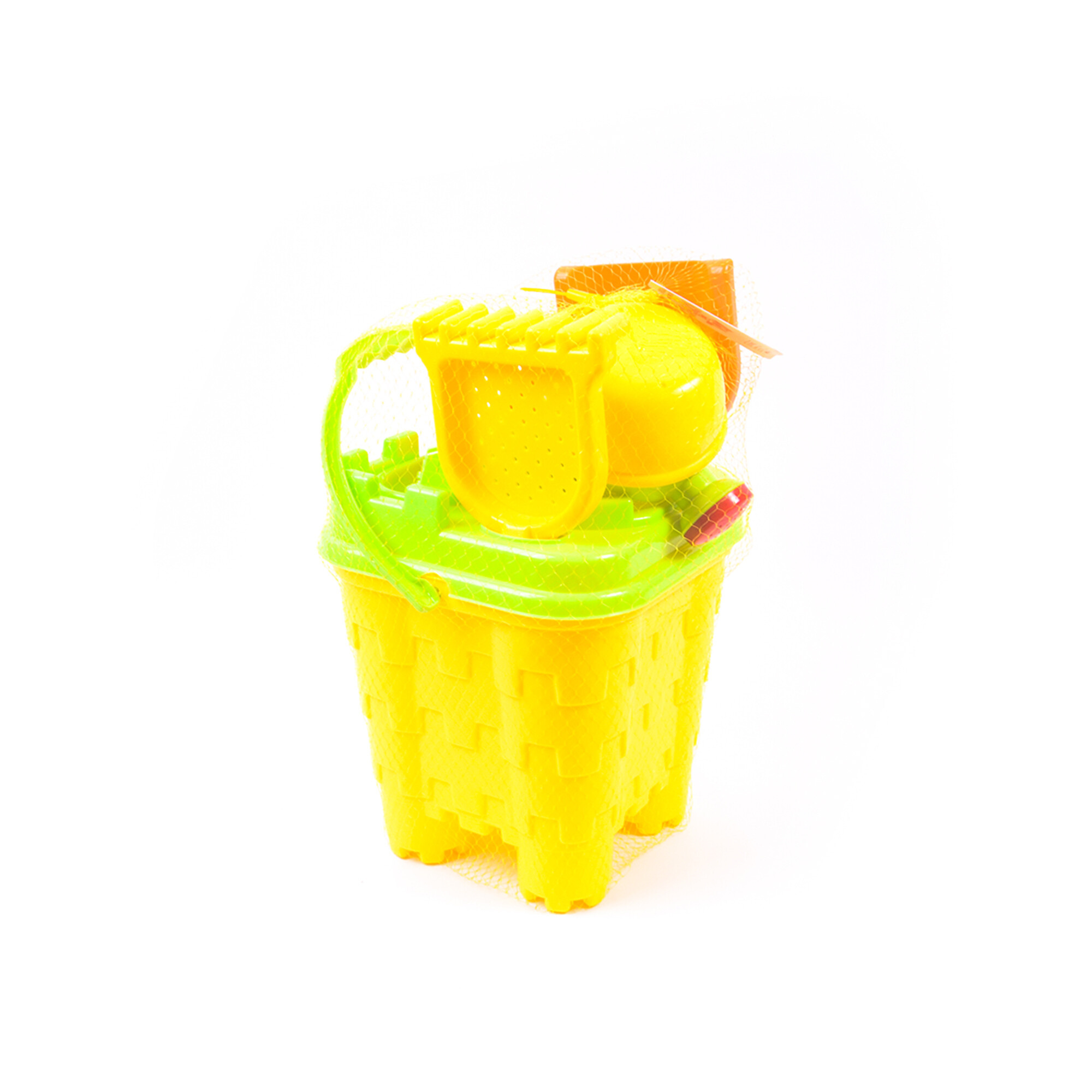 Sada obsahuje: Sítko, lopatku, hrábě, kyblík, konvičku a bábovičky.
