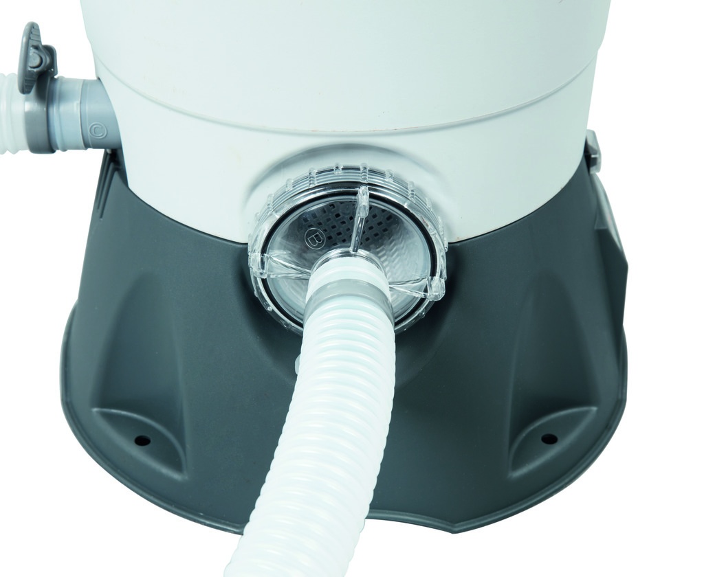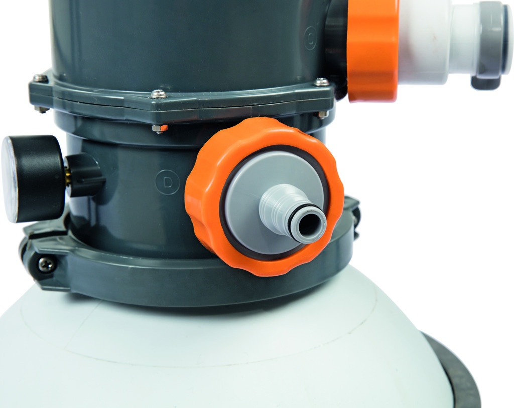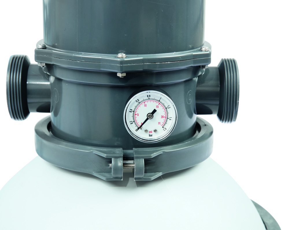 Pískové filtrační zařízení od firmy Bestway se skládá z plastové podstavy, polypropylenové filtrační nádoby s vrchním 6 cestným ventilem, manometru a čerpadla s předfiltrem hrubých nečistot.