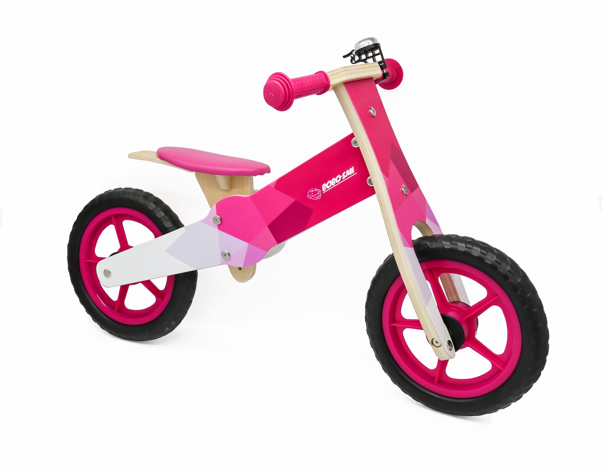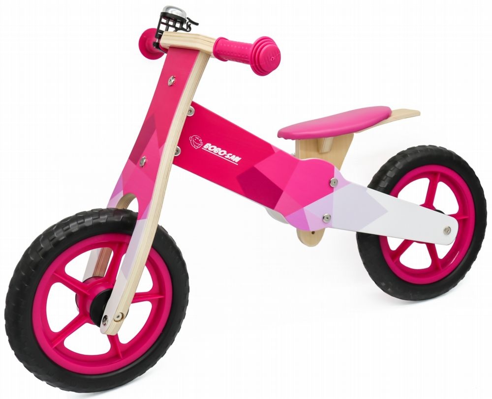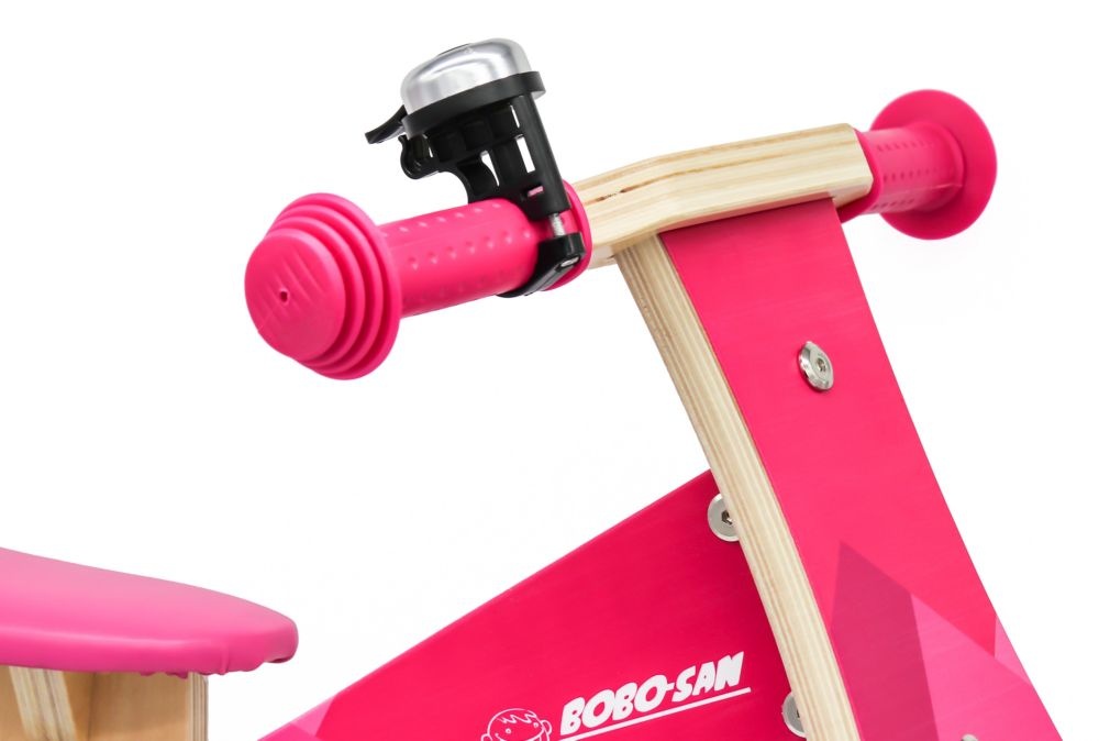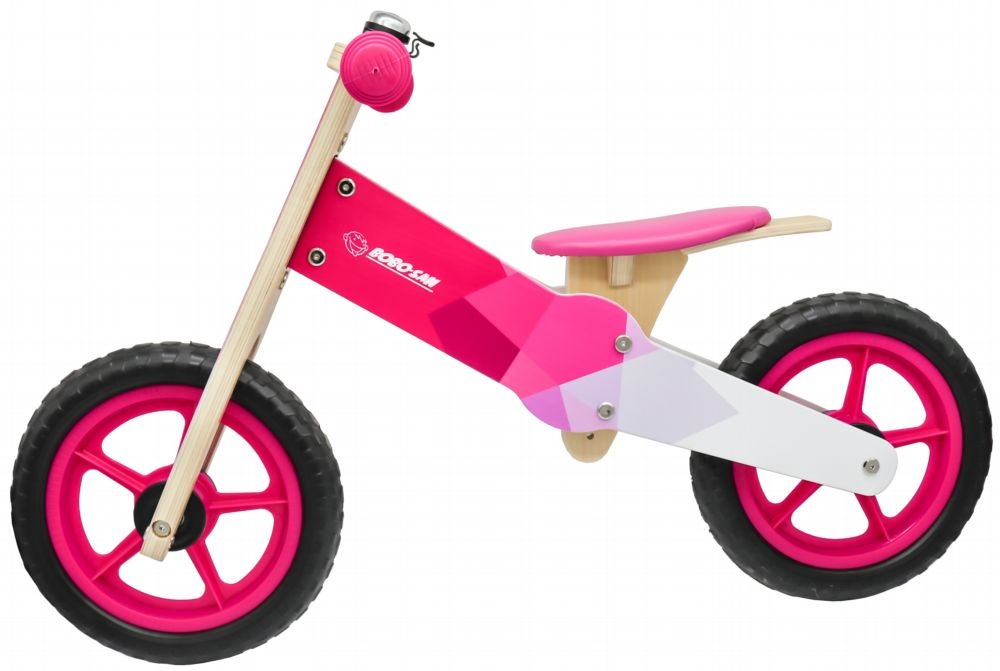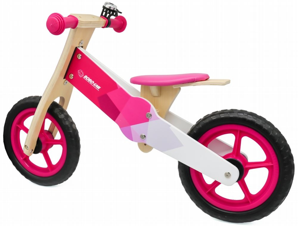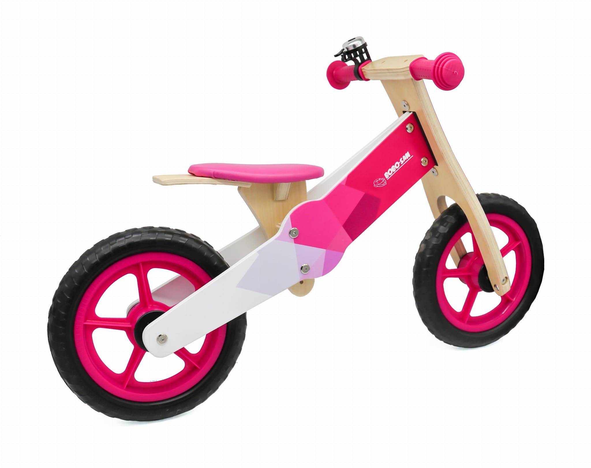 Dětské dřevěné odrážedlo, se zatáčecími řídítky, ergonomicky tvarovaným a výškově nastavitelným sedátkem.