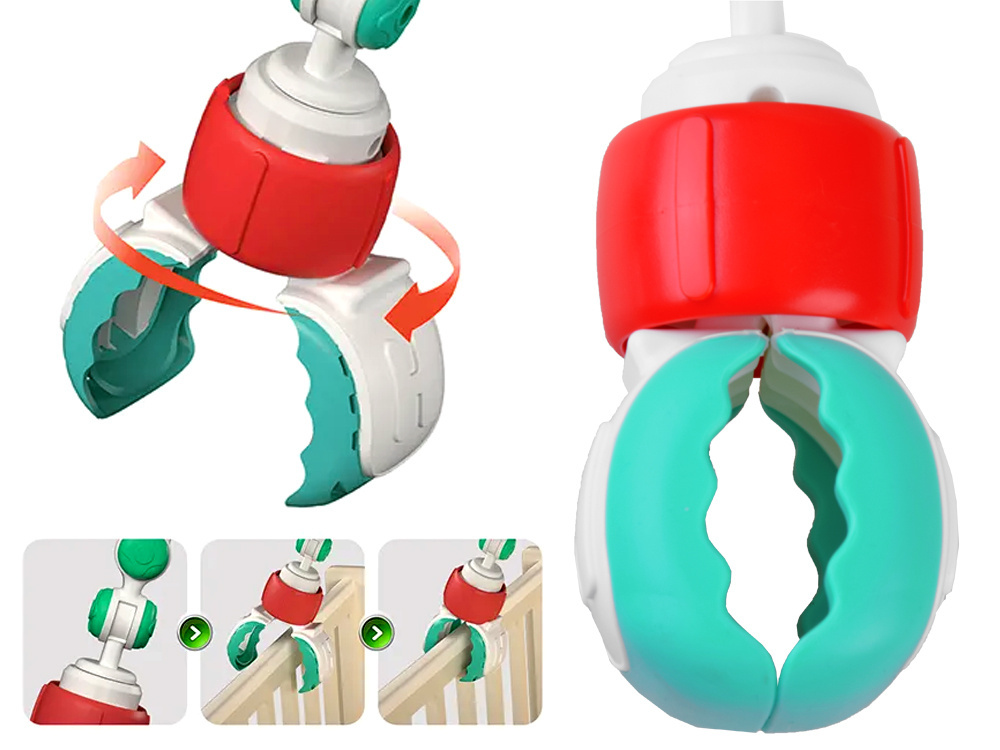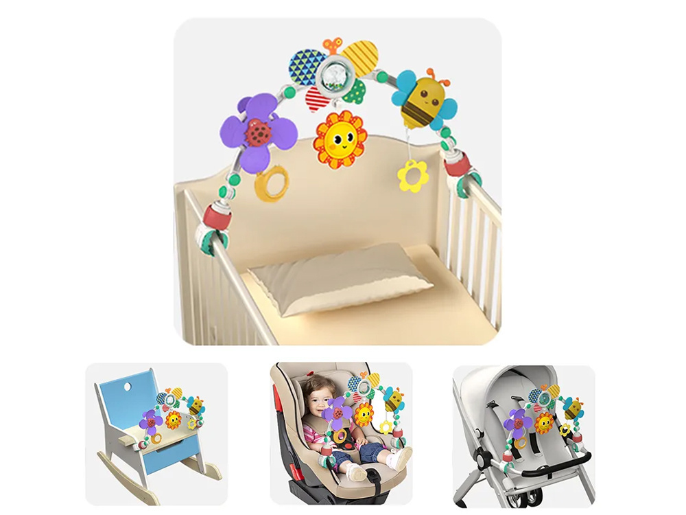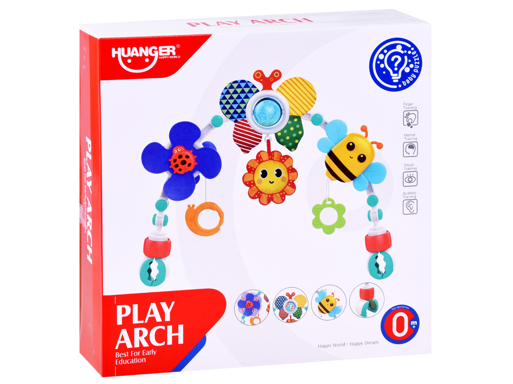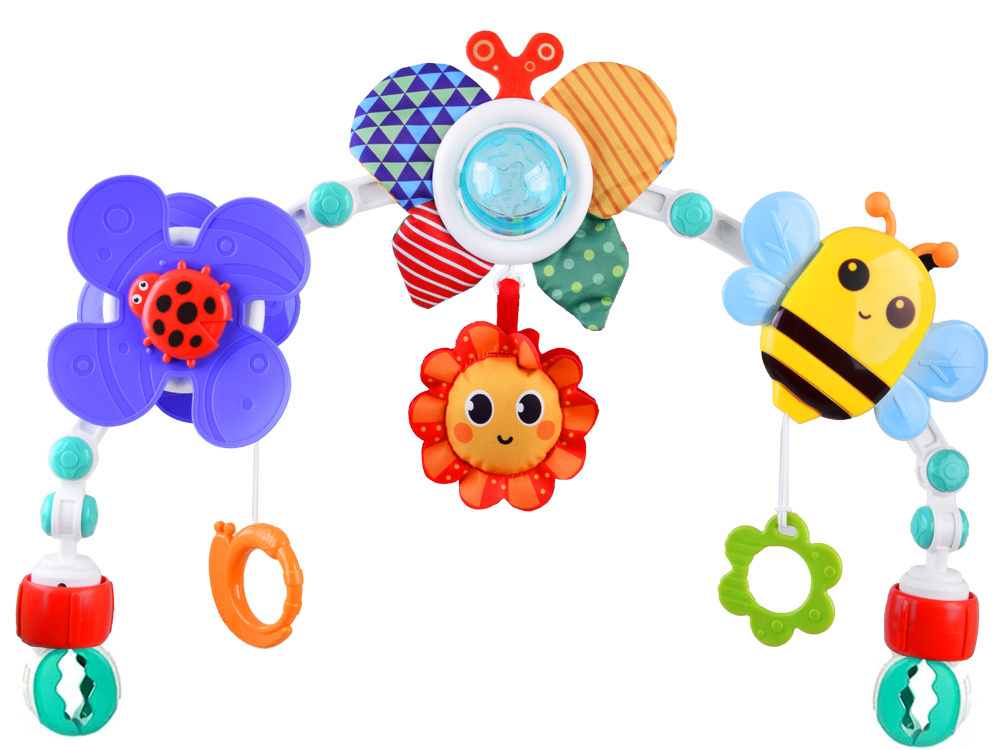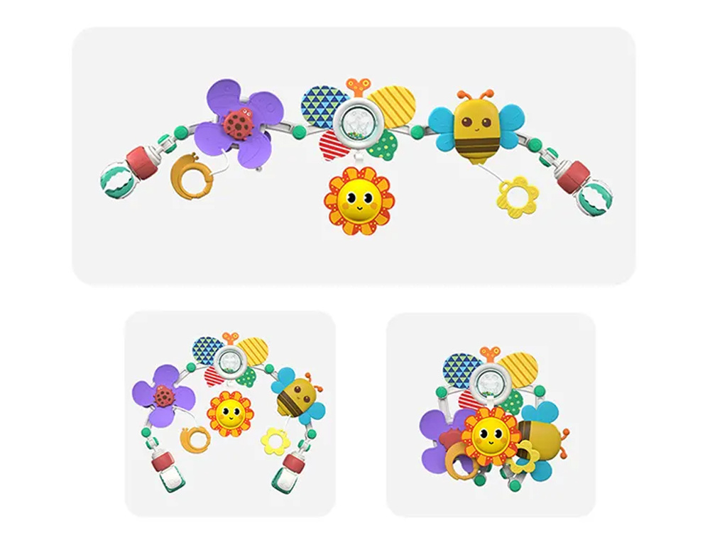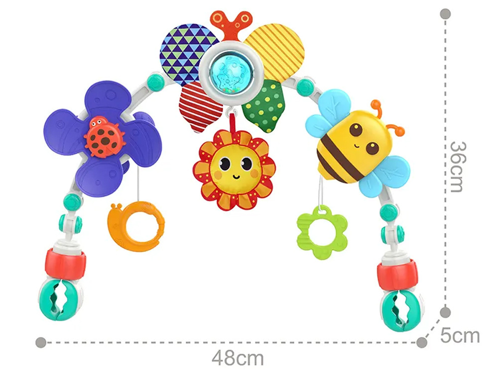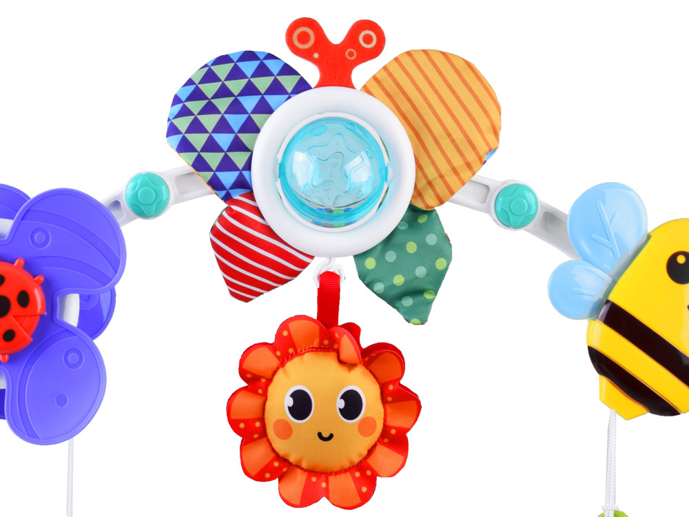 Barevný nánožník na kočárky, autosedačky a lehátka je skvělou volbou pro každé miminko.Hračka se velmi snadno sestavuje a její nastavitelný úhel umožňuje přizpůsobit ji potřebám každého dítěte.Čelenka, ke které jsou připevněny barevné hračky, podporuje uchopování a natahování rukou, rozvíjí schopnost soustředění dítěte a formuje jeho představivost.Hračky zavěšené na oblouku umožní každému batoleti rozvíjet hrubou motoriku, jemnou motoriku a smysly. Při hře se dítě učí rozlišovat tvary a barvy.