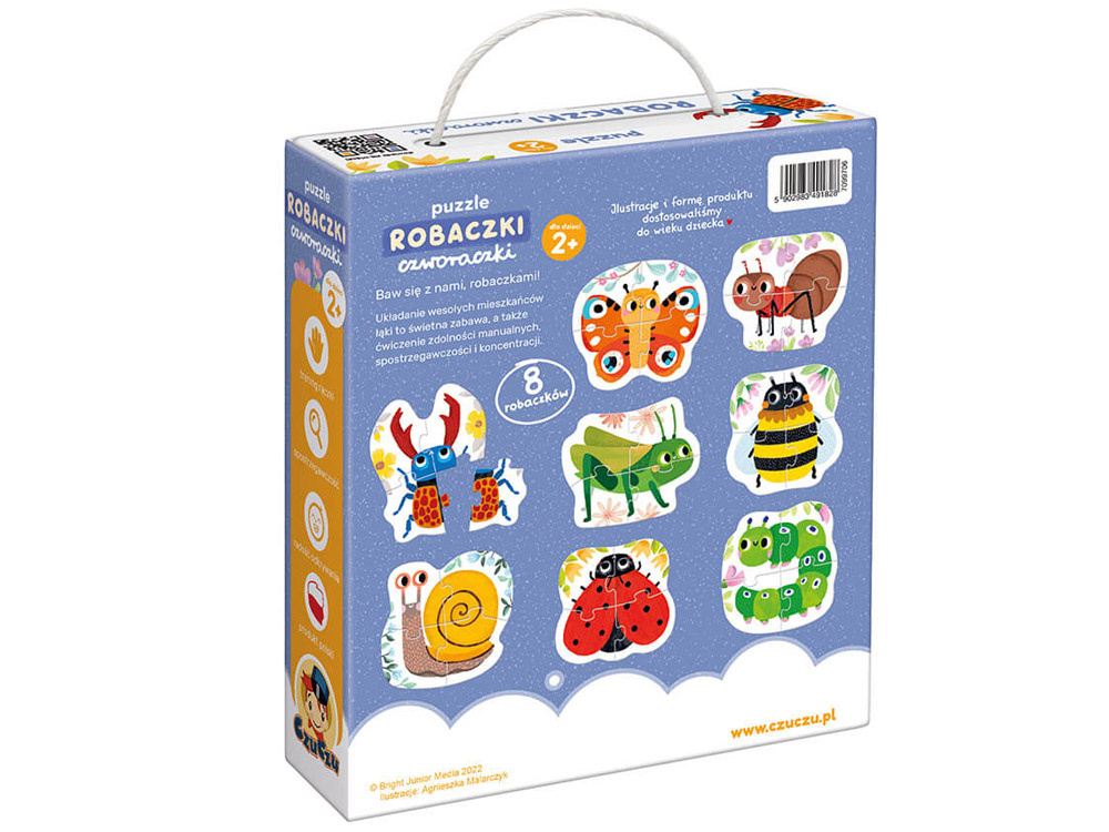 CzuCzu Puzzle Červíci čtyři je první jednoduché čtyřdílné puzzle pro batolata. Uspořádání veselých obyvatel louky je skvělá zábava a zároveň procvičuje manuální zručnost, postřeh a soustředění.