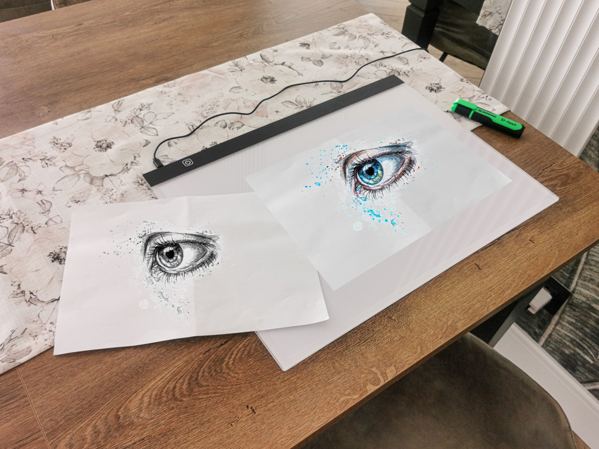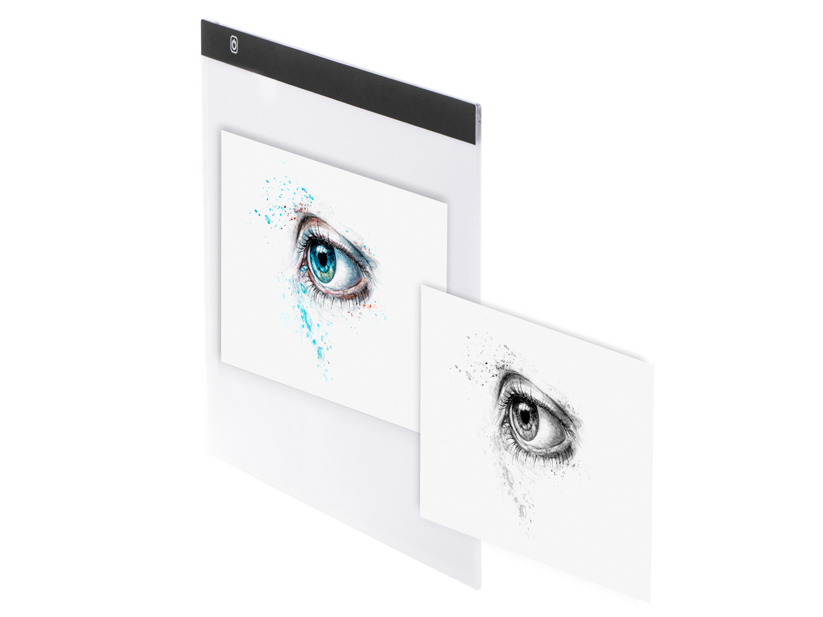 Umístěte výkres, který chcete kopírovat, na tabuli a pak na něj položte prázdný list papíru. Pro jistotu můžete obě karty připevnit k desce pomocí klipu (není součástí balení). Zapněte podsvícení a nastavte ho podle tloušťky karet. Nyní můžete původní návrh snadno překreslit.